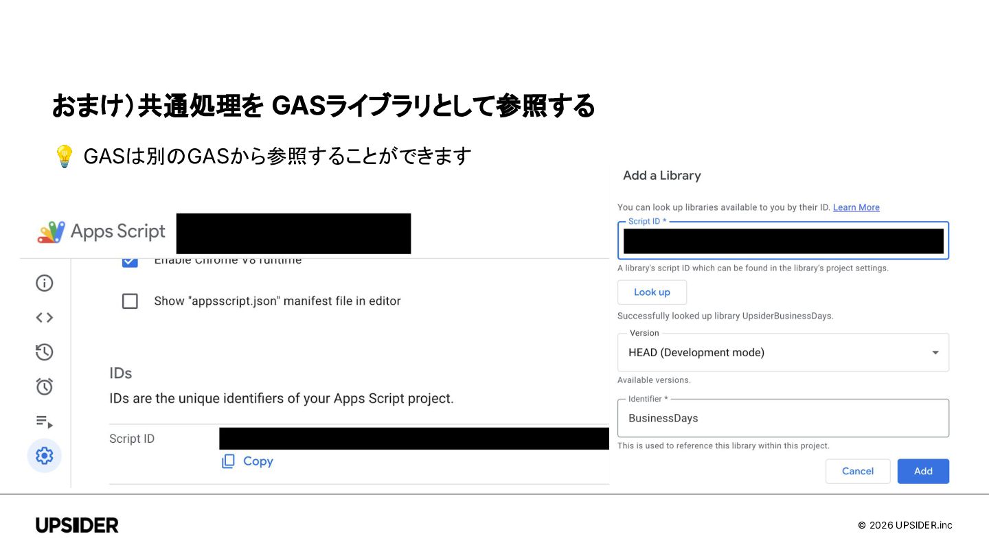 © 2026 UPSIDER.inc おまけ)共通処理を GASライブラリとして参照する 💡 GASは別のGASから参照することができます