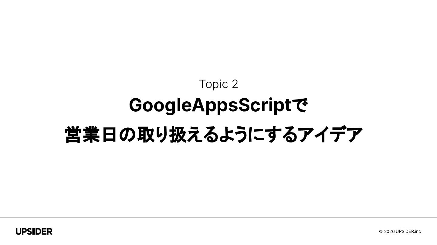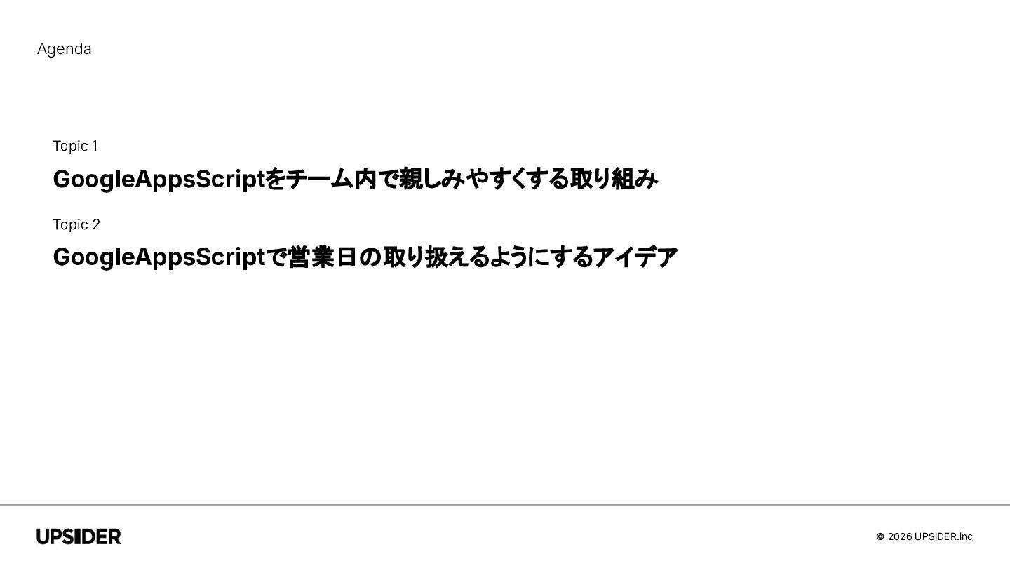 © 2026 UPSIDER.inc Agenda Topic 1 GoogleAppsScriptをチーム内で親しみやすくする取り組み Topic 2 GoogleAppsScriptで営業日の取り扱えるようにするアイデア