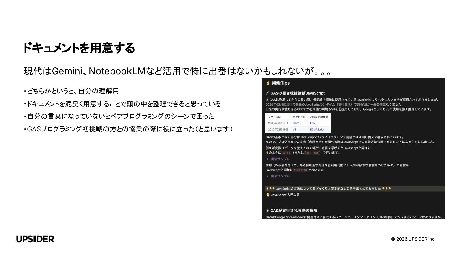 © 2026 UPSIDER.inc ドキュメントを用意する 現代はGemini、NotebookLMなど活用で特に出番はないかもしれないが。。。 ・どちらかというと、自分の理解用 ・ドキュメントを泥臭く用意することで頭の中を整理できると思っている ・自分の言葉になっていないとペアプログラミングのシーンで困った ・GASプログラミング初挑戦の方との協業の際に役に立った(と思います)