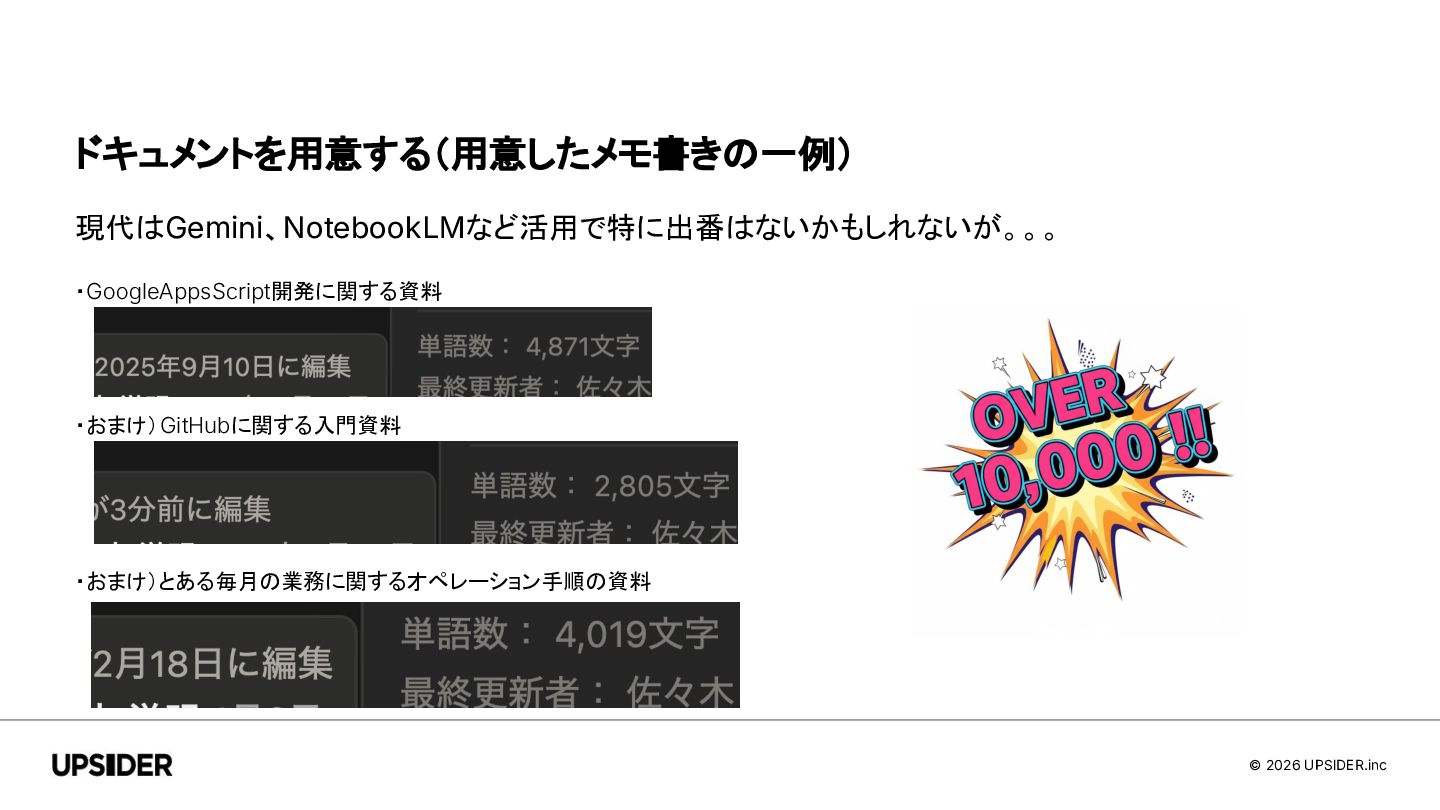 © 2026 UPSIDER.inc ドキュメントを用意する(用意したメモ書きの一例) 現代はGemini、NotebookLMなど活用で特に出番はないかもしれないが。。。 ・GoogleAppsScript開発に関する資料 ・おまけ)GitHubに関する入門資料 ・おまけ)とある毎月の業務に関するオペレーション手順の資料
