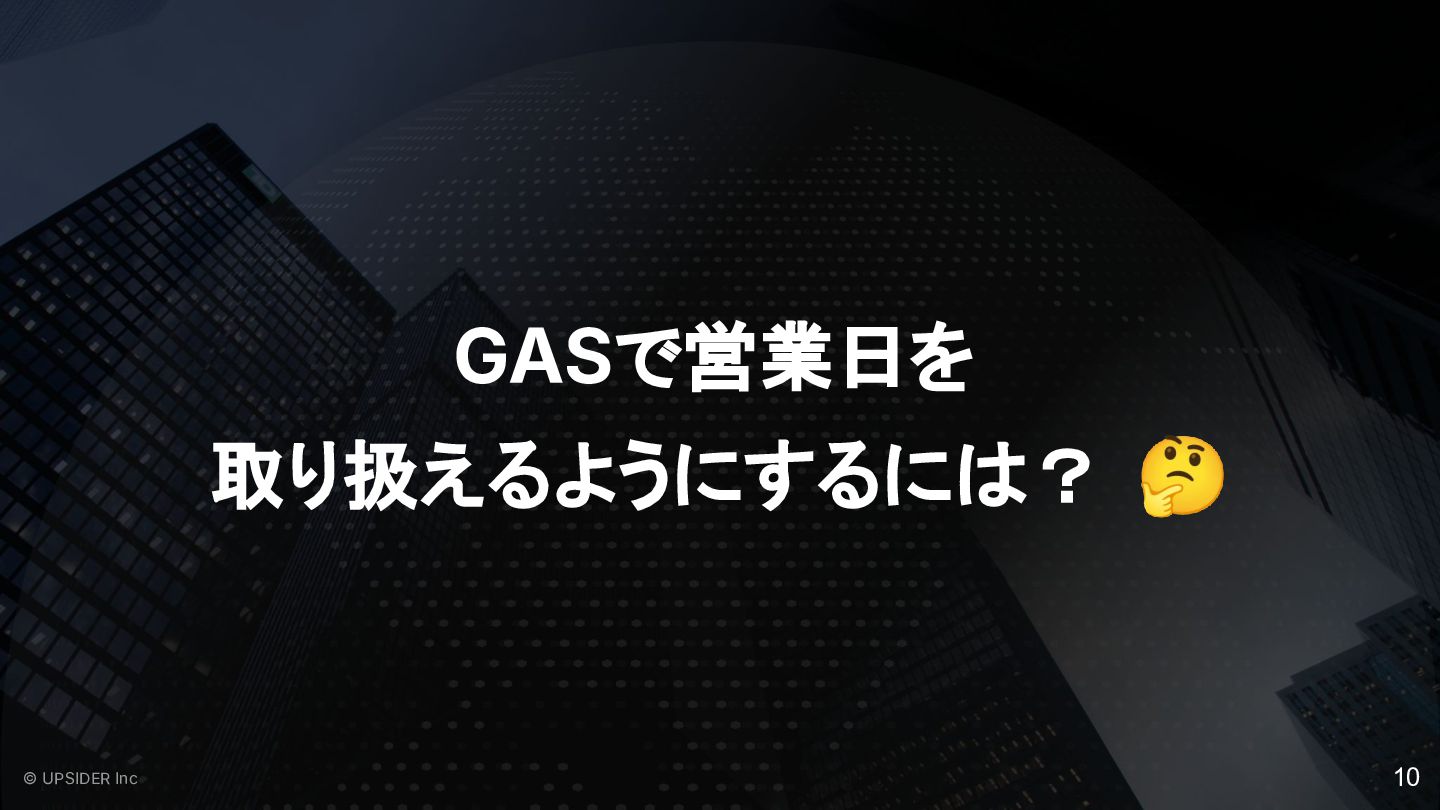 GASで営業日を 取り扱えるようにするには? 🤔 10 © UPSIDER Inc
