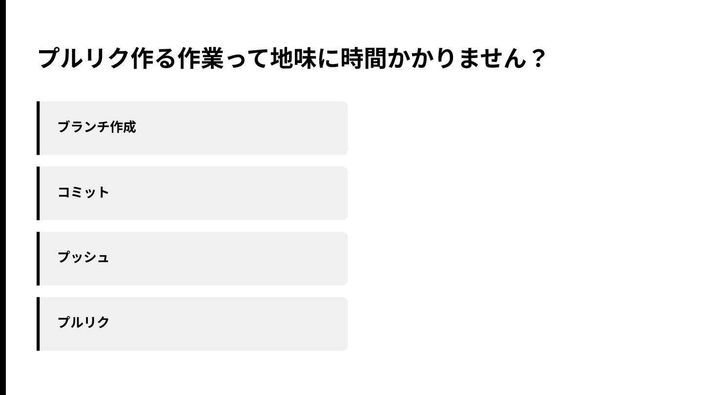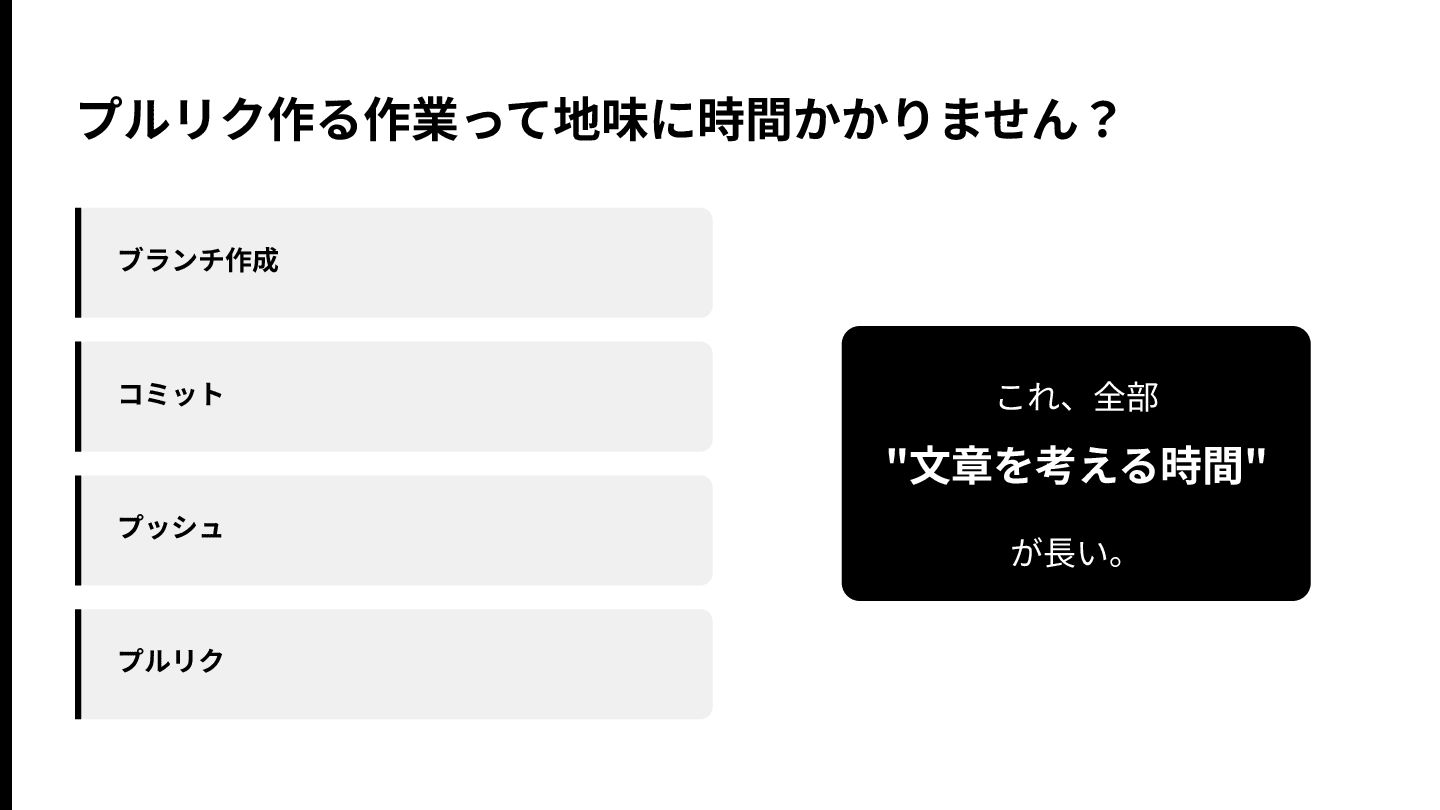 プルリク作る作業って地味に時間かかりません? ブランチ作成 コミット プッシュ プルリク これ、全部 "⽂章を考える時間" が⻑い。