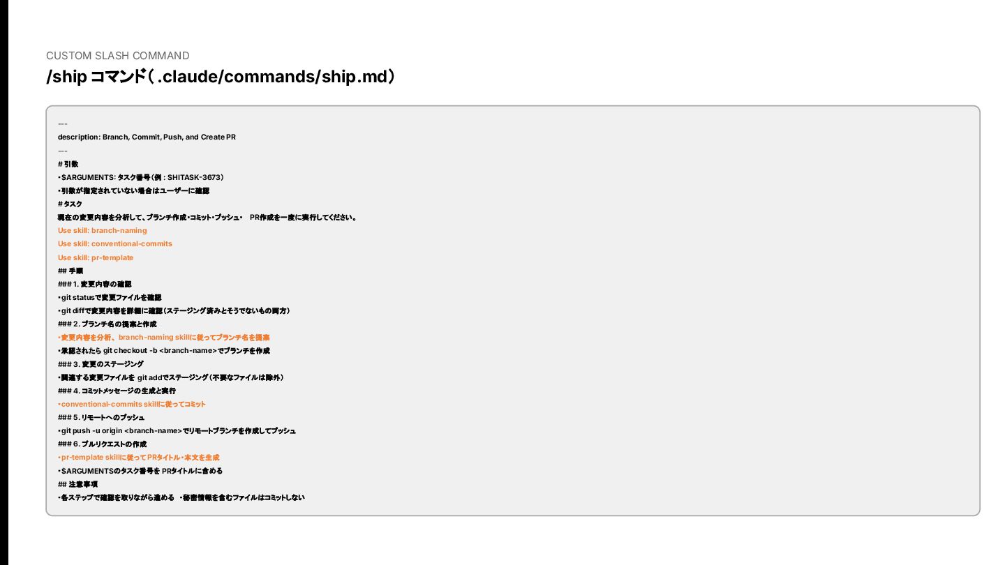 CUSTOM SLASH COMMAND /ship コマンド( .claude/commands/ship.md) --- description: Branch, Commit,