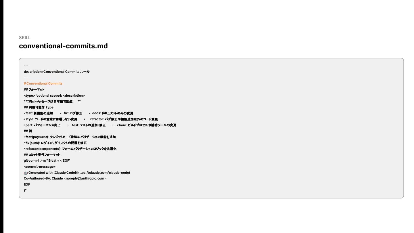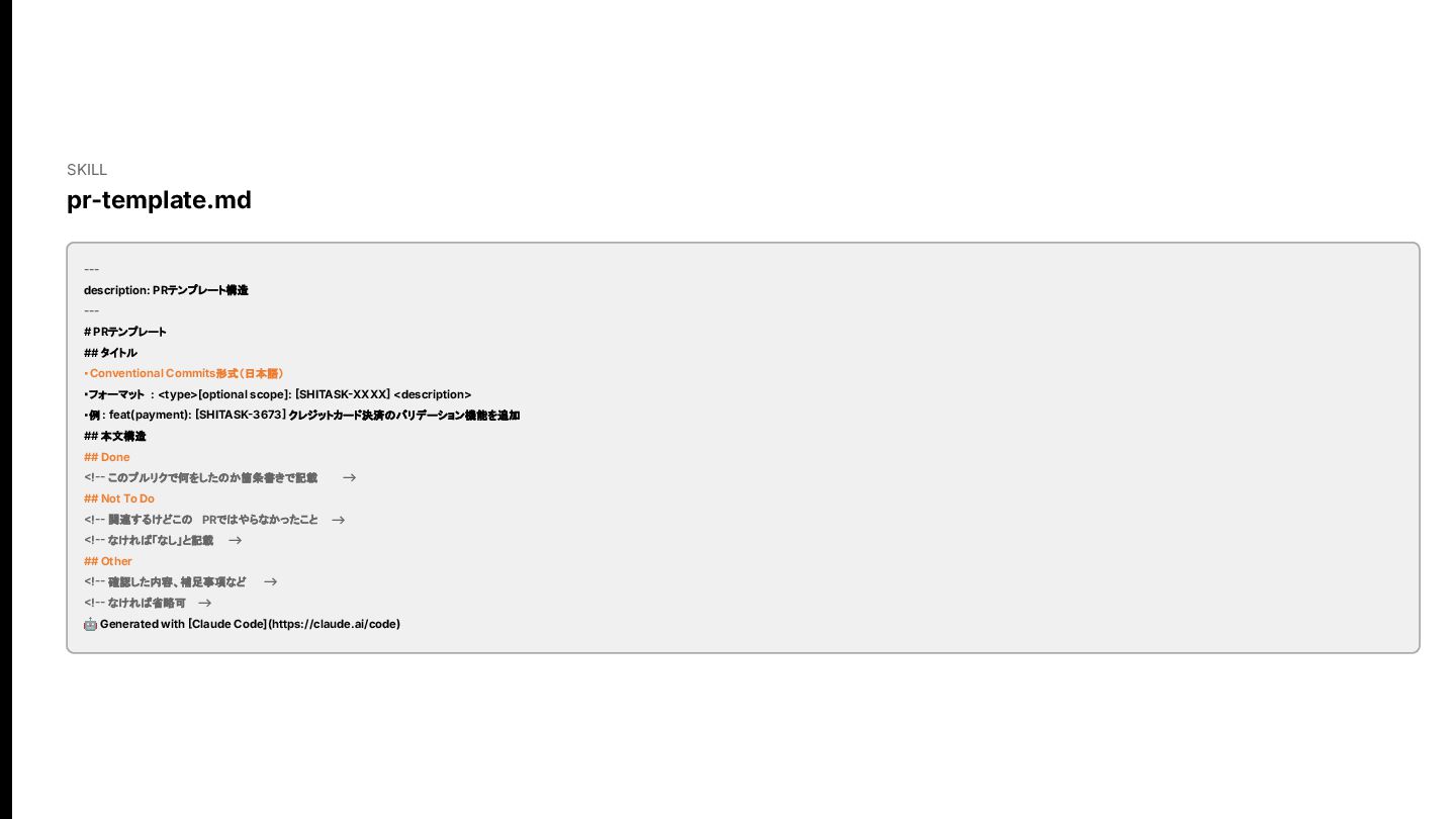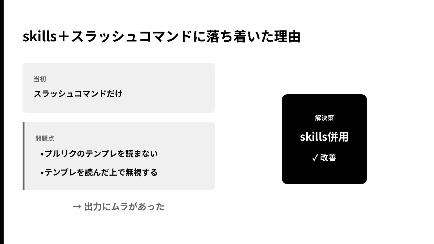 skills+スラッシュコマンドに落ち着いた理由 当初 スラッシュコマンドだけ 問題点 •プルリクのテンプレを読まない •テンプレを読んだ上で無視する → 出⼒にムラがあった 解決策 skills併⽤