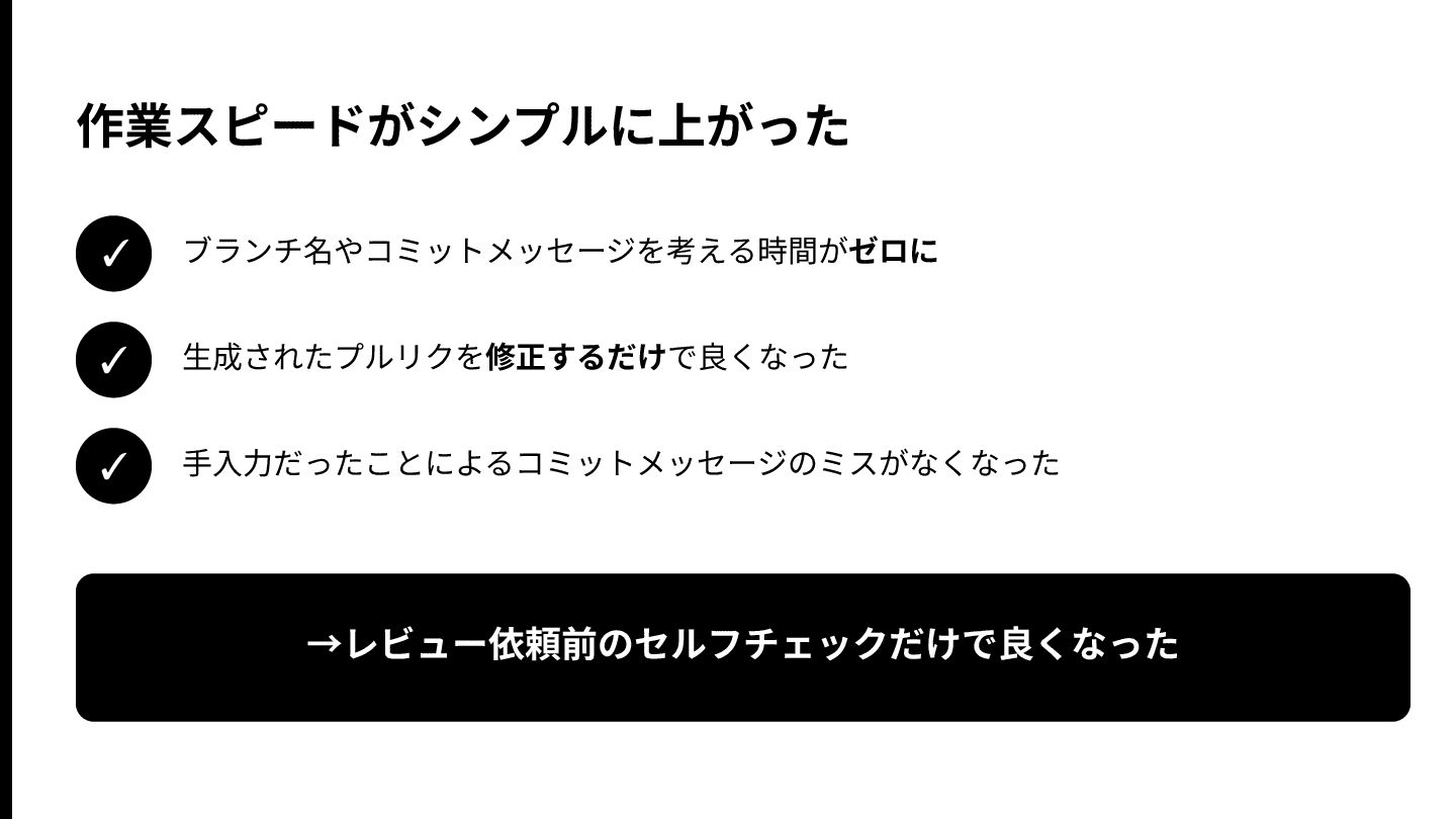 ⽣成されたプルリクを修正するだけで良くなった 作業スピードがシンプルに上がった ✓ ブランチ名やコミットメッセージを考える時間がゼロに ✓ ✓ ⼿⼊⼒だったことによるコミットメッセージのミスがなくなった →レビュー依頼前のセルフチェックだけで良くなった