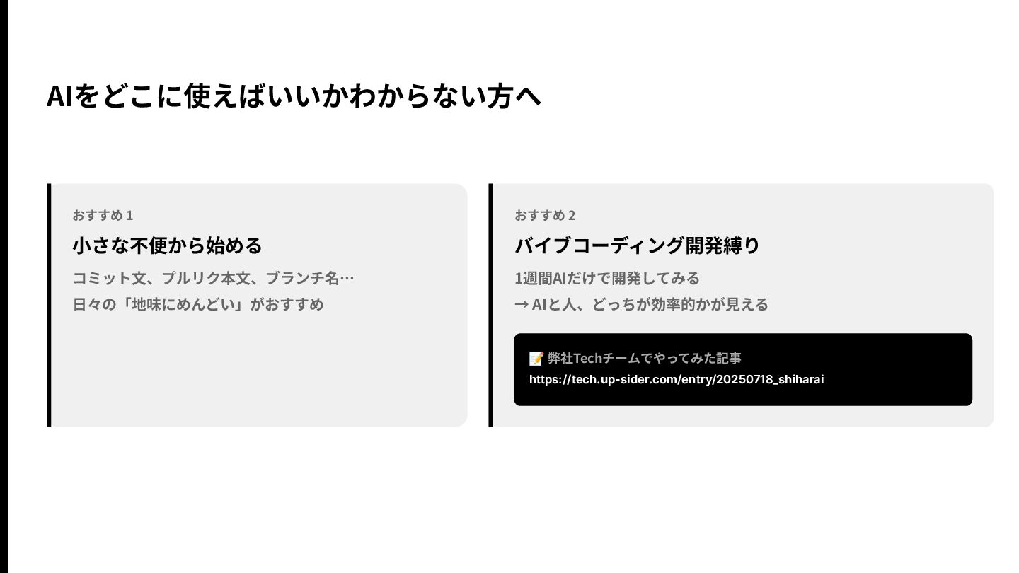 AIをどこに使えばいいかわからない⽅へ おすすめ 1 ⼩さな不便から始める コミット⽂、プルリク本⽂、ブランチ名… ⽇々の「地味にめんどい」がおすすめ おすすめ 2 バイブコーディング開発縛り 1週間AIだけで開発してみる