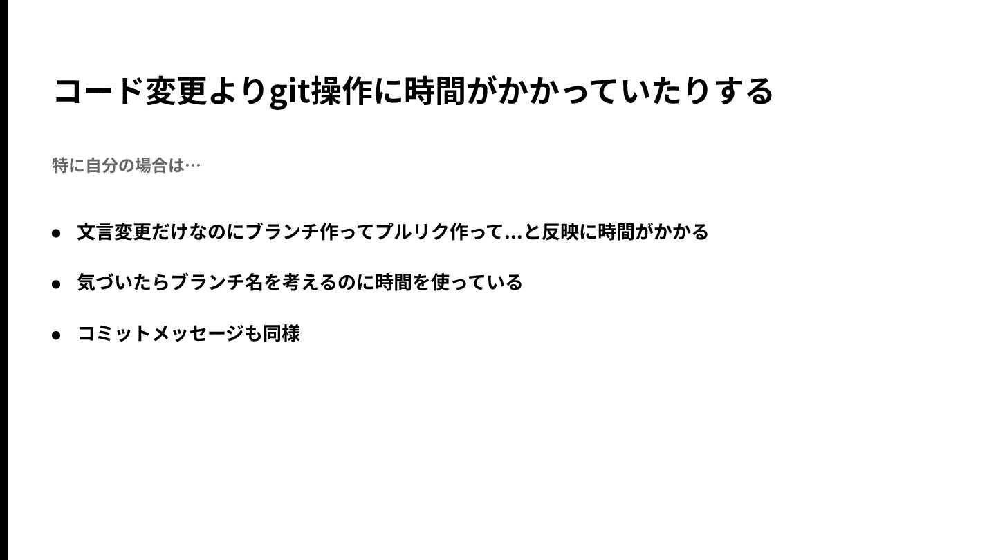 コード変更よりgit操作に時間がかかっていたりする 特に⾃分の場合は… ⽂⾔変更だけなのにブランチ作ってプルリク作って...と反映に時間がかかる 気づいたらブランチ名を考えるのに時間を使っている コミットメッセージも同様 → ⾯倒だ!