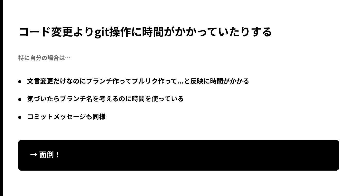 コード変更よりgit操作に時間がかかっていたりする 特に⾃分の場合は… ⽂⾔変更だけなのにブランチ作ってプルリク作って...と反映に時間がかかる 気づいたらブランチ名を考えるのに時間を使っている コミットメッセージも同様 → ⾯倒!