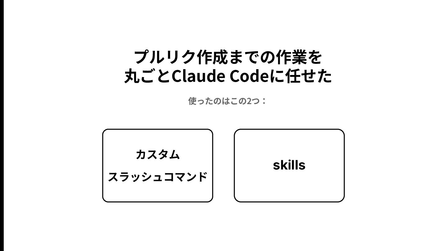 プルリク作成までの作業を 丸ごとClaude Codeに任せた 使ったのはこの2つ: skills カスタム スラッシュコマンド