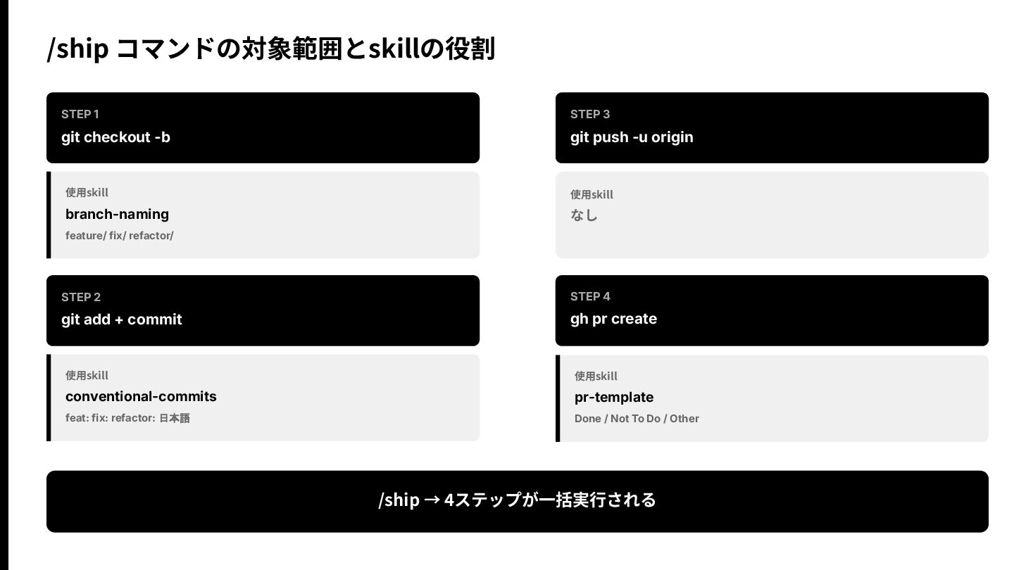 fix/ refactor/ STEP 2 git add + commit 使⽤skill conventional-commits feat: fix: refactor: 日本語 STEP 3 git push -u origin 使⽤skill なし STEP 4 gh pr create 使⽤skill pr-template Done / Not To Do / Other /ship → 4ステップが⼀括実⾏される