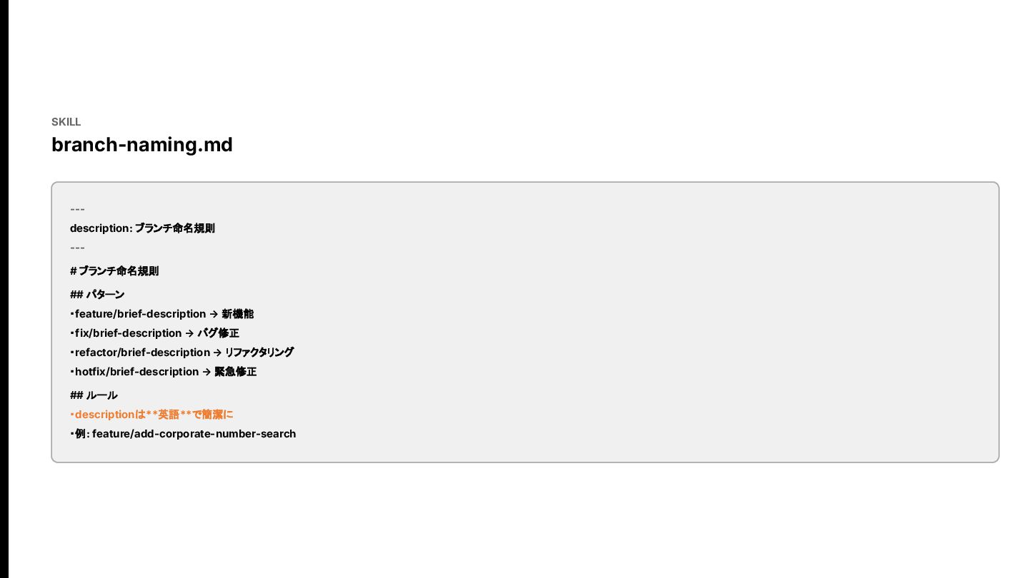 ・feature/brief-description → 新機能 ・fix/brief-description → バグ修正 ・refactor/brief-description → リファクタリング ・hotfix/brief-description → 緊急修正 ## ルール ・descriptionは**英語**で簡潔に ・例: feature/add-corporate-number-search