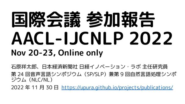 the Association for Computational Linguistics and the 12th International Joint Conference on Natural Language Processing • アジアでの ACL 系会議 (北米の NAACL、欧州の EACL に対応) • AACL としては 2020 年以来 2 度目 AACL-IJCNLP 2022 [aacl2022.org] [proceedings]