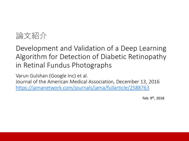 Detection of Diabetic Retinopathy in Retinal Fundus Photographs Varun Gulshan (Google Inc) et al. Journal of the American Medical Association, December 13, 2016 https://jamanetwork.com/journals/jama/fullarticle/2588763 Feb. 9th, 2018