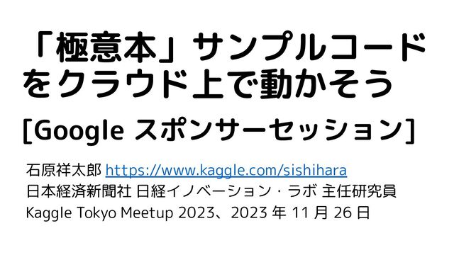 - Kaggle Tokyo Meetup 2023 での発表資料: https://connpass.com/event/292810/ - 『Kaggleに挑む深層学習プログラミングの極意』(講談社)のサンプルコード: https://github.com/smly/kaggle-book-gokui - Kaggle Advent Calendar 2023: https://qiita.com/advent-calendar/2023/kaggle