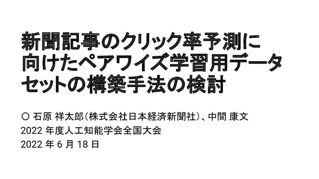 (予稿と実験結果は変化なし) 📝 Notes: Shotaro Ishihara and Yasufumi Nakama. 2022. Generating a Pairwise Dataset for Click-through Rate Prediction of News Articles Considering Positions and Contents. In Proceedings of Computation + Journalism Conference 2022. ACM, New York, NY, USA, 5 pages. https://cj2022.brown.columbia.edu/