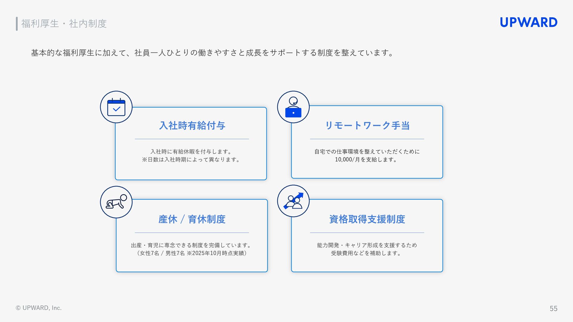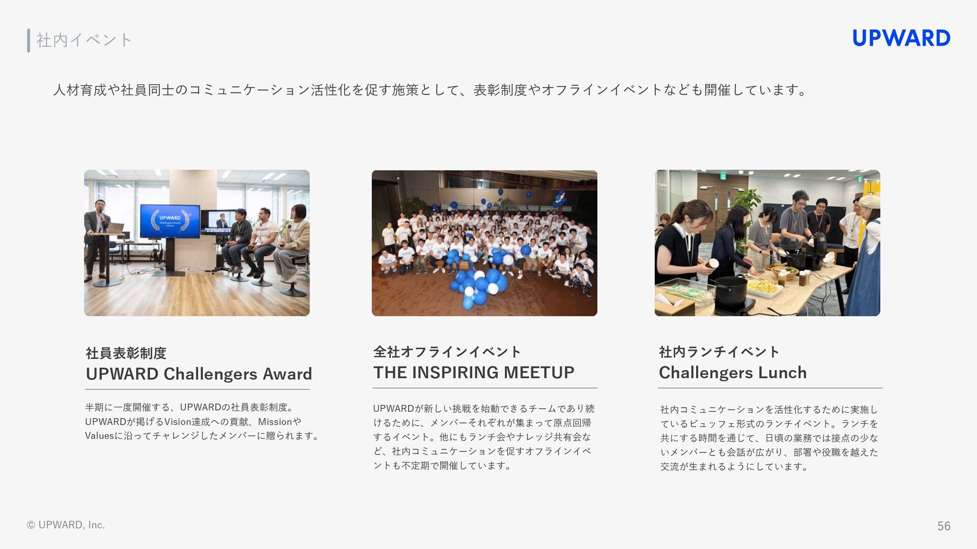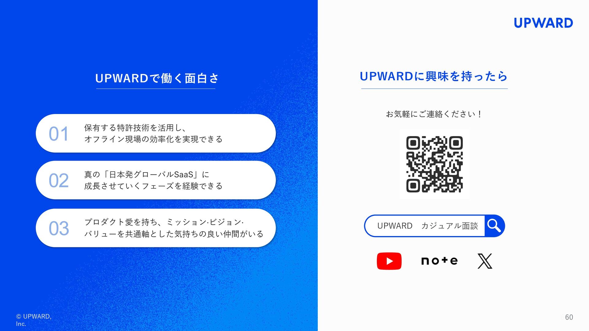Salesforce Gold ISV Partner 受賞 2017 UPWARD株式会社設⽴ 2020 2019 関⻄⽀社設⽴ 「UPWARD AGENT」をリリース 2021 J-Startup企業に選定 地⽅創⽣SDGs国際フォーラム2021にて 「UPWARD被災地復興⽀援」が 優良事例に選定 「滞在記録の⾃動検知」に関する特許を取得 「UPWARD DATA 」をリリース 2022 2023 Forbes JAPAN 2022年版「Japanʼs Cloud 20」 選出 三菱総合研究所 ICF Business Acceleration Program 2022「ベストグロース賞」受賞 「Google for Startups International Sales Academy」に採択 改良版「UPWARD」をリリース マイクロソフト ジャパン パートナー オブ ザ イヤー 2023「Microsoft for Startups」アワード受賞 テクノロジー企業成⻑率ランキング Technology Fast 50 2022 Japan 受賞 Salesforce Japan Partner Award 2023 受賞 Salesforce BEST HIT APP RANKING 2022 「製造業部⾨」1位を受賞 シンガポールに海外拠点を開設 2024 2025 東京本社移転 関⻄⽀社移転 「UPWARD INSIGHT」をリリース 『Forbes JAPAN』の起業家名鑑にCEO⾦⽊が掲載 UPWARD Sales AI Innovation Lab 設⽴ Salesforce Japan Partner Award 2025 「Regional Best Partner of the Year ‒ AppExchange -」 受賞 タイに新拠点を設⽴