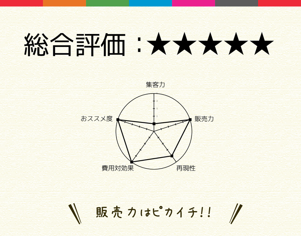 1 2 3 4 5 総合評価: ★★☆☆☆ 販売戦略をしっかり練ろう!