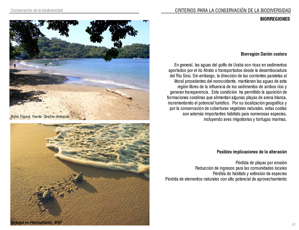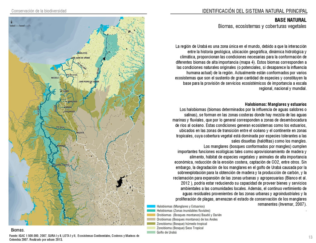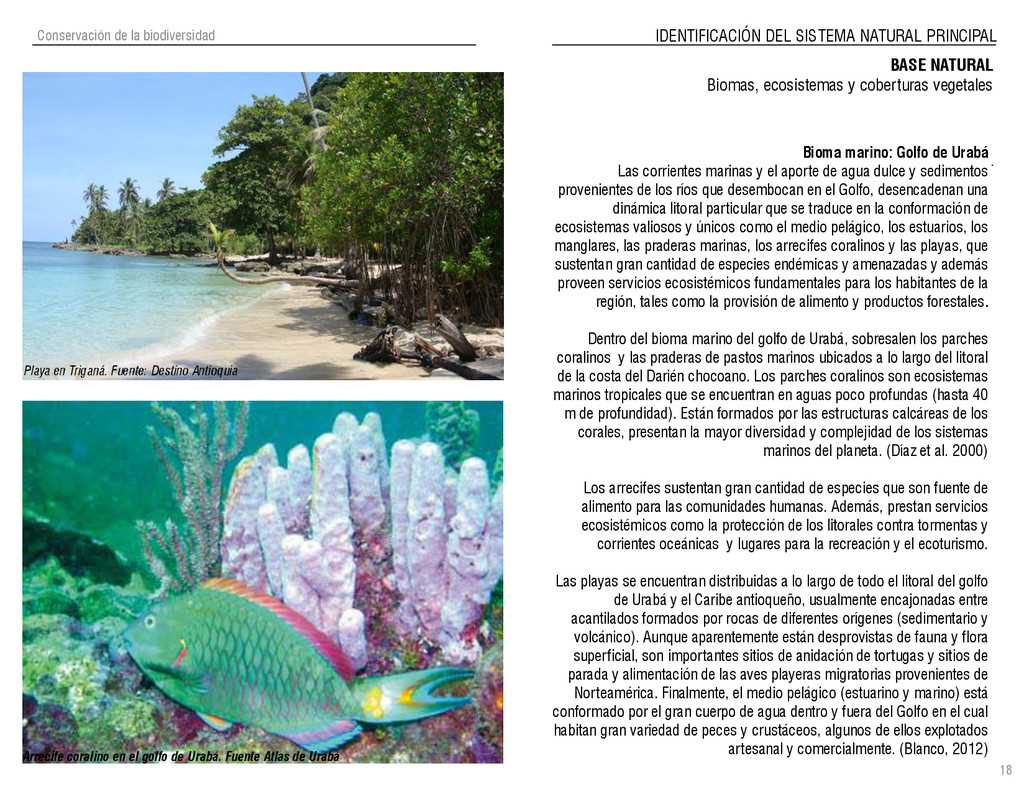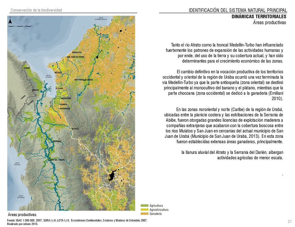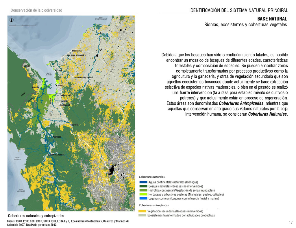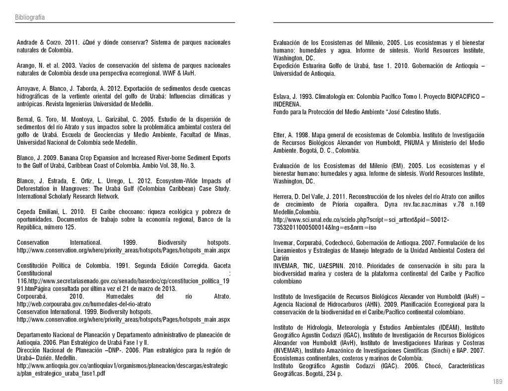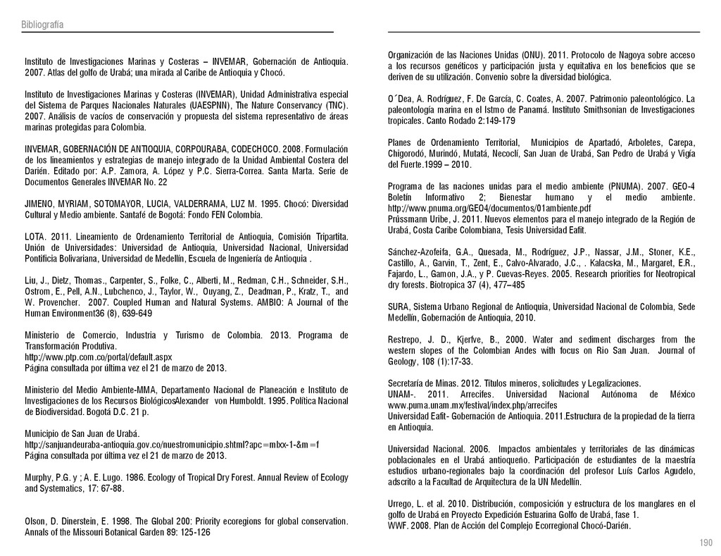 de Antioquia. 2007. Atlas del golfo de Urabá; una mirada al Caribe de Antioquia y Chocó. Instituto de Investigaciones Marinas y Costeras (INVEMAR), Unidad Administrativa especial del Sistema de Parques Nacionales Naturales (UAESPNN), The Nature Conservancy (TNC). 2007. Análisis de vacíos de conservación y propuesta del sistema representativo de áreas marinas protegidas para Colombia. INVEMAR, GOBERNACIÓN DE ANTIOQUIA, CORPOURABA, CODECHOCO. 2008. Formulación de los lineamientos y estrategias de manejo integrado de la Unidad Ambiental Costera del Darién. Editado por: A.P. Zamora, A. López y P.C. Sierra-Correa. Santa Marta. Serie de Documentos Generales INVEMAR No. 22 JIMENO, MYRIAM, SOTOMAYOR, LUCIA, VALDERRAMA, LUZ M. 1995. Chocó: Diversidad Cultural y Medio ambiente. Santafé de Bogotá: Fondo FEN Colombia. LOTA. 2011. Lineamiento de Ordenamiento Territorial de Antioquia, Comisión Tripartita. Unión de Universidades: Universidad de Antioquia, Universidad Nacional, Universidad Pontificia Bolivariana, Universidad de Medellín, Escuela de Ingeniería de Antioquia . Liu, J., Dietz, Thomas., Carpenter, S., Folke, C., Alberti, M., Redman, C.H., Schneider, S.H., Ostrom, E., Pell, A.N., Lubchenco, J., Taylor, W., Ouyang, Z., Deadman, P., Kratz, T., and W. Provencher. 2007. Coupled Human and Natural Systems. AMBIO: A Journal of the Human Environment36 (8), 639-649 Ministerio de Comercio, Industria y Turismo de Colombia. 2013. Programa de Transformación Produtiva. http://www.ptp.com.co/portal/default.aspx Página consultada por última vez el 21 de marzo de 2013. Ministerio del Medio Ambiente-MMA, Departamento Nacional de Planeación e Instituto de Investigaciones de los Recursos Biológicos “ Alexander von Humboldt” . 1995. Política Nacional de Biodiversidad. Bogotá D.C. 21 p. Municipio de San Juan de Urabá. http://sanjuandeuraba-antioquia.gov.co/nuestromunicipio.shtml?apc=mIxx-1-&m=f Página consultada por última vez el 21 de marzo de 2013. Murphy, P.G. y ; A. E. Lugo. 1986. Ecology of Tropical Dry Forest. Annual Review of Ecology and Systematics, 17: 67-88. Olson, D. Dinerstein, E. 1998. The Global 200: Priority ecoregions for global conservation. Annals of the Missouri Botanical Garden 89: 125-126 Organización de las Naciones Unidas (ONU). 2011. Protocolo de Nagoya sobre acceso a los recursos genéticos y participación justa y equitativa en los beneficios que se deriven de su utilización. Convenio sobre la diversidad biológica. O´Dea, A. Rodríguez, F. De García, C. Coates, A. 2007. Patrimonio paleontológico. La paleontología marina en el Istmo de Panamá. Instituto Smithsonian de Investigaciones tropicales. Canto Rodado 2:149-179 Planes de Ordenamiento Territorial, Municipios de Apartadó, Arboletes, Carepa, Chigorodó, Murindó, Mutatá, Necoclí, San Juan de Urabá, San Pedro de Urabá y Vigía del Fuerte.1999 – 2010. Programa de las naciones unidas para el medio ambiente (PNUMA). 2007. GEO-4 Boletín Informativo 2; Bienestar humano y el medio ambiente. http://www.pnuma.org/GEO4/documentos/01ambiente.pdf Prûssmann Uribe, J. 2011. Nuevos elementos para el manejo integrado de la Región de Urabá, Costa Caribe Colombiana, Tesis Universidad Eafit. Sánchez-Azofeifa, G.A., Quesada, M., Rodríguez, J.P., Nassar, J.M., Stoner, K.E., Castillo, A., Garvin, T., Zent, E., Calvo-Alvarado, J.C., . Kalacska, M., Margaret, E.R., Fajardo, L., Gamon, J.A., y P. Cuevas-Reyes. 2005. Research priorities for Neotropical dry forests. Biotropica 37 (4), 477–485 SURA, Sistema Urbano Regional de Antioquia, Universidad Nacional de Colombia, Sede Medellín, Gobernación de Antioquia, 2010. Restrepo, J. D., Kjerfve, B., 2000. Water and sediment discharges from the western slopes of the Colombian Andes with focus on Rio San Juan. Journal of Geology, 108 (1):17-33. Secretaría de Minas. 2012. Títulos mineros, solicitudes y Legalizaciones. UNAM-. 2011. Arrecifes. Universidad Nacional Autónoma de México www.puma.unam.mx/festival/index.php/arrecifes Universidad Eafit- Gobernación de Antioquia. 2011.Estructura de la propiedad de la tierra en Antioquia. Universidad Nacional. 2006. Impactos ambientales y territoriales de las dinámicas poblacionales en el Urabá antioqueño. Participación de estudiantes de la maestría estudios urbano-regionales bajo la coordinación del profesor Luís Carlos Agudelo, adscrito a la Facultad de Arquitectura de la UN Medellín. Urrego, L. et al. 2010. Distribución, composición y estructura de los manglares en el golfo de Urabá en Proyecto Expedición Estuarina Golfo de Urabá, fase 1. WWF. 2008. Plan de Acción del Complejo Ecorregional Chocó-Darién. 190