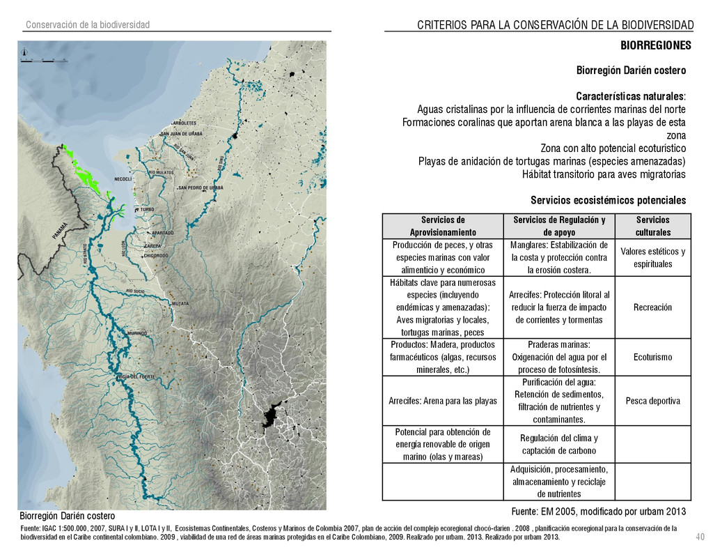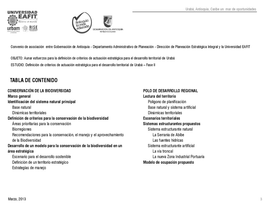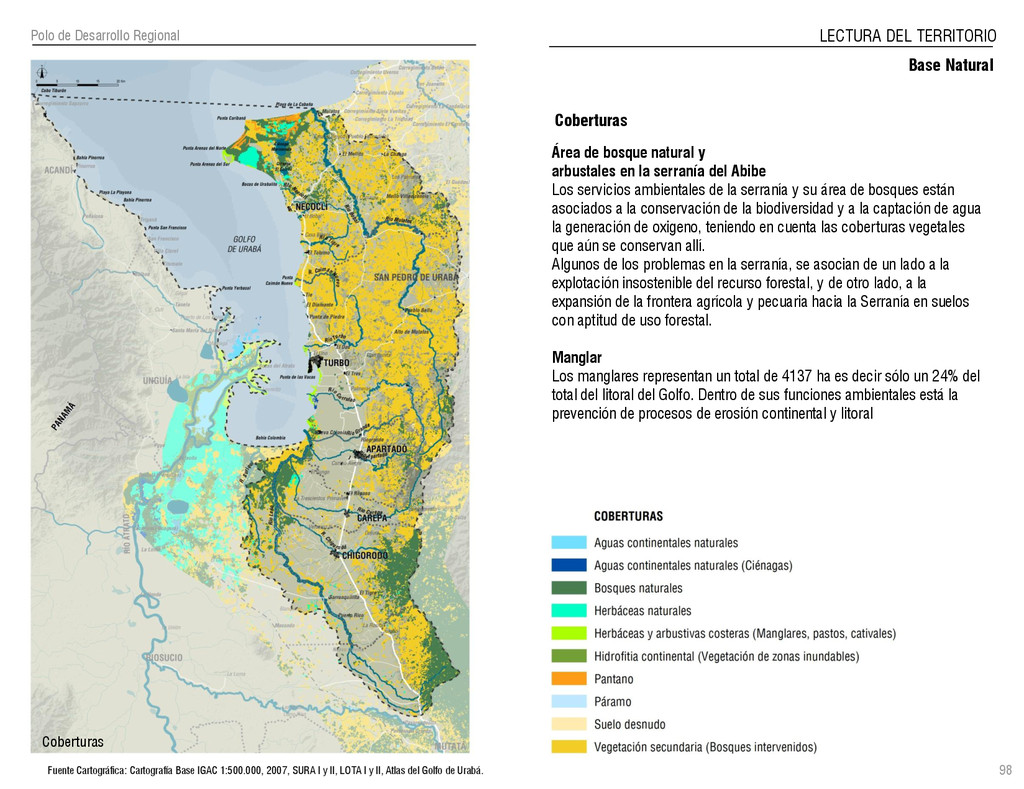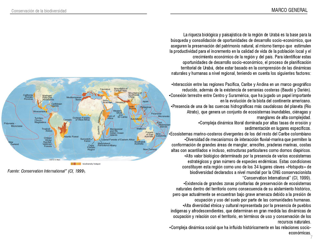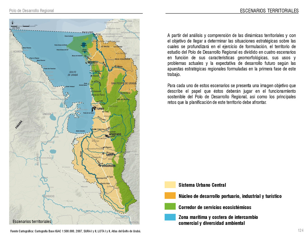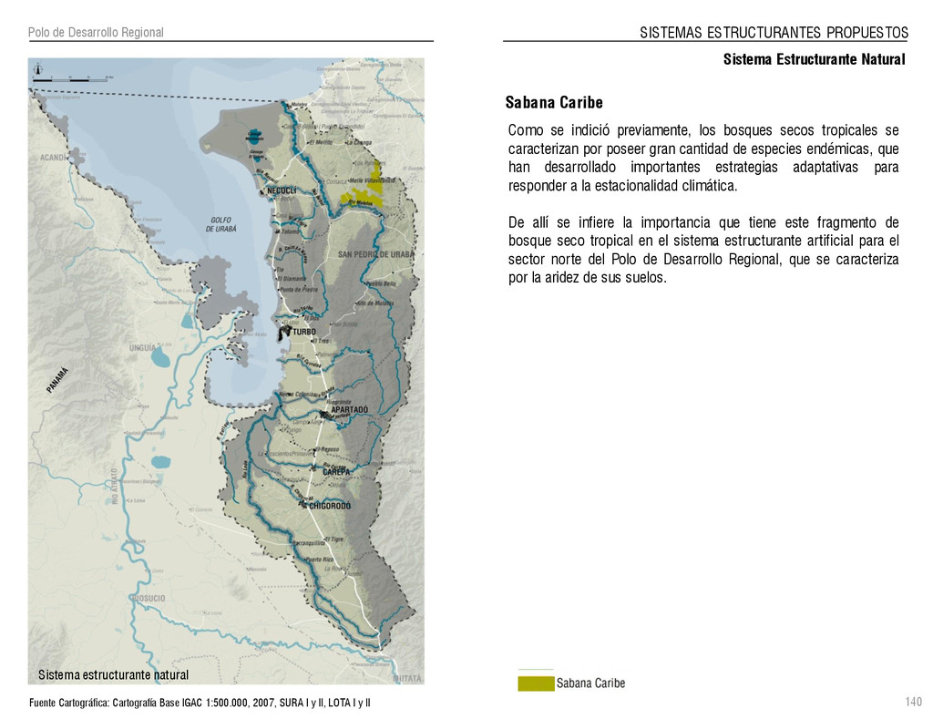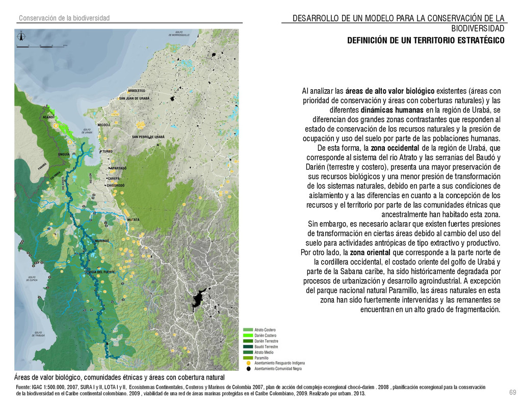 de Antioquia. 2007. Atlas del golfo de Urabá; una mirada al Caribe de Antioquia y Chocó. Instituto de Investigaciones Marinas y Costeras (INVEMAR), Unidad Administrativa especial del Sistema de Parques Nacionales Naturales (UAESPNN), The Nature Conservancy (TNC). 2007. Análisis de vacíos de conservación y propuesta del sistema representativo de áreas marinas protegidas para Colombia. INVEMAR, GOBERNACIÓN DE ANTIOQUIA, CORPOURABA, CODECHOCO. 2008. Formulación de los lineamientos y estrategias de manejo integrado de la Unidad Ambiental Costera del Darién. Editado por: A.P. Zamora, A. López y P.C. Sierra-Correa. Santa Marta. Serie de Documentos Generales INVEMAR No. 22 JIMENO, MYRIAM, SOTOMAYOR, LUCIA, VALDERRAMA, LUZ M. 1995. Chocó: Diversidad Cultural y Medio ambiente. Santafé de Bogotá: Fondo FEN Colombia. LOTA. 2011. Lineamiento de Ordenamiento Territorial de Antioquia, Comisión Tripartita. Unión de Universidades: Universidad de Antioquia, Universidad Nacional, Universidad Pontificia Bolivariana, Universidad de Medellín, Escuela de Ingeniería de Antioquia . Liu, J., Dietz, Thomas., Carpenter, S., Folke, C., Alberti, M., Redman, C.H., Schneider, S.H., Ostrom, E., Pell, A.N., Lubchenco, J., Taylor, W., Ouyang, Z., Deadman, P., Kratz, T., and W. Provencher. 2007. Coupled Human and Natural Systems. AMBIO: A Journal of the Human Environment36 (8), 639-649 Ministerio de Comercio, Industria y Turismo de Colombia. 2013. Programa de Transformación Produtiva. http://www.ptp.com.co/portal/default.aspx Página consultada por última vez el 21 de marzo de 2013. Ministerio del Medio Ambiente-MMA, Departamento Nacional de Planeación e Instituto de Investigaciones de los Recursos Biológicos “ Alexander von Humboldt” . 1995. Política Nacional de Biodiversidad. Bogotá D.C. 21 p. Municipio de San Juan de Urabá. http://sanjuandeuraba-antioquia.gov.co/nuestromunicipio.shtml?apc=mIxx-1-&m=f Página consultada por última vez el 21 de marzo de 2013. Murphy, P.G. y ; A. E. Lugo. 1986. Ecology of Tropical Dry Forest. Annual Review of Ecology and Systematics, 17: 67-88. Olson, D. Dinerstein, E. 1998. The Global 200: Priority ecoregions for global conservation. Annals of the Missouri Botanical Garden 89: 125-126 Organización de las Naciones Unidas (ONU). 2011. Protocolo de Nagoya sobre acceso a los recursos genéticos y participación justa y equitativa en los beneficios que se deriven de su utilización. Convenio sobre la diversidad biológica. O´Dea, A. Rodríguez, F. De García, C. Coates, A. 2007. Patrimonio paleontológico. La paleontología marina en el Istmo de Panamá. Instituto Smithsonian de Investigaciones tropicales. Canto Rodado 2:149-179 Planes de Ordenamiento Territorial, Municipios de Apartadó, Arboletes, Carepa, Chigorodó, Murindó, Mutatá, Necoclí, San Juan de Urabá, San Pedro de Urabá y Vigía del Fuerte.1999 – 2010. Programa de las naciones unidas para el medio ambiente (PNUMA). 2007. GEO-4 Boletín Informativo 2; Bienestar humano y el medio ambiente. http://www.pnuma.org/GEO4/documentos/01ambiente.pdf Prûssmann Uribe, J. 2011. Nuevos elementos para el manejo integrado de la Región de Urabá, Costa Caribe Colombiana, Tesis Universidad Eafit. Sánchez-Azofeifa, G.A., Quesada, M., Rodríguez, J.P., Nassar, J.M., Stoner, K.E., Castillo, A., Garvin, T., Zent, E., Calvo-Alvarado, J.C., . Kalacska, M., Margaret, E.R., Fajardo, L., Gamon, J.A., y P. Cuevas-Reyes. 2005. Research priorities for Neotropical dry forests. Biotropica 37 (4), 477–485 SURA, Sistema Urbano Regional de Antioquia, Universidad Nacional de Colombia, Sede Medellín, Gobernación de Antioquia, 2010. Restrepo, J. D., Kjerfve, B., 2000. Water and sediment discharges from the western slopes of the Colombian Andes with focus on Rio San Juan. Journal of Geology, 108 (1):17-33. Secretaría de Minas. 2012. Títulos mineros, solicitudes y Legalizaciones. UNAM-. 2011. Arrecifes. Universidad Nacional Autónoma de México www.puma.unam.mx/festival/index.php/arrecifes Universidad Eafit- Gobernación de Antioquia. 2011.Estructura de la propiedad de la tierra en Antioquia. Universidad Nacional. 2006. Impactos ambientales y territoriales de las dinámicas poblacionales en el Urabá antioqueño. Participación de estudiantes de la maestría estudios urbano-regionales bajo la coordinación del profesor Luís Carlos Agudelo, adscrito a la Facultad de Arquitectura de la UN Medellín. Urrego, L. et al. 2010. Distribución, composición y estructura de los manglares en el golfo de Urabá en Proyecto Expedición Estuarina Golfo de Urabá, fase 1. WWF. 2008. Plan de Acción del Complejo Ecorregional Chocó-Darién. 190