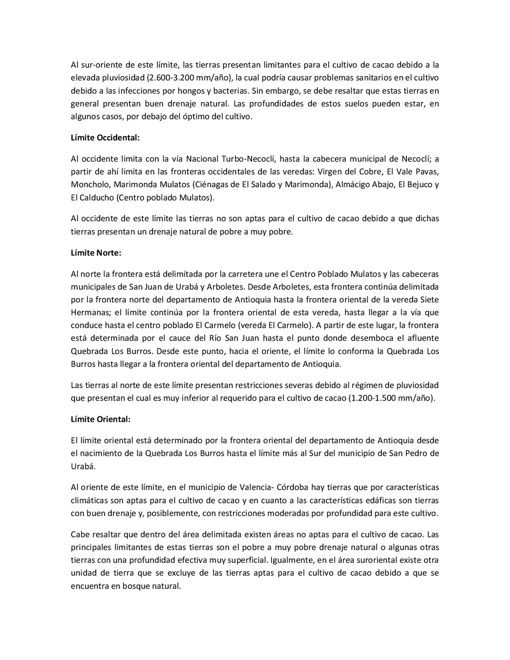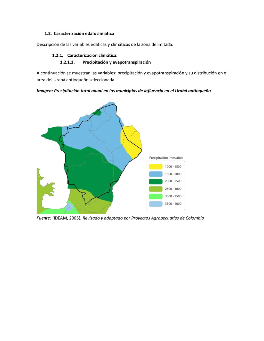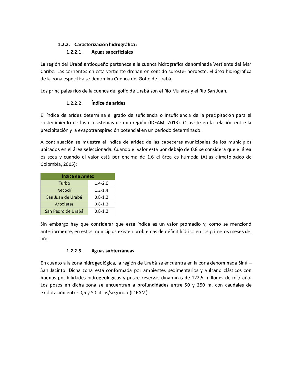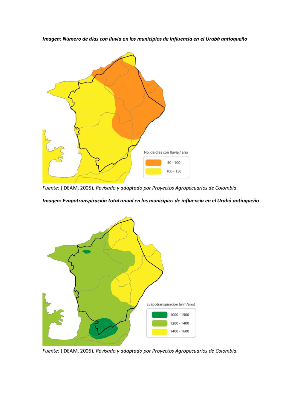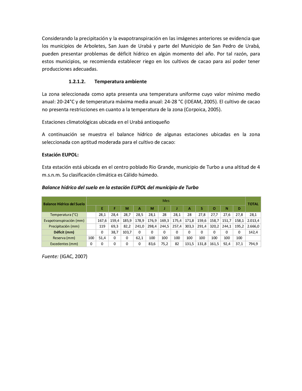 la cabecera municipal de San Juan de Urabá, a una altitud de 4 m.s.n.m. Su clasificación climática es Cálido húmedo. Balance hídrico del suelo en la estación SAN JUAN DE URABÁ Balance Hídrico del Suelo Mes TOTAL E F M A M J J A S O N D Temperatura (°C) 28,1 28,4 28,7 28,5 28,1 28 28,1 28 27,8 27,7 27,6 27,8 28,1 Evapotranspiración (mm) 167,6 159,4 185,9 180,7 176,9 170,9 175,4 171,8 161,2 157,1 150,2 156,6 2.013,8 Precipitación (mm) 35,3 36 44,4 140,5 275,9 227,4 218,1 263,6 232,8 238,4 232 123,2 2.067,6 Déficit (mm) 65,7 123 141,5 40,2 0 0 0 0 0 0 0 0 370,7 Reserva (mm) 67 0 0 0 0 99 100 100 100 100 100 100 67 Excedentes (mm) 0 0 0 0 0 55,4 42,7 91,8 71,6 81,3 81,8 0 424,6 Fuente: (IGAC, 2007). Estación ARBOLETES: Esta estación está ubicada en la cabecera municipal de Arboletes, a una altitud de 4 m.s.n.m. Su clasificación climática es Cálido Seco. Balance hídrico del suelo en la estación ARBOLETES Balance Hídrico del Suelo Mes TOTAL E F M A M J J A S O N D Temperatura (°C) 27,5 27,6 27,9 28 27,8 27,6 27,5 27,5 27,2 27,3 27,3 27,4 27,6 Evapotranspiración (mm) 153 141,4 165,5 168 169,4 161,4 162,1 160,5 147,7 149,9 144,1 149,2 1872,3 Precipitación (mm) 14,3 15,9 44,4 126,9 258,9 186,2 195,3 211,1 209 217,3 183,9 61,2 1.724,4 Déficit (mm) 126,7 125,5 121,1 41,1 0 0 0 0 0 0 0 0 414,4 Reserva (mm) 12 0 0 0 0 89,5 100 100 100 100 100 100 12 Excedentes (mm) 0 0 0 0 0 14,2 33,2 50,6 61,3 67,4 39,8 0 266,6 Fuente: (IGAC, 2007) Otras estaciones: A continuación se describen las variables climáticas generales para otras estaciones climatológicas de la región del Urabá antioqueño. N° Estación (IDEAM) Ubicación Latitud (Norte) Longitud (Oeste) Precipitación (mm) Temp. Media °C T. media máxima °C T. media mímima °C 1202503 El Mellito - Necoclí 8°32'45'' 76°40'16'' 1.827 26,7 30,8 23,5 1202501 Cabecera- Turbo 8°7'0'' 76°44'04'' 2.427 27,2 30,8 23,3 Fuente: (IDEAM, 2005)