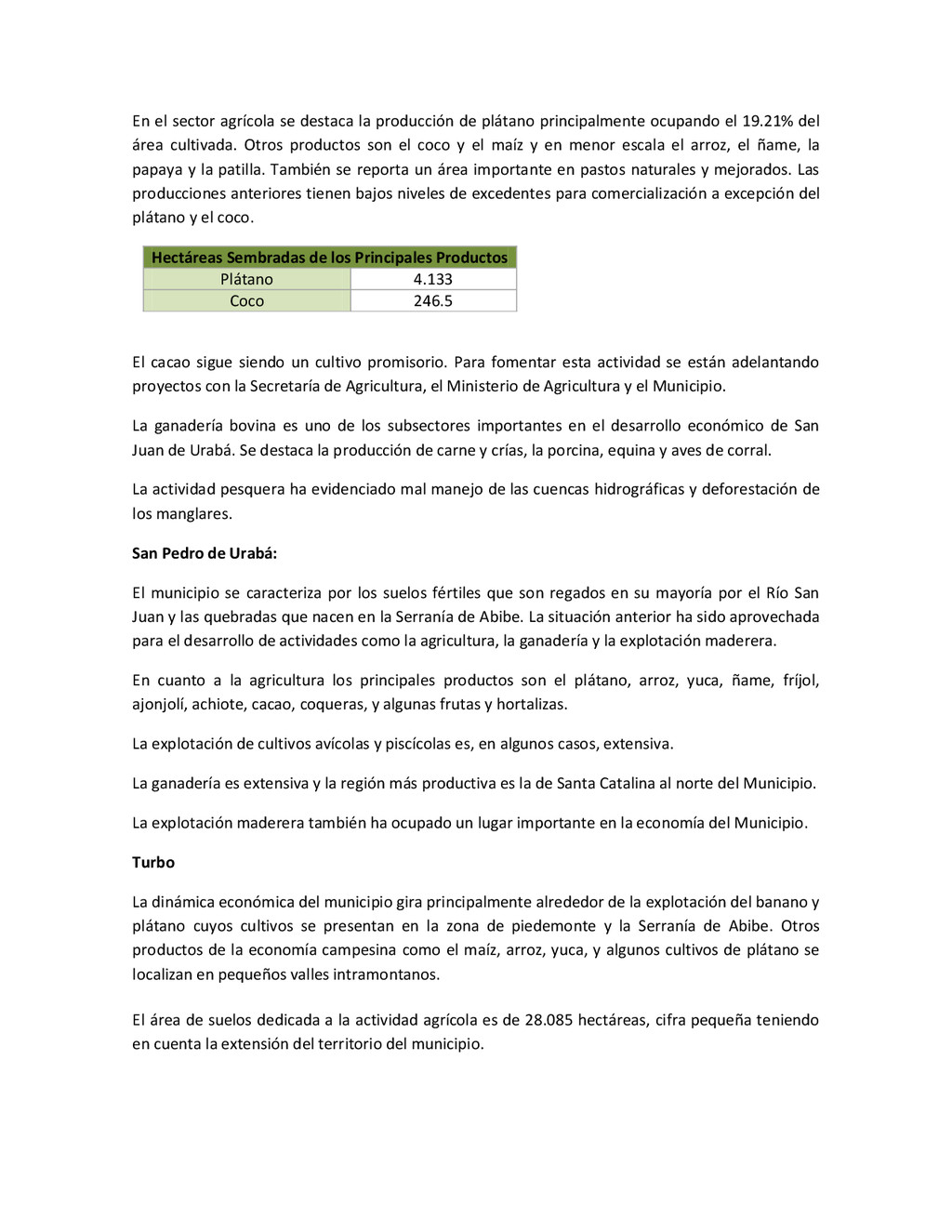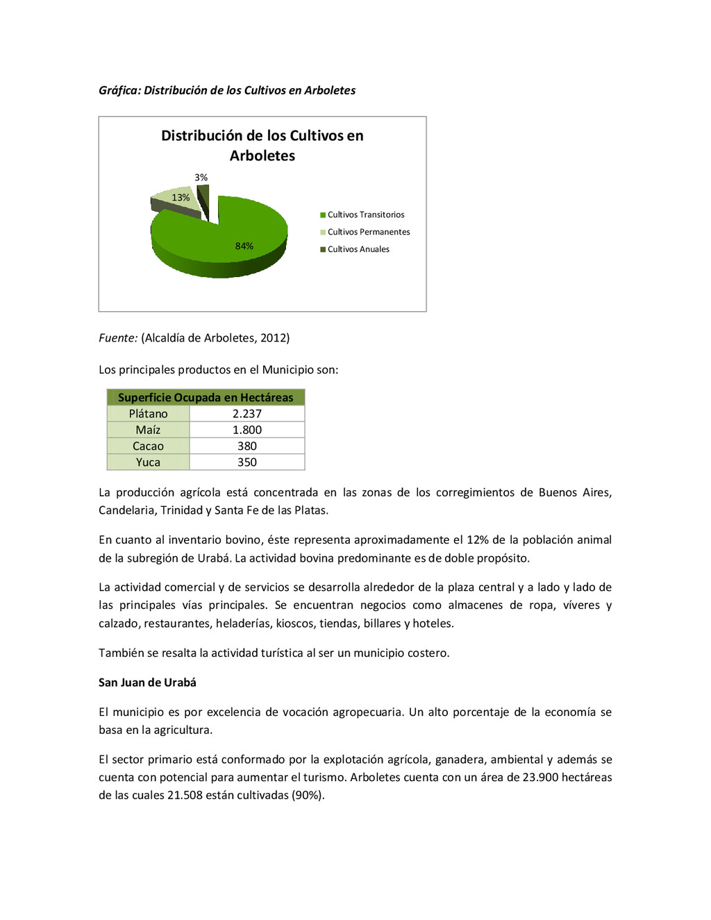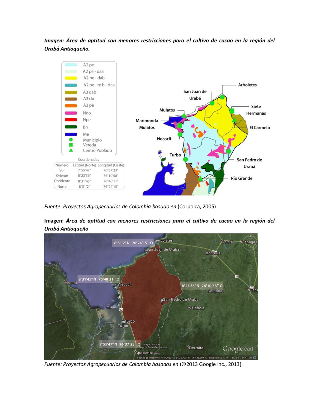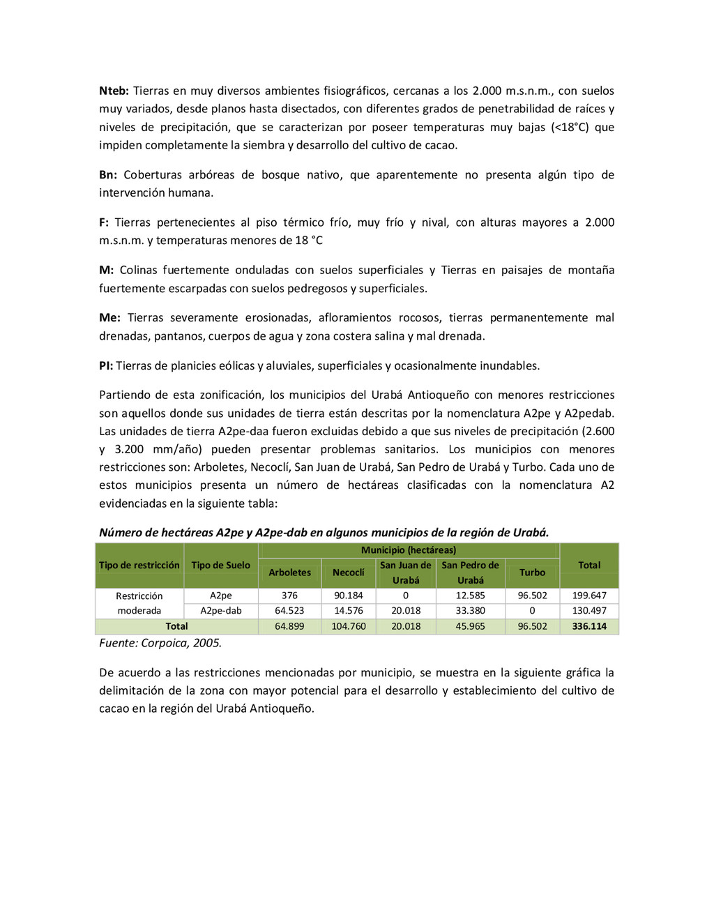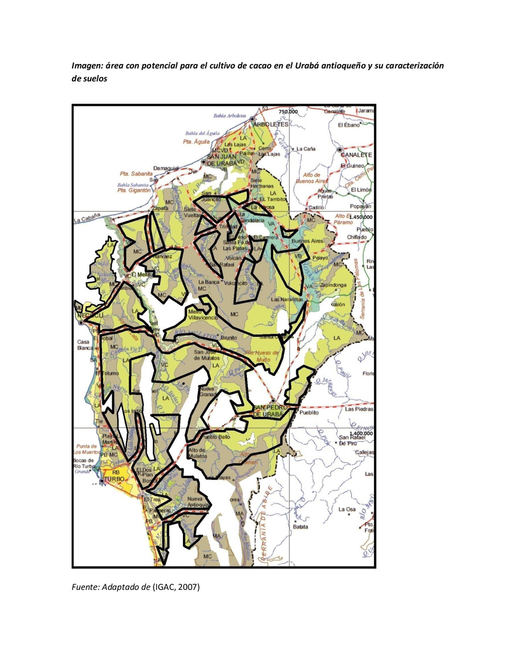 la cabecera municipal de San Juan de Urabá, a una altitud de 4 m.s.n.m. Su clasificación climática es Cálido húmedo. Balance hídrico del suelo en la estación SAN JUAN DE URABÁ Balance Hídrico del Suelo Mes TOTAL E F M A M J J A S O N D Temperatura (°C) 28,1 28,4 28,7 28,5 28,1 28 28,1 28 27,8 27,7 27,6 27,8 28,1 Evapotranspiración (mm) 167,6 159,4 185,9 180,7 176,9 170,9 175,4 171,8 161,2 157,1 150,2 156,6 2.013,8 Precipitación (mm) 35,3 36 44,4 140,5 275,9 227,4 218,1 263,6 232,8 238,4 232 123,2 2.067,6 Déficit (mm) 65,7 123 141,5 40,2 0 0 0 0 0 0 0 0 370,7 Reserva (mm) 67 0 0 0 0 99 100 100 100 100 100 100 67 Excedentes (mm) 0 0 0 0 0 55,4 42,7 91,8 71,6 81,3 81,8 0 424,6 Fuente: (IGAC, 2007). Estación ARBOLETES: Esta estación está ubicada en la cabecera municipal de Arboletes, a una altitud de 4 m.s.n.m. Su clasificación climática es Cálido Seco. Balance hídrico del suelo en la estación ARBOLETES Balance Hídrico del Suelo Mes TOTAL E F M A M J J A S O N D Temperatura (°C) 27,5 27,6 27,9 28 27,8 27,6 27,5 27,5 27,2 27,3 27,3 27,4 27,6 Evapotranspiración (mm) 153 141,4 165,5 168 169,4 161,4 162,1 160,5 147,7 149,9 144,1 149,2 1872,3 Precipitación (mm) 14,3 15,9 44,4 126,9 258,9 186,2 195,3 211,1 209 217,3 183,9 61,2 1.724,4 Déficit (mm) 126,7 125,5 121,1 41,1 0 0 0 0 0 0 0 0 414,4 Reserva (mm) 12 0 0 0 0 89,5 100 100 100 100 100 100 12 Excedentes (mm) 0 0 0 0 0 14,2 33,2 50,6 61,3 67,4 39,8 0 266,6 Fuente: (IGAC, 2007) Otras estaciones: A continuación se describen las variables climáticas generales para otras estaciones climatológicas de la región del Urabá antioqueño. N° Estación (IDEAM) Ubicación Latitud (Norte) Longitud (Oeste) Precipitación (mm) Temp. Media °C T. media máxima °C T. media mímima °C 1202503 El Mellito - Necoclí 8°32'45'' 76°40'16'' 1.827 26,7 30,8 23,5 1202501 Cabecera- Turbo 8°7'0'' 76°44'04'' 2.427 27,2 30,8 23,3 Fuente: (IDEAM, 2005)