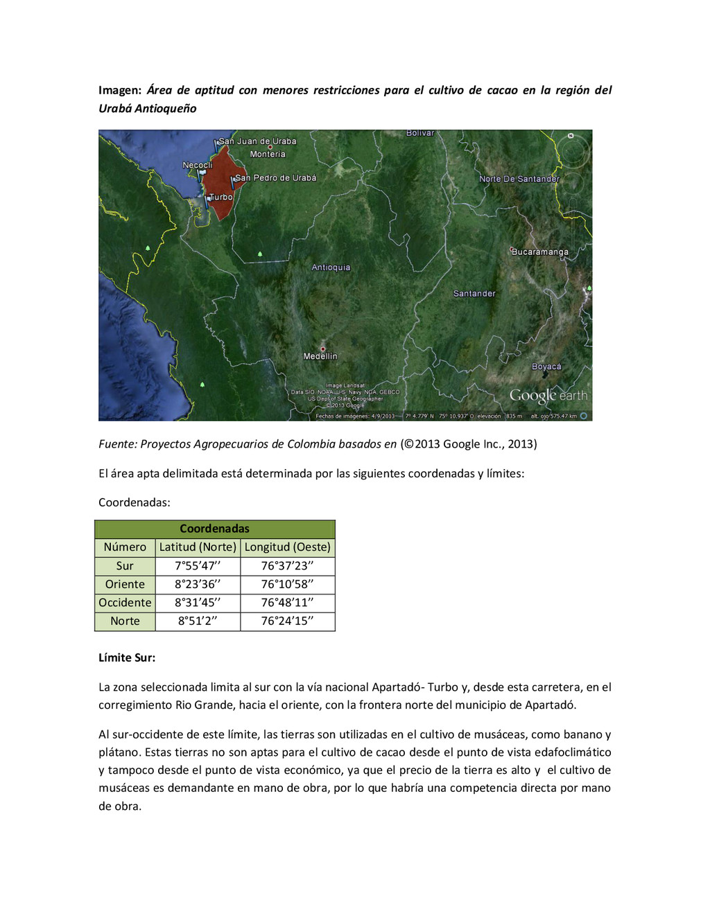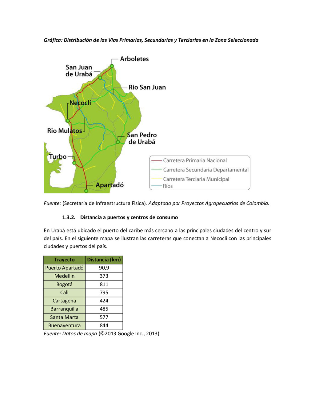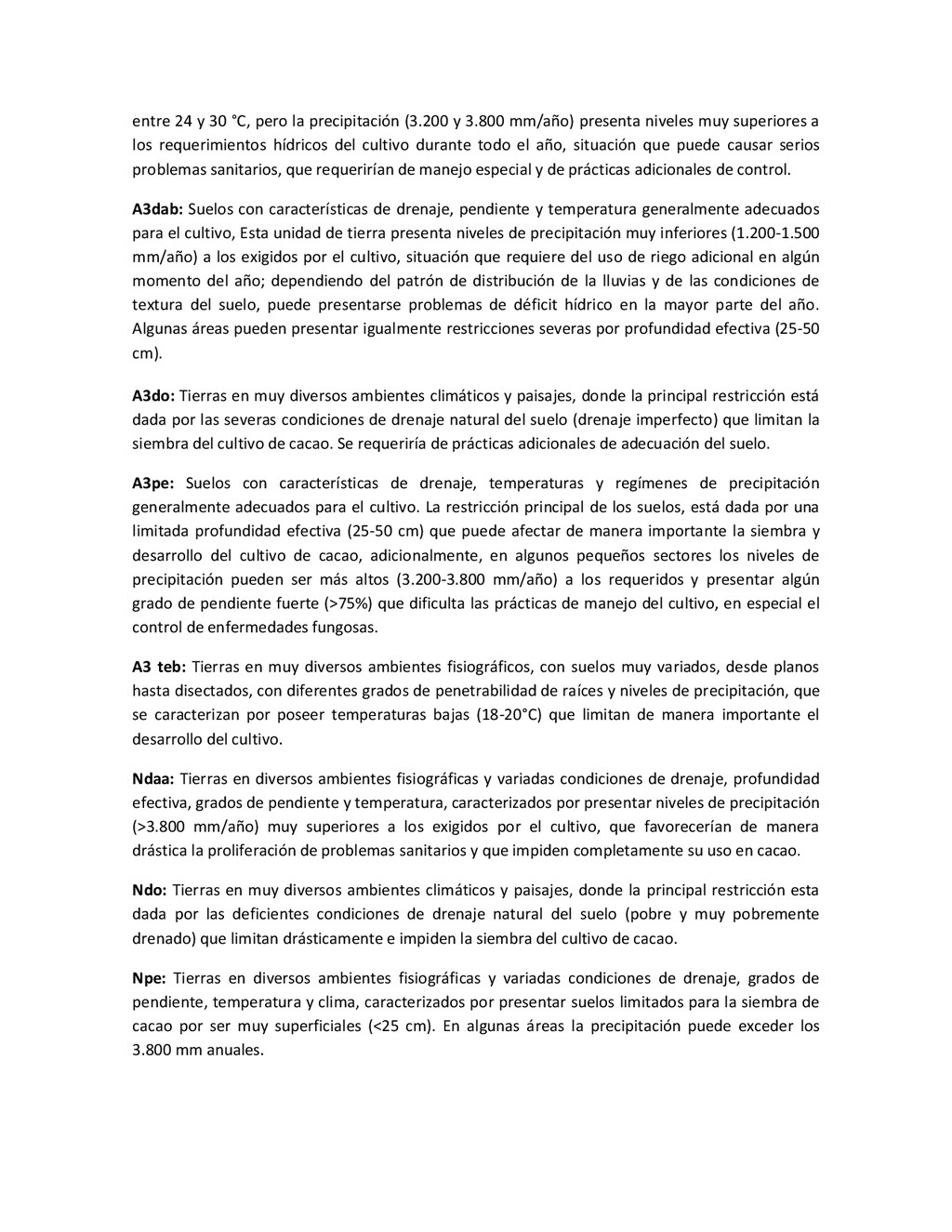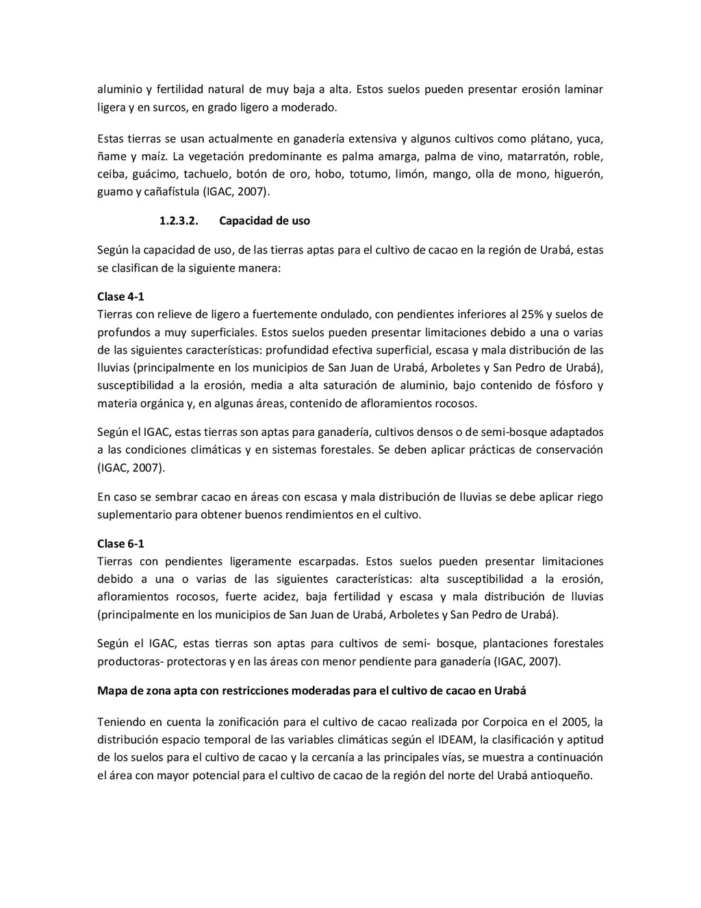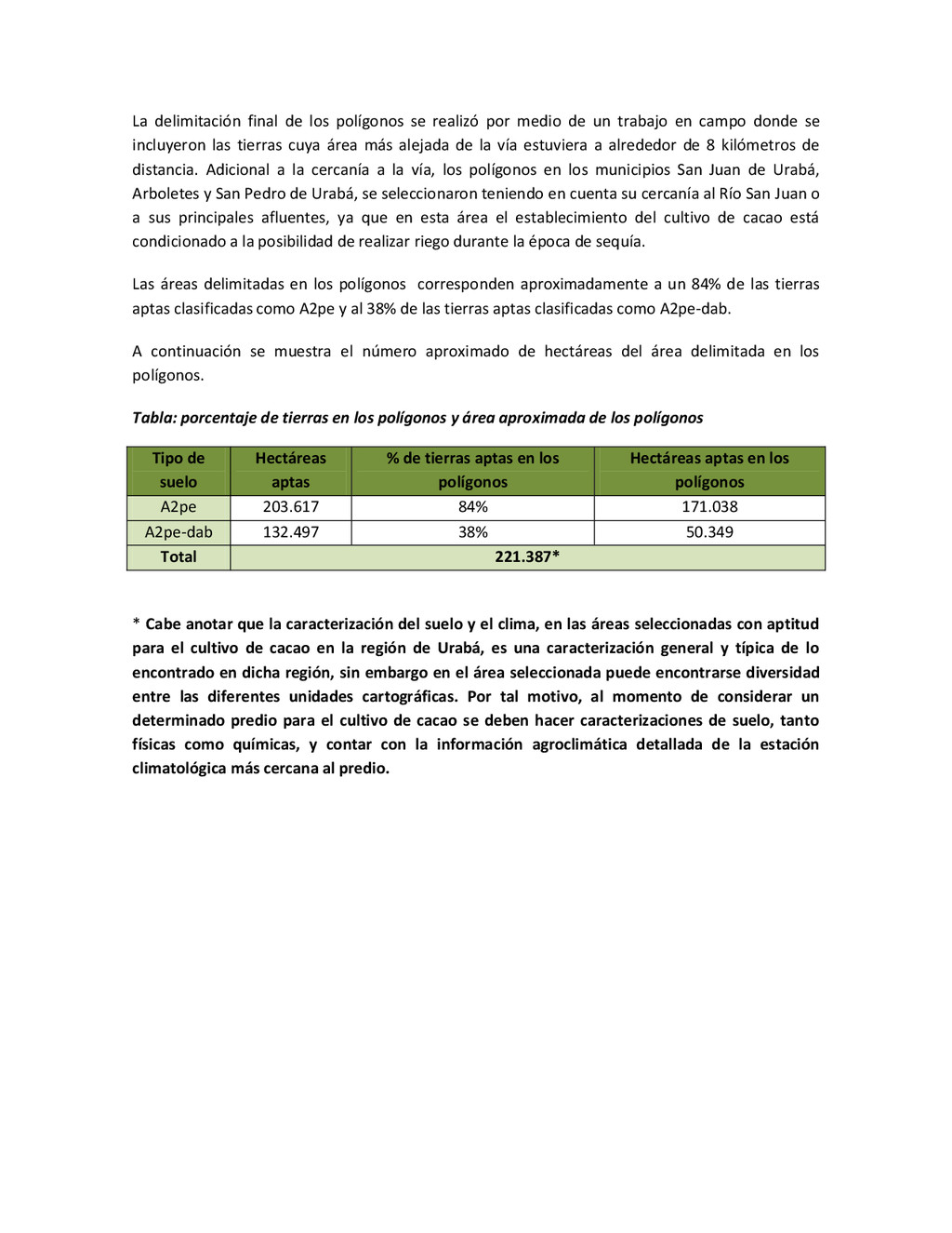 la cabecera municipal de San Juan de Urabá, a una altitud de 4 m.s.n.m. Su clasificación climática es Cálido húmedo. Balance hídrico del suelo en la estación SAN JUAN DE URABÁ Balance Hídrico del Suelo Mes TOTAL E F M A M J J A S O N D Temperatura (°C) 28,1 28,4 28,7 28,5 28,1 28 28,1 28 27,8 27,7 27,6 27,8 28,1 Evapotranspiración (mm) 167,6 159,4 185,9 180,7 176,9 170,9 175,4 171,8 161,2 157,1 150,2 156,6 2.013,8 Precipitación (mm) 35,3 36 44,4 140,5 275,9 227,4 218,1 263,6 232,8 238,4 232 123,2 2.067,6 Déficit (mm) 65,7 123 141,5 40,2 0 0 0 0 0 0 0 0 370,7 Reserva (mm) 67 0 0 0 0 99 100 100 100 100 100 100 67 Excedentes (mm) 0 0 0 0 0 55,4 42,7 91,8 71,6 81,3 81,8 0 424,6 Fuente: (IGAC, 2007). Estación ARBOLETES: Esta estación está ubicada en la cabecera municipal de Arboletes, a una altitud de 4 m.s.n.m. Su clasificación climática es Cálido Seco. Balance hídrico del suelo en la estación ARBOLETES Balance Hídrico del Suelo Mes TOTAL E F M A M J J A S O N D Temperatura (°C) 27,5 27,6 27,9 28 27,8 27,6 27,5 27,5 27,2 27,3 27,3 27,4 27,6 Evapotranspiración (mm) 153 141,4 165,5 168 169,4 161,4 162,1 160,5 147,7 149,9 144,1 149,2 1872,3 Precipitación (mm) 14,3 15,9 44,4 126,9 258,9 186,2 195,3 211,1 209 217,3 183,9 61,2 1.724,4 Déficit (mm) 126,7 125,5 121,1 41,1 0 0 0 0 0 0 0 0 414,4 Reserva (mm) 12 0 0 0 0 89,5 100 100 100 100 100 100 12 Excedentes (mm) 0 0 0 0 0 14,2 33,2 50,6 61,3 67,4 39,8 0 266,6 Fuente: (IGAC, 2007) Otras estaciones: A continuación se describen las variables climáticas generales para otras estaciones climatológicas de la región del Urabá antioqueño. N° Estación (IDEAM) Ubicación Latitud (Norte) Longitud (Oeste) Precipitación (mm) Temp. Media °C T. media máxima °C T. media mímima °C 1202503 El Mellito - Necoclí 8°32'45'' 76°40'16'' 1.827 26,7 30,8 23,5 1202501 Cabecera- Turbo 8°7'0'' 76°44'04'' 2.427 27,2 30,8 23,3 Fuente: (IDEAM, 2005)