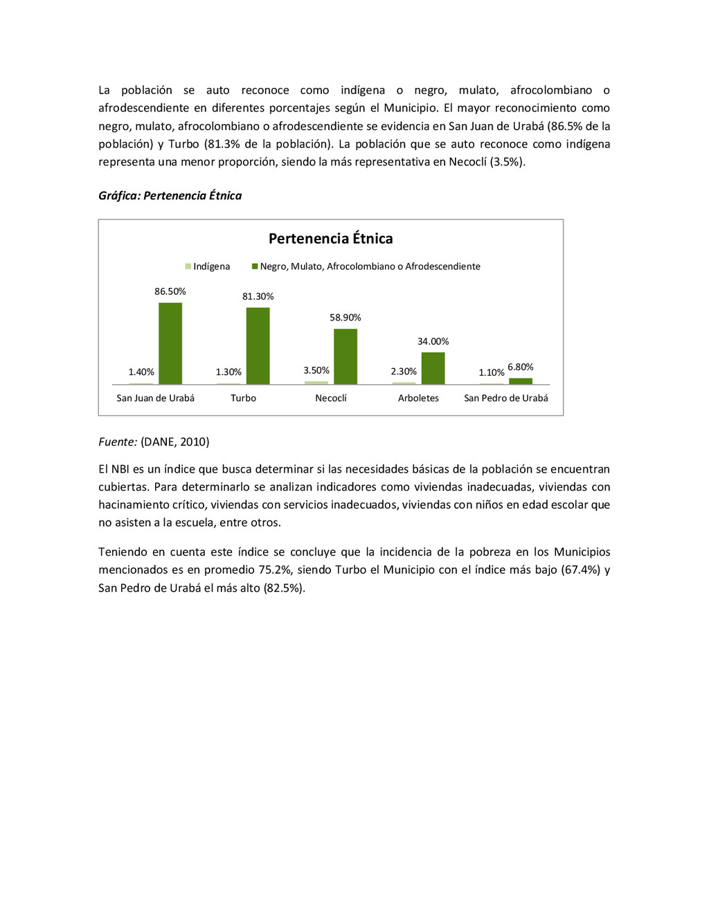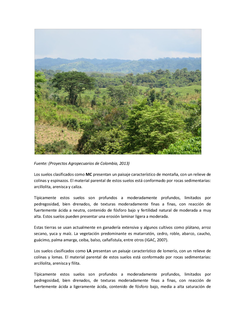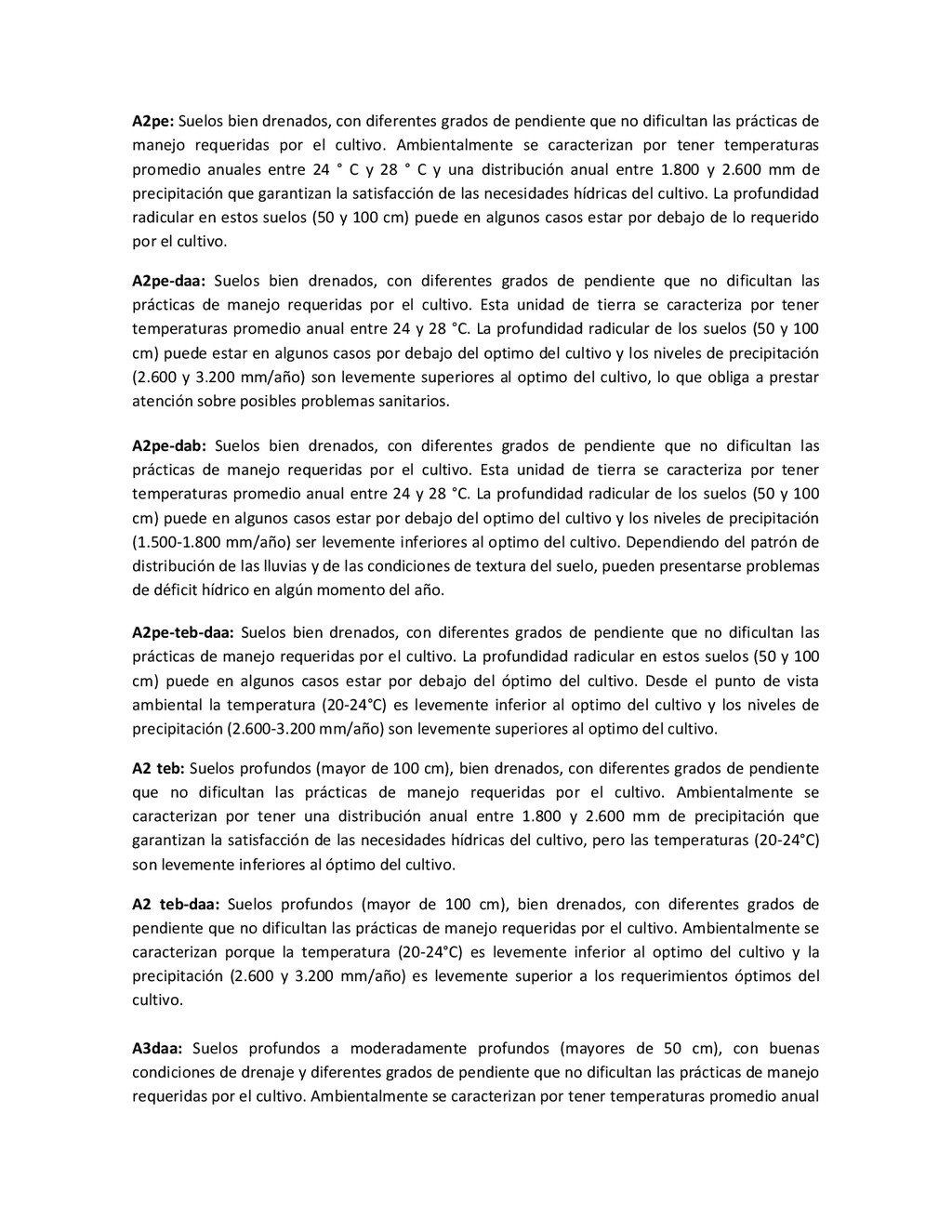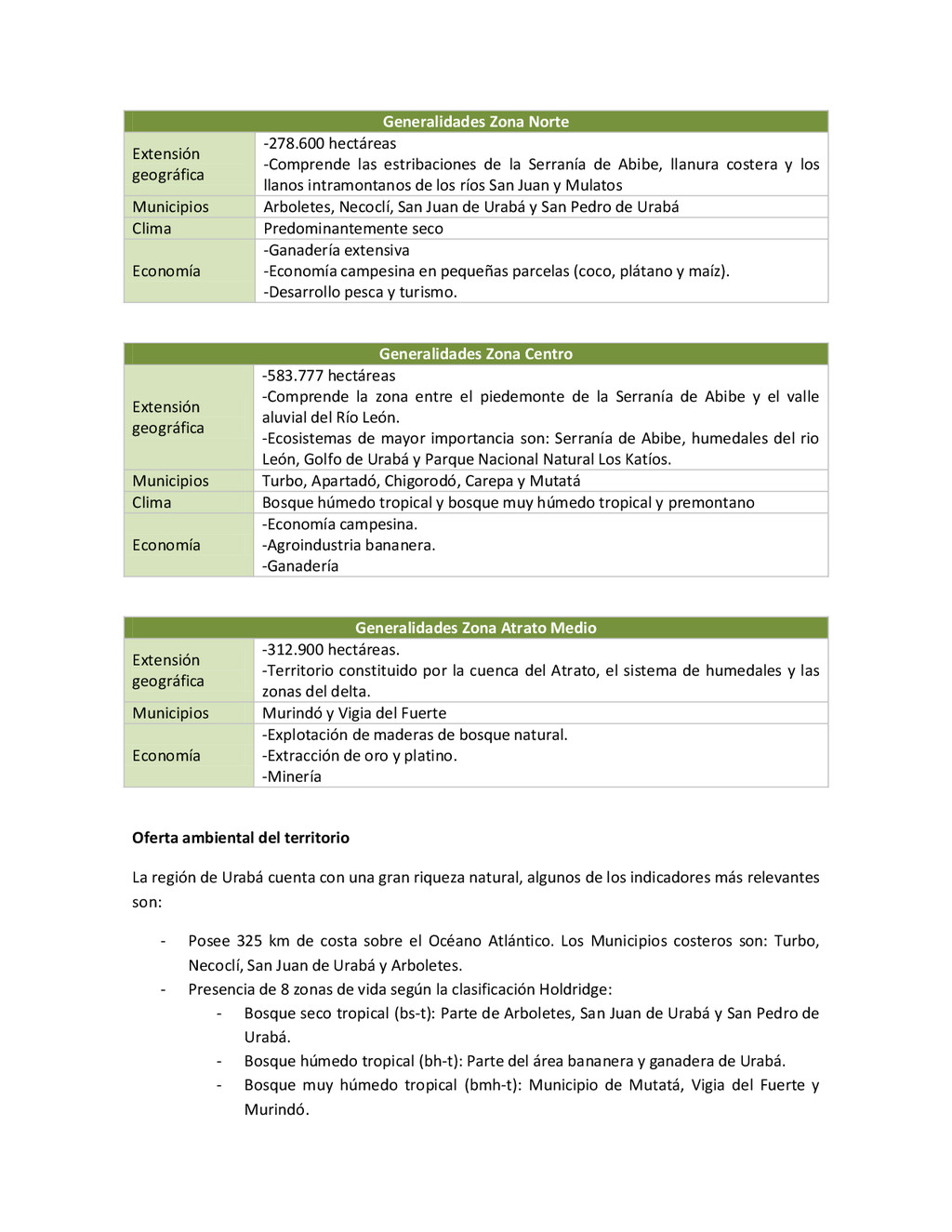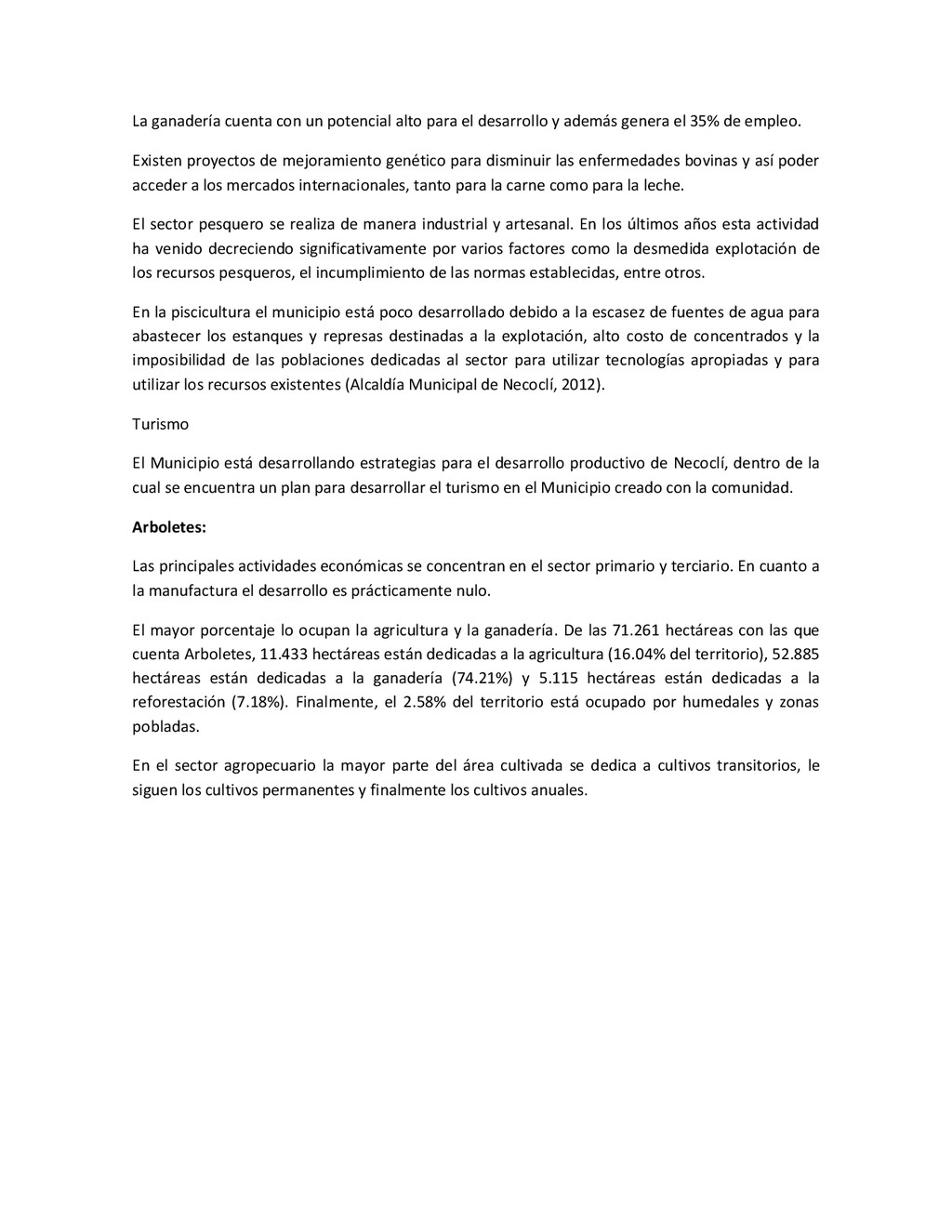 la cabecera municipal de San Juan de Urabá, a una altitud de 4 m.s.n.m. Su clasificación climática es Cálido húmedo. Balance hídrico del suelo en la estación SAN JUAN DE URABÁ Balance Hídrico del Suelo Mes TOTAL E F M A M J J A S O N D Temperatura (°C) 28,1 28,4 28,7 28,5 28,1 28 28,1 28 27,8 27,7 27,6 27,8 28,1 Evapotranspiración (mm) 167,6 159,4 185,9 180,7 176,9 170,9 175,4 171,8 161,2 157,1 150,2 156,6 2.013,8 Precipitación (mm) 35,3 36 44,4 140,5 275,9 227,4 218,1 263,6 232,8 238,4 232 123,2 2.067,6 Déficit (mm) 65,7 123 141,5 40,2 0 0 0 0 0 0 0 0 370,7 Reserva (mm) 67 0 0 0 0 99 100 100 100 100 100 100 67 Excedentes (mm) 0 0 0 0 0 55,4 42,7 91,8 71,6 81,3 81,8 0 424,6 Fuente: (IGAC, 2007). Estación ARBOLETES: Esta estación está ubicada en la cabecera municipal de Arboletes, a una altitud de 4 m.s.n.m. Su clasificación climática es Cálido Seco. Balance hídrico del suelo en la estación ARBOLETES Balance Hídrico del Suelo Mes TOTAL E F M A M J J A S O N D Temperatura (°C) 27,5 27,6 27,9 28 27,8 27,6 27,5 27,5 27,2 27,3 27,3 27,4 27,6 Evapotranspiración (mm) 153 141,4 165,5 168 169,4 161,4 162,1 160,5 147,7 149,9 144,1 149,2 1872,3 Precipitación (mm) 14,3 15,9 44,4 126,9 258,9 186,2 195,3 211,1 209 217,3 183,9 61,2 1.724,4 Déficit (mm) 126,7 125,5 121,1 41,1 0 0 0 0 0 0 0 0 414,4 Reserva (mm) 12 0 0 0 0 89,5 100 100 100 100 100 100 12 Excedentes (mm) 0 0 0 0 0 14,2 33,2 50,6 61,3 67,4 39,8 0 266,6 Fuente: (IGAC, 2007) Otras estaciones: A continuación se describen las variables climáticas generales para otras estaciones climatológicas de la región del Urabá antioqueño. N° Estación (IDEAM) Ubicación Latitud (Norte) Longitud (Oeste) Precipitación (mm) Temp. Media °C T. media máxima °C T. media mímima °C 1202503 El Mellito - Necoclí 8°32'45'' 76°40'16'' 1.827 26,7 30,8 23,5 1202501 Cabecera- Turbo 8°7'0'' 76°44'04'' 2.427 27,2 30,8 23,3 Fuente: (IDEAM, 2005)