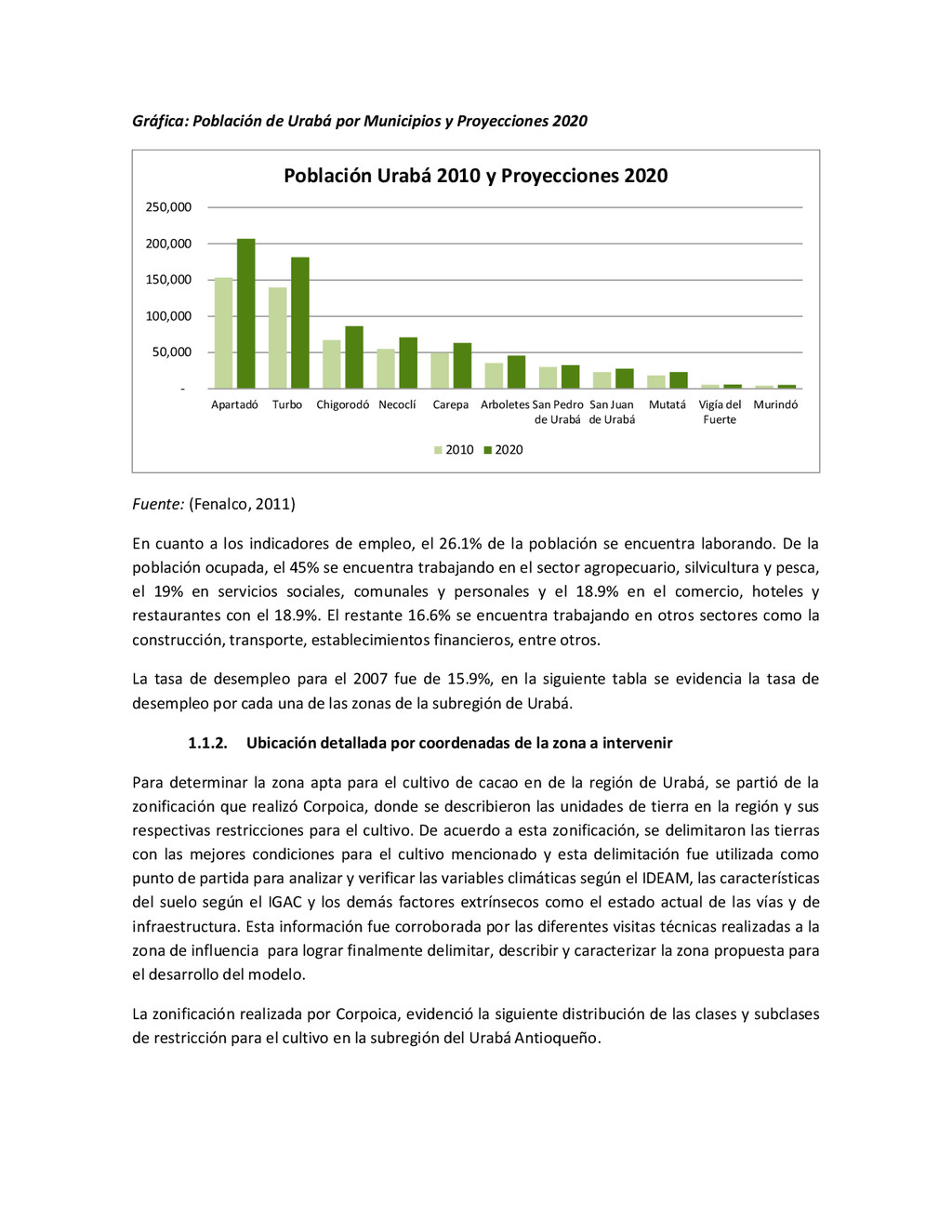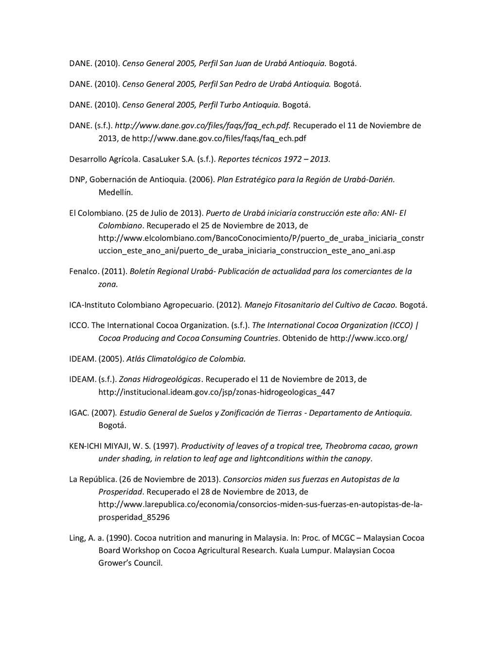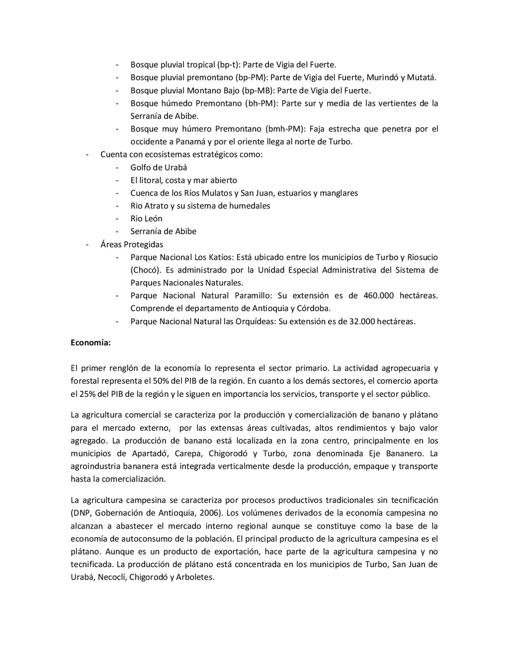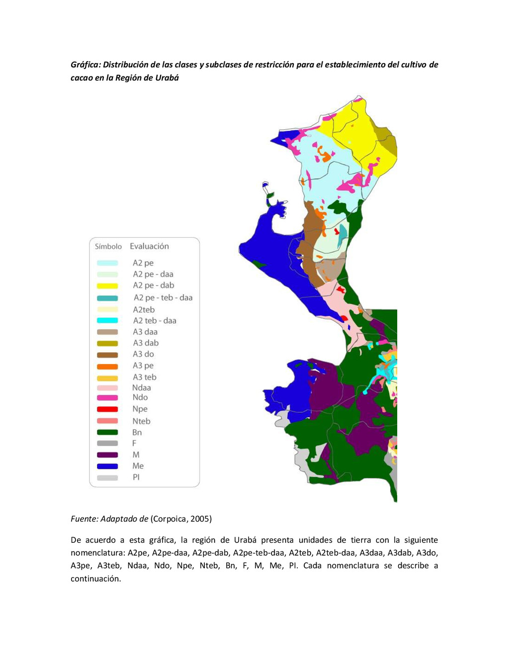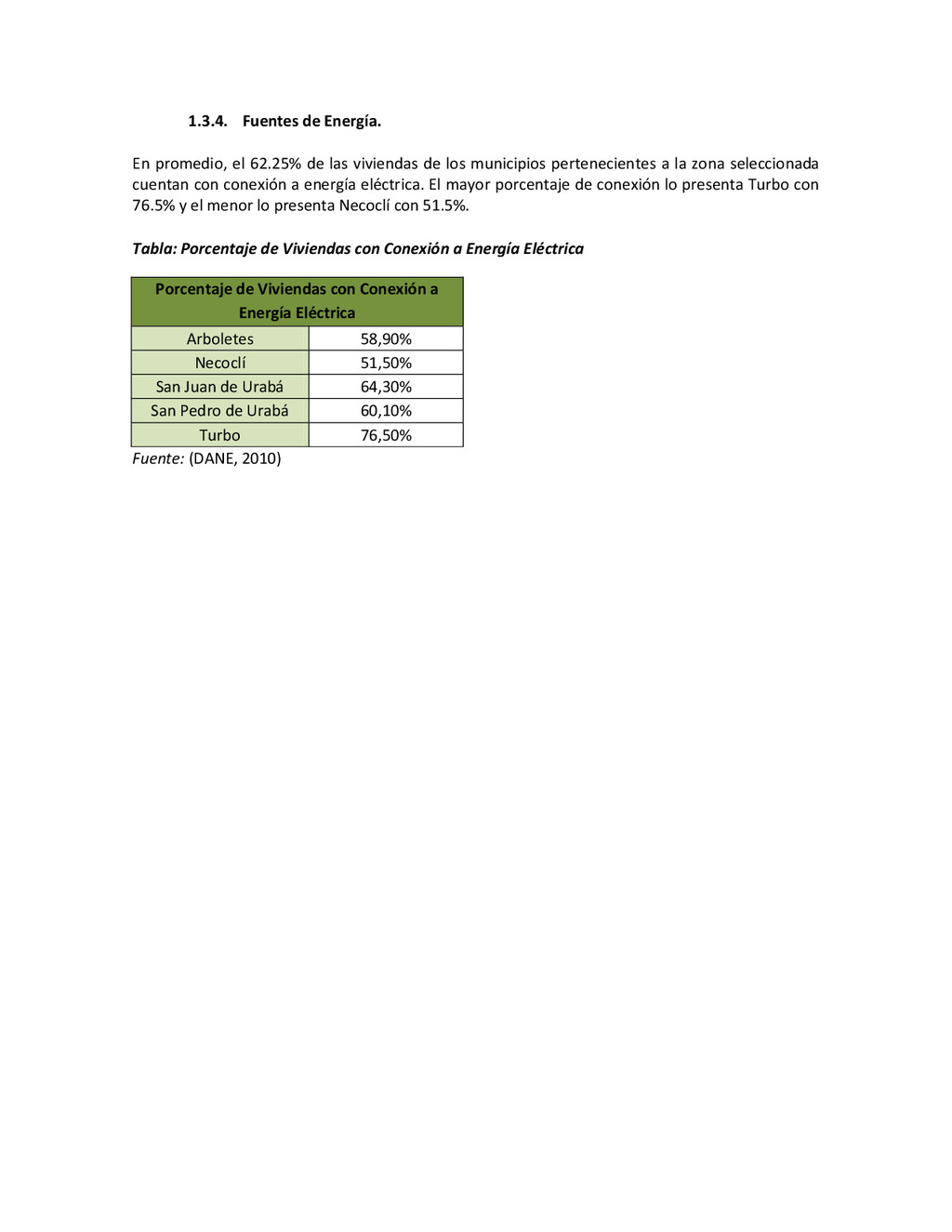 la cabecera municipal de San Juan de Urabá, a una altitud de 4 m.s.n.m. Su clasificación climática es Cálido húmedo. Balance hídrico del suelo en la estación SAN JUAN DE URABÁ Balance Hídrico del Suelo Mes TOTAL E F M A M J J A S O N D Temperatura (°C) 28,1 28,4 28,7 28,5 28,1 28 28,1 28 27,8 27,7 27,6 27,8 28,1 Evapotranspiración (mm) 167,6 159,4 185,9 180,7 176,9 170,9 175,4 171,8 161,2 157,1 150,2 156,6 2.013,8 Precipitación (mm) 35,3 36 44,4 140,5 275,9 227,4 218,1 263,6 232,8 238,4 232 123,2 2.067,6 Déficit (mm) 65,7 123 141,5 40,2 0 0 0 0 0 0 0 0 370,7 Reserva (mm) 67 0 0 0 0 99 100 100 100 100 100 100 67 Excedentes (mm) 0 0 0 0 0 55,4 42,7 91,8 71,6 81,3 81,8 0 424,6 Fuente: (IGAC, 2007). Estación ARBOLETES: Esta estación está ubicada en la cabecera municipal de Arboletes, a una altitud de 4 m.s.n.m. Su clasificación climática es Cálido Seco. Balance hídrico del suelo en la estación ARBOLETES Balance Hídrico del Suelo Mes TOTAL E F M A M J J A S O N D Temperatura (°C) 27,5 27,6 27,9 28 27,8 27,6 27,5 27,5 27,2 27,3 27,3 27,4 27,6 Evapotranspiración (mm) 153 141,4 165,5 168 169,4 161,4 162,1 160,5 147,7 149,9 144,1 149,2 1872,3 Precipitación (mm) 14,3 15,9 44,4 126,9 258,9 186,2 195,3 211,1 209 217,3 183,9 61,2 1.724,4 Déficit (mm) 126,7 125,5 121,1 41,1 0 0 0 0 0 0 0 0 414,4 Reserva (mm) 12 0 0 0 0 89,5 100 100 100 100 100 100 12 Excedentes (mm) 0 0 0 0 0 14,2 33,2 50,6 61,3 67,4 39,8 0 266,6 Fuente: (IGAC, 2007) Otras estaciones: A continuación se describen las variables climáticas generales para otras estaciones climatológicas de la región del Urabá antioqueño. N° Estación (IDEAM) Ubicación Latitud (Norte) Longitud (Oeste) Precipitación (mm) Temp. Media °C T. media máxima °C T. media mímima °C 1202503 El Mellito - Necoclí 8°32'45'' 76°40'16'' 1.827 26,7 30,8 23,5 1202501 Cabecera- Turbo 8°7'0'' 76°44'04'' 2.427 27,2 30,8 23,3 Fuente: (IDEAM, 2005)