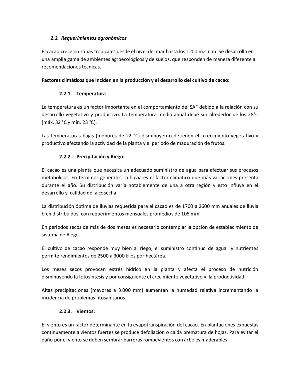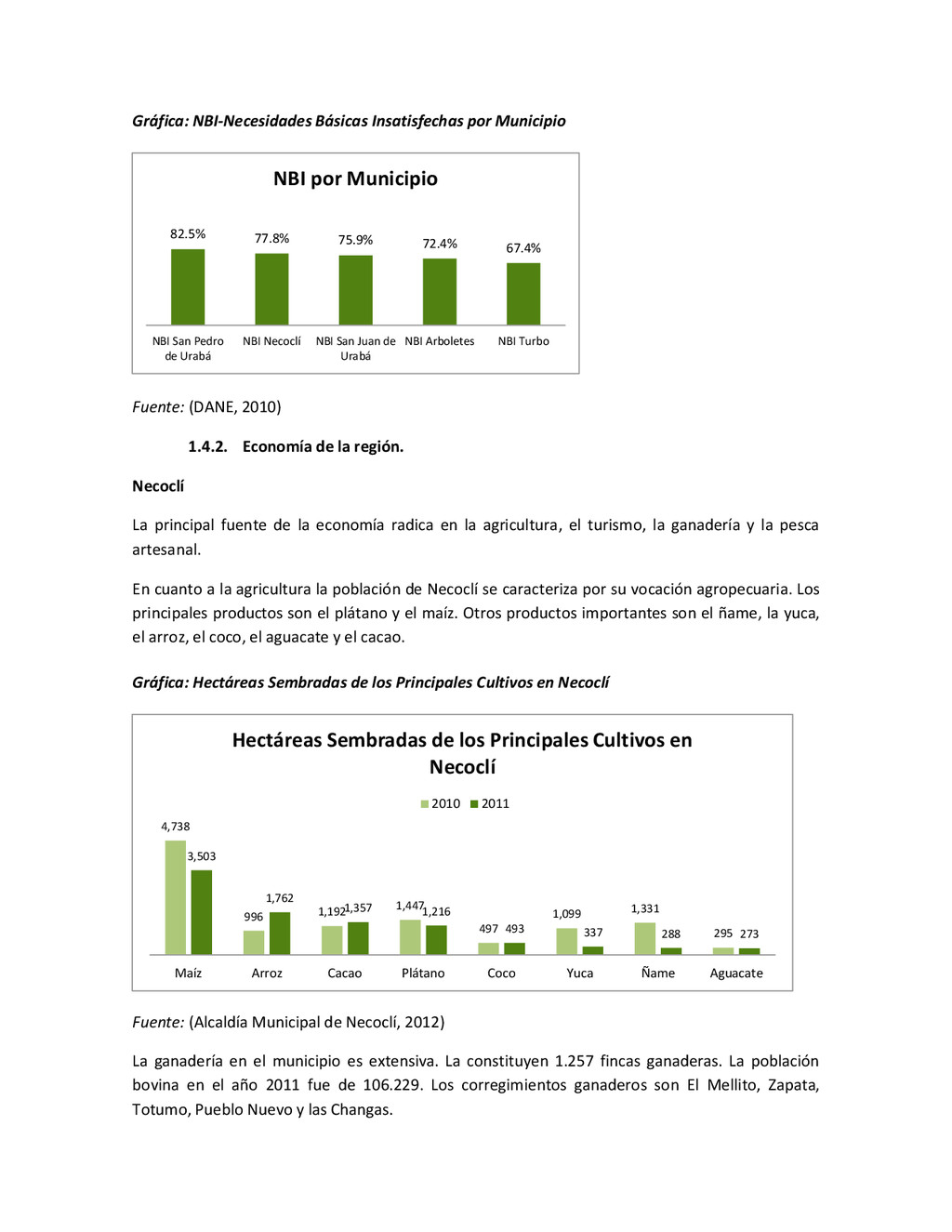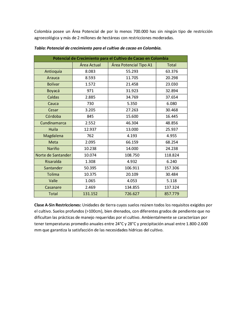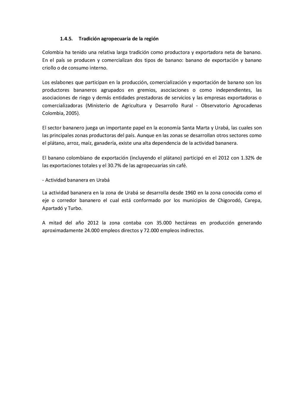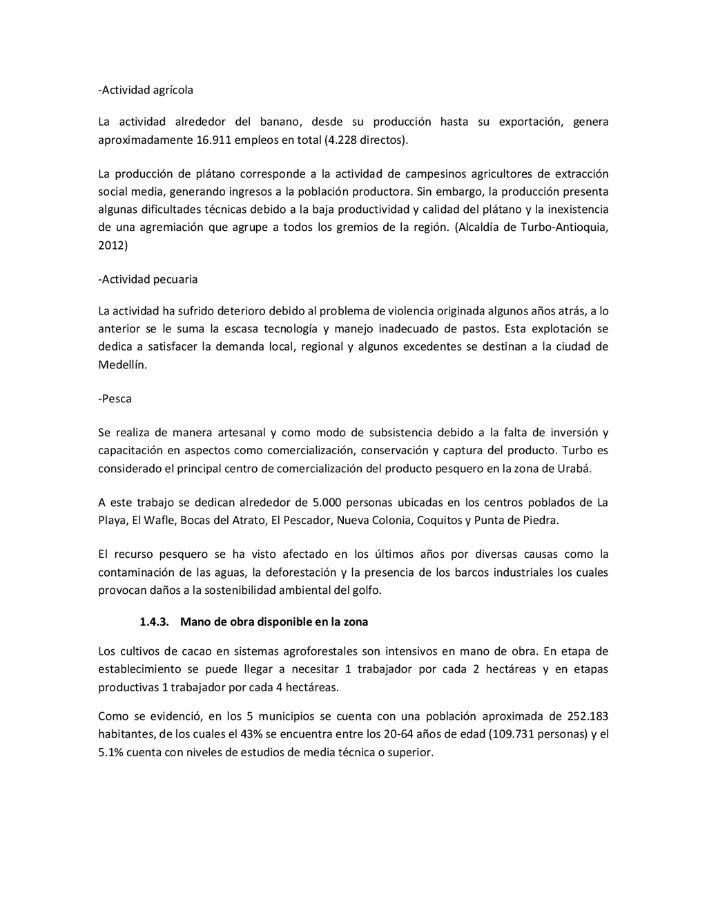 la cabecera municipal de San Juan de Urabá, a una altitud de 4 m.s.n.m. Su clasificación climática es Cálido húmedo. Balance hídrico del suelo en la estación SAN JUAN DE URABÁ Balance Hídrico del Suelo Mes TOTAL E F M A M J J A S O N D Temperatura (°C) 28,1 28,4 28,7 28,5 28,1 28 28,1 28 27,8 27,7 27,6 27,8 28,1 Evapotranspiración (mm) 167,6 159,4 185,9 180,7 176,9 170,9 175,4 171,8 161,2 157,1 150,2 156,6 2.013,8 Precipitación (mm) 35,3 36 44,4 140,5 275,9 227,4 218,1 263,6 232,8 238,4 232 123,2 2.067,6 Déficit (mm) 65,7 123 141,5 40,2 0 0 0 0 0 0 0 0 370,7 Reserva (mm) 67 0 0 0 0 99 100 100 100 100 100 100 67 Excedentes (mm) 0 0 0 0 0 55,4 42,7 91,8 71,6 81,3 81,8 0 424,6 Fuente: (IGAC, 2007). Estación ARBOLETES: Esta estación está ubicada en la cabecera municipal de Arboletes, a una altitud de 4 m.s.n.m. Su clasificación climática es Cálido Seco. Balance hídrico del suelo en la estación ARBOLETES Balance Hídrico del Suelo Mes TOTAL E F M A M J J A S O N D Temperatura (°C) 27,5 27,6 27,9 28 27,8 27,6 27,5 27,5 27,2 27,3 27,3 27,4 27,6 Evapotranspiración (mm) 153 141,4 165,5 168 169,4 161,4 162,1 160,5 147,7 149,9 144,1 149,2 1872,3 Precipitación (mm) 14,3 15,9 44,4 126,9 258,9 186,2 195,3 211,1 209 217,3 183,9 61,2 1.724,4 Déficit (mm) 126,7 125,5 121,1 41,1 0 0 0 0 0 0 0 0 414,4 Reserva (mm) 12 0 0 0 0 89,5 100 100 100 100 100 100 12 Excedentes (mm) 0 0 0 0 0 14,2 33,2 50,6 61,3 67,4 39,8 0 266,6 Fuente: (IGAC, 2007) Otras estaciones: A continuación se describen las variables climáticas generales para otras estaciones climatológicas de la región del Urabá antioqueño. N° Estación (IDEAM) Ubicación Latitud (Norte) Longitud (Oeste) Precipitación (mm) Temp. Media °C T. media máxima °C T. media mímima °C 1202503 El Mellito - Necoclí 8°32'45'' 76°40'16'' 1.827 26,7 30,8 23,5 1202501 Cabecera- Turbo 8°7'0'' 76°44'04'' 2.427 27,2 30,8 23,3 Fuente: (IDEAM, 2005)