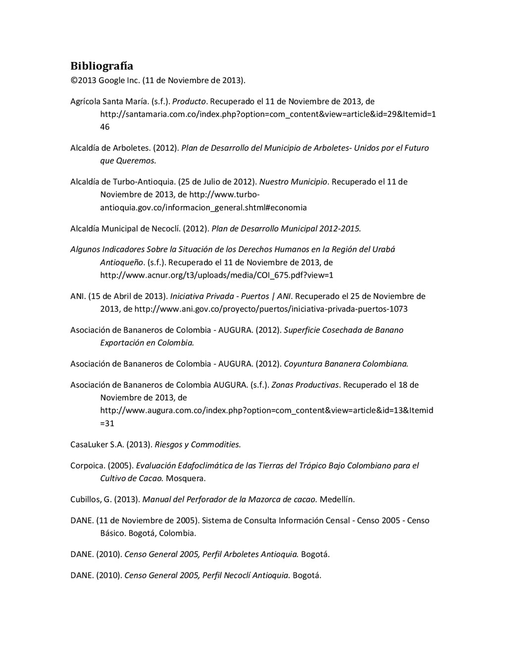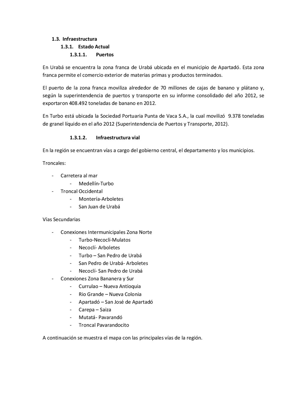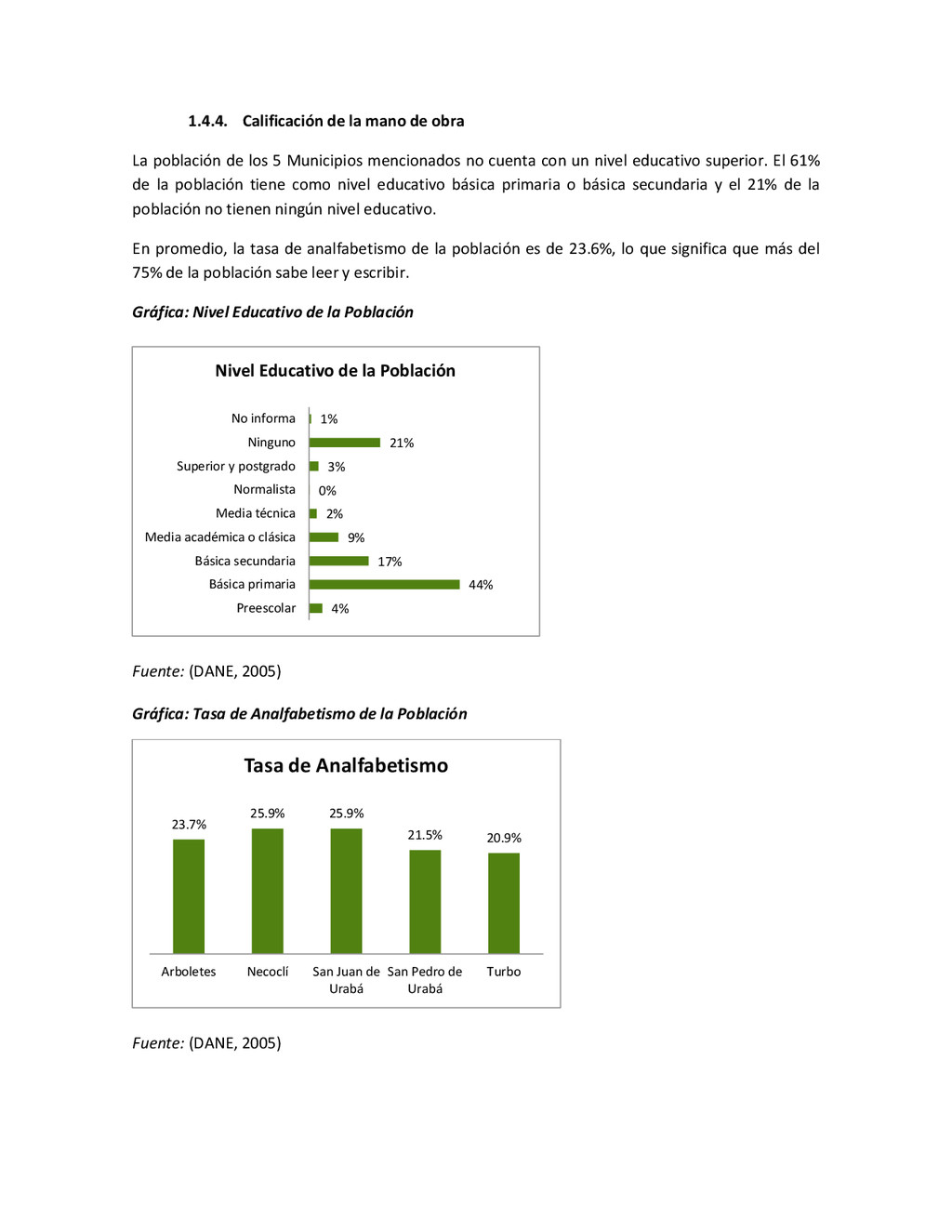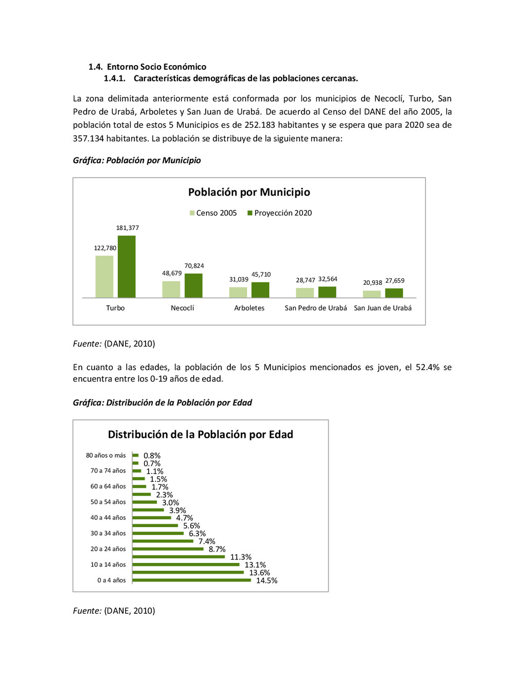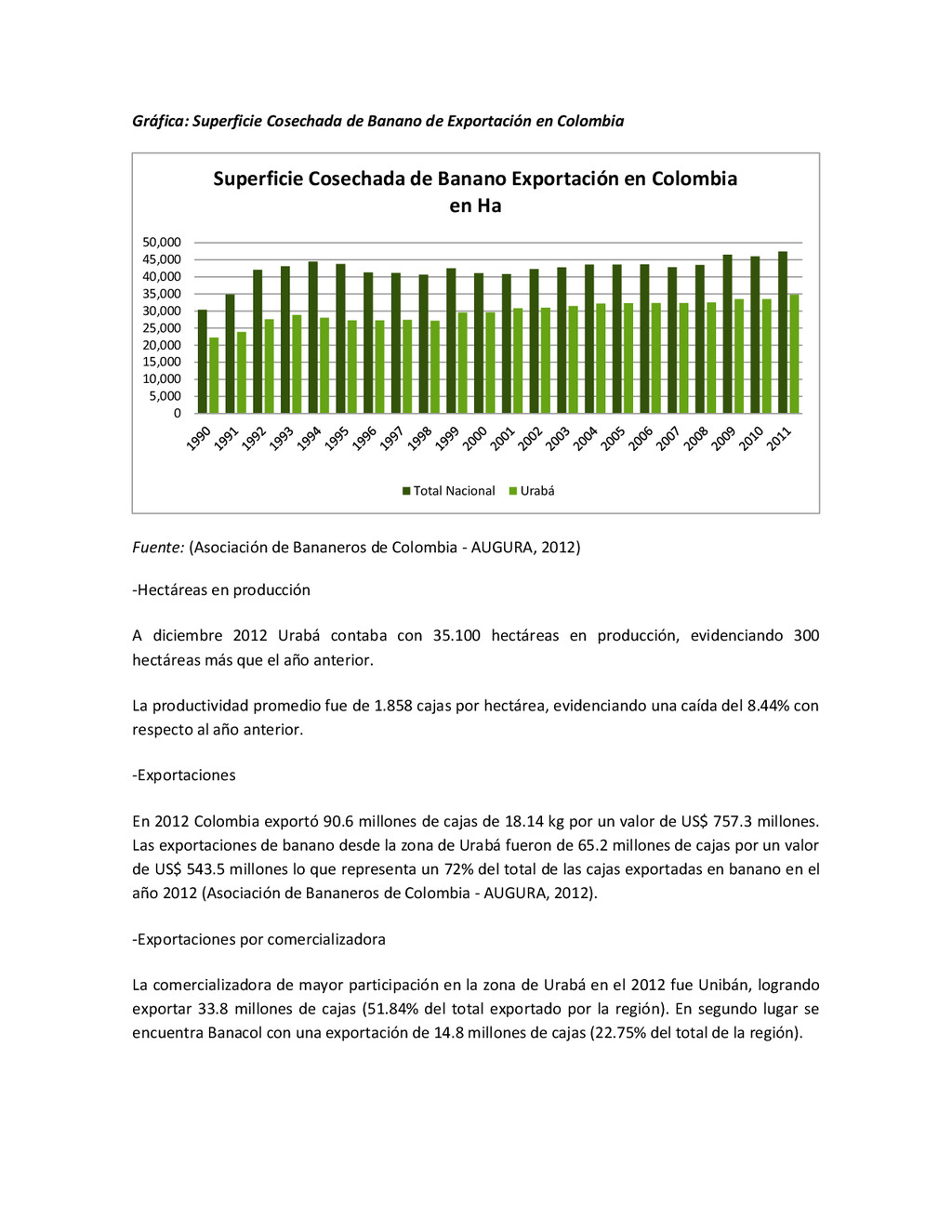 la cabecera municipal de San Juan de Urabá, a una altitud de 4 m.s.n.m. Su clasificación climática es Cálido húmedo. Balance hídrico del suelo en la estación SAN JUAN DE URABÁ Balance Hídrico del Suelo Mes TOTAL E F M A M J J A S O N D Temperatura (°C) 28,1 28,4 28,7 28,5 28,1 28 28,1 28 27,8 27,7 27,6 27,8 28,1 Evapotranspiración (mm) 167,6 159,4 185,9 180,7 176,9 170,9 175,4 171,8 161,2 157,1 150,2 156,6 2.013,8 Precipitación (mm) 35,3 36 44,4 140,5 275,9 227,4 218,1 263,6 232,8 238,4 232 123,2 2.067,6 Déficit (mm) 65,7 123 141,5 40,2 0 0 0 0 0 0 0 0 370,7 Reserva (mm) 67 0 0 0 0 99 100 100 100 100 100 100 67 Excedentes (mm) 0 0 0 0 0 55,4 42,7 91,8 71,6 81,3 81,8 0 424,6 Fuente: (IGAC, 2007). Estación ARBOLETES: Esta estación está ubicada en la cabecera municipal de Arboletes, a una altitud de 4 m.s.n.m. Su clasificación climática es Cálido Seco. Balance hídrico del suelo en la estación ARBOLETES Balance Hídrico del Suelo Mes TOTAL E F M A M J J A S O N D Temperatura (°C) 27,5 27,6 27,9 28 27,8 27,6 27,5 27,5 27,2 27,3 27,3 27,4 27,6 Evapotranspiración (mm) 153 141,4 165,5 168 169,4 161,4 162,1 160,5 147,7 149,9 144,1 149,2 1872,3 Precipitación (mm) 14,3 15,9 44,4 126,9 258,9 186,2 195,3 211,1 209 217,3 183,9 61,2 1.724,4 Déficit (mm) 126,7 125,5 121,1 41,1 0 0 0 0 0 0 0 0 414,4 Reserva (mm) 12 0 0 0 0 89,5 100 100 100 100 100 100 12 Excedentes (mm) 0 0 0 0 0 14,2 33,2 50,6 61,3 67,4 39,8 0 266,6 Fuente: (IGAC, 2007) Otras estaciones: A continuación se describen las variables climáticas generales para otras estaciones climatológicas de la región del Urabá antioqueño. N° Estación (IDEAM) Ubicación Latitud (Norte) Longitud (Oeste) Precipitación (mm) Temp. Media °C T. media máxima °C T. media mímima °C 1202503 El Mellito - Necoclí 8°32'45'' 76°40'16'' 1.827 26,7 30,8 23,5 1202501 Cabecera- Turbo 8°7'0'' 76°44'04'' 2.427 27,2 30,8 23,3 Fuente: (IDEAM, 2005)