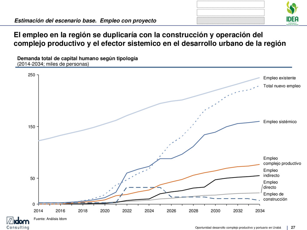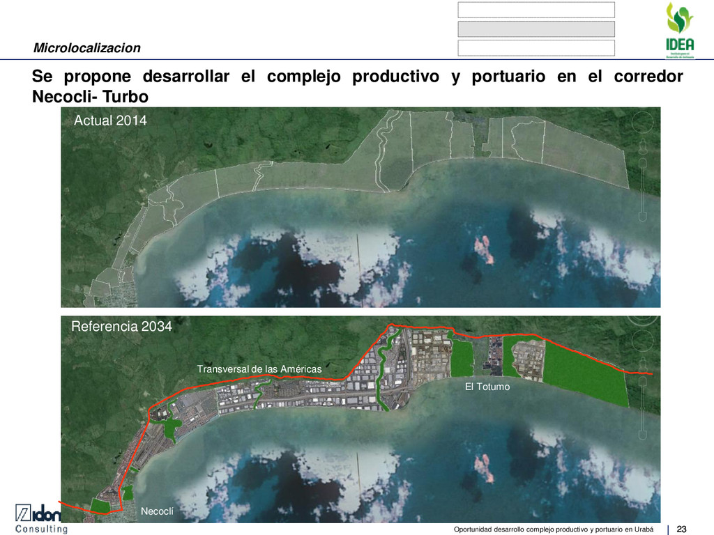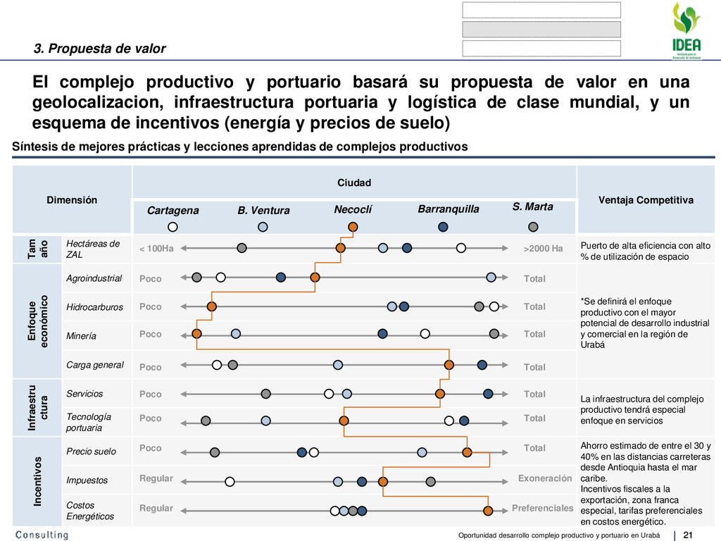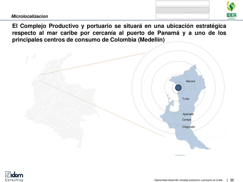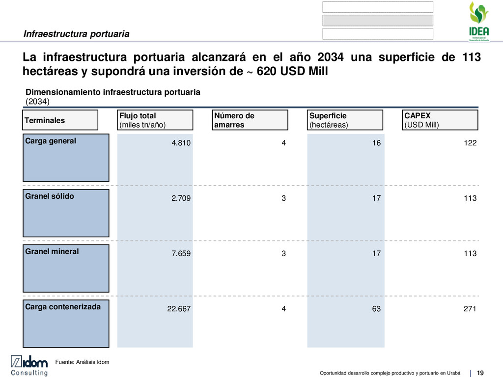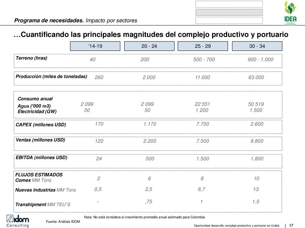 El proyecto portuario en Urabá parte del desarrollo de un Complejo productivo con actividad industrial e industrias ancla, servicios portuarios y logísticos, infraestructura de servicios, utilities y equipamientos en la región generando un impacto positivo en el desarrollo de la población. • Terminarles portuarias • Zona de actividades logísticas (ZAL) • Servicios industriales: Logísticos ; Servicios industriales: o&m, construcción, • Zonas francas • Vivienda por estratos • Serv públicos Abastecimiento, saneamiento, residuos y otros • Sanidad: hospitales nivel III • Conocimiento: Formación técnica, tecnológica y superior • Otros Equip.: comercial, cultural, deportivo Servicios de complejo portuario- productivo Impacto estructura urbana • Atracción de comercio exterior (Ahorro logístico, transbordo) • Desarrollo de nuevos sectores no presenten en Colombia (Coste energético, TLC frente a EU, reemplazo importaciones en la región caribe- Andes) • Relocalización de industrias existentes en la región de Antioquia Sectores ancla y cadenas de valor objetivo asociadas • Infraestructura de transporte: • Carreteras • Otras • Otras infraestructuras: Energía, gas, agua Infraestructuras del complejo portuario - productivo II III I IV Enfoque Fuente: Análisis IDOM