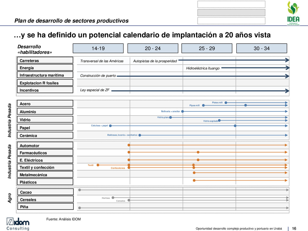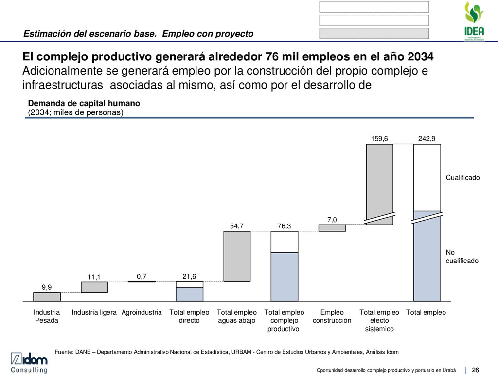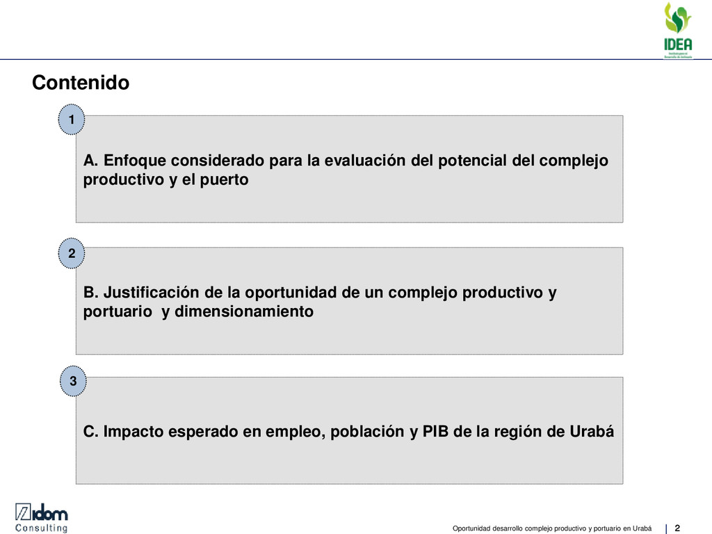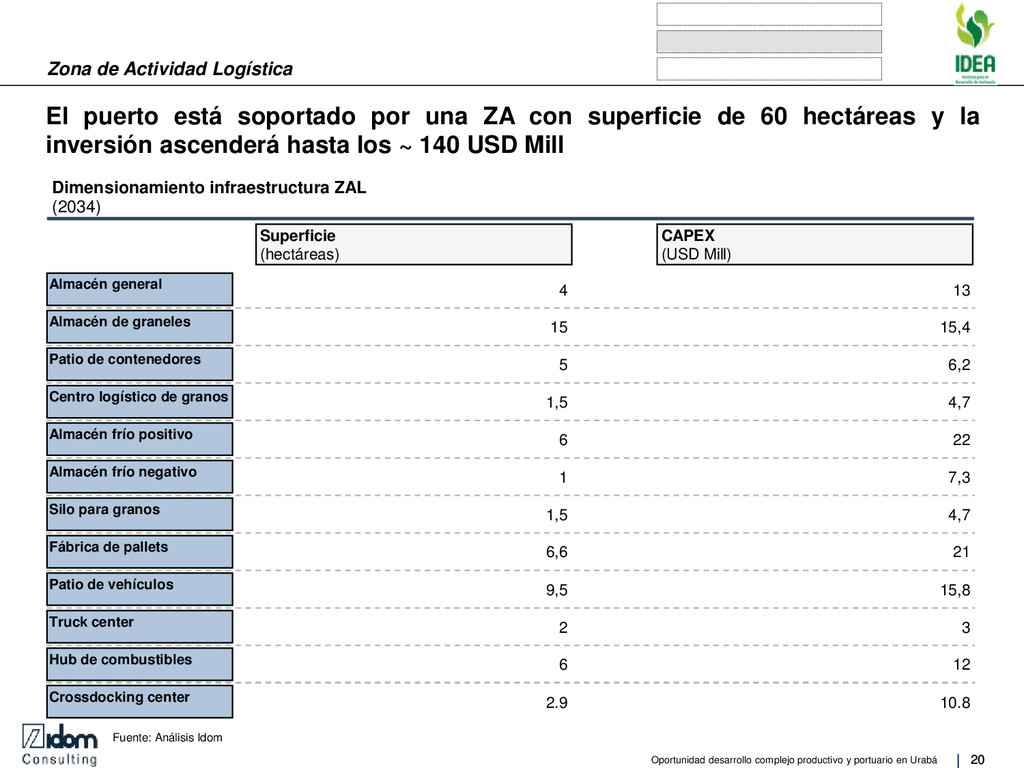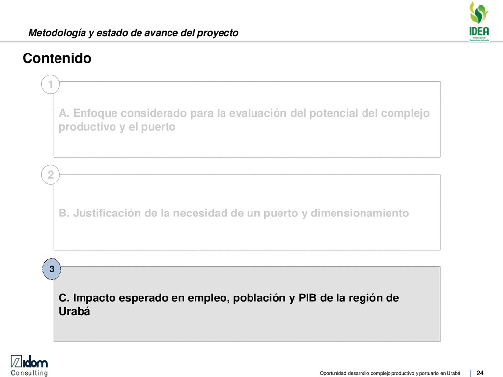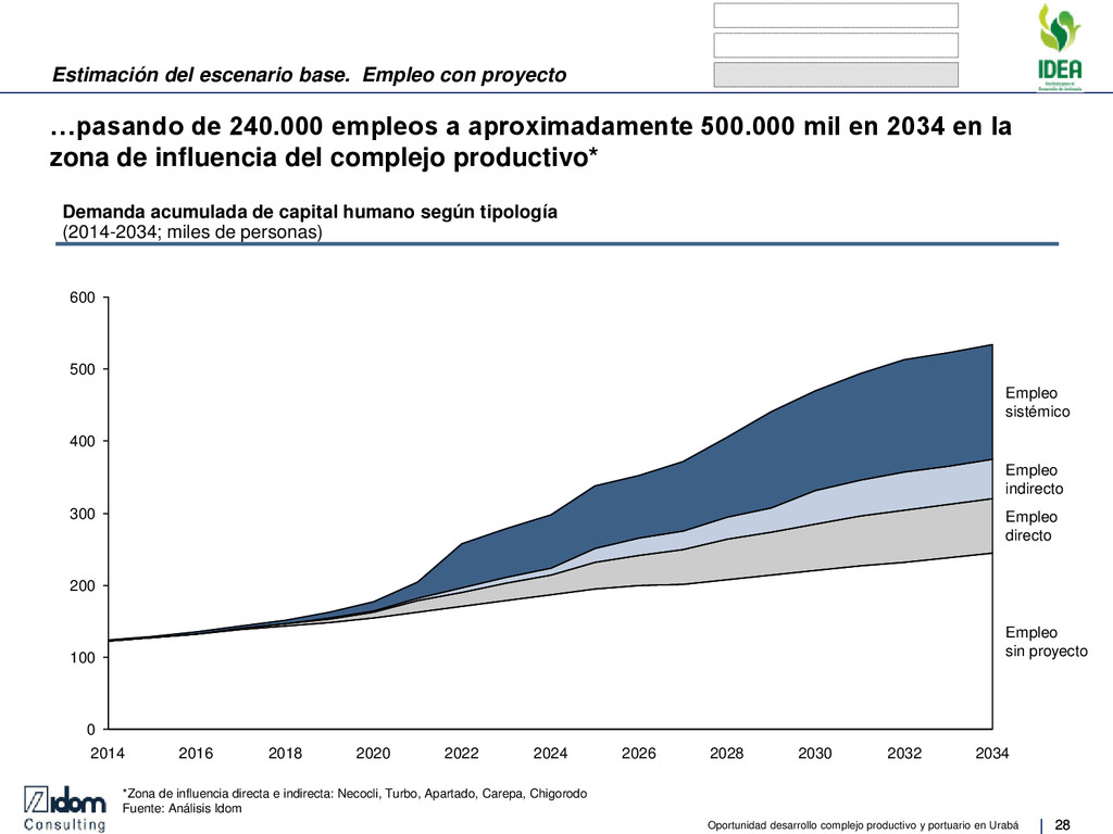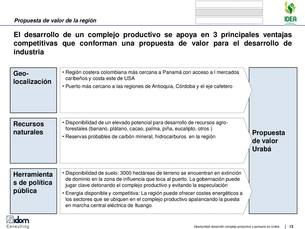 El proyecto portuario en Urabá parte del desarrollo de un Complejo productivo con actividad industrial e industrias ancla, servicios portuarios y logísticos, infraestructura de servicios, utilities y equipamientos en la región generando un impacto positivo en el desarrollo de la población. • Terminarles portuarias • Zona de actividades logísticas (ZAL) • Servicios industriales: Logísticos ; Servicios industriales: o&m, construcción, • Zonas francas • Vivienda por estratos • Serv públicos Abastecimiento, saneamiento, residuos y otros • Sanidad: hospitales nivel III • Conocimiento: Formación técnica, tecnológica y superior • Otros Equip.: comercial, cultural, deportivo Servicios de complejo portuario- productivo Impacto estructura urbana • Atracción de comercio exterior (Ahorro logístico, transbordo) • Desarrollo de nuevos sectores no presenten en Colombia (Coste energético, TLC frente a EU, reemplazo importaciones en la región caribe- Andes) • Relocalización de industrias existentes en la región de Antioquia Sectores ancla y cadenas de valor objetivo asociadas • Infraestructura de transporte: • Carreteras • Otras • Otras infraestructuras: Energía, gas, agua Infraestructuras del complejo portuario - productivo II III I IV Enfoque Fuente: Análisis IDOM