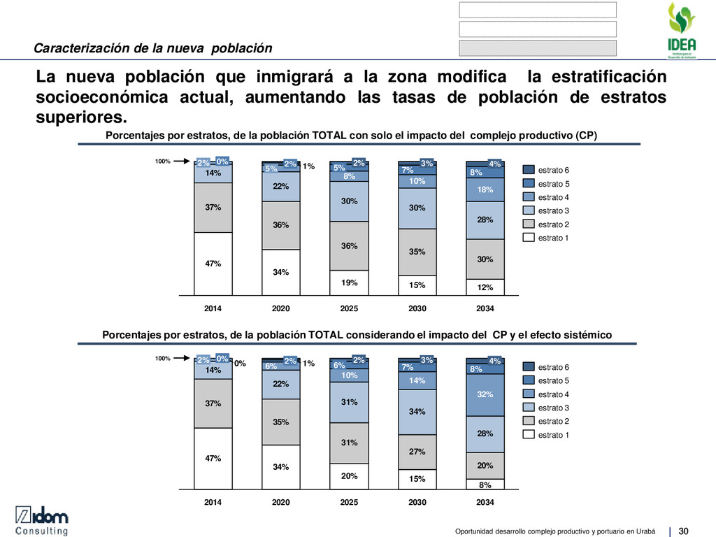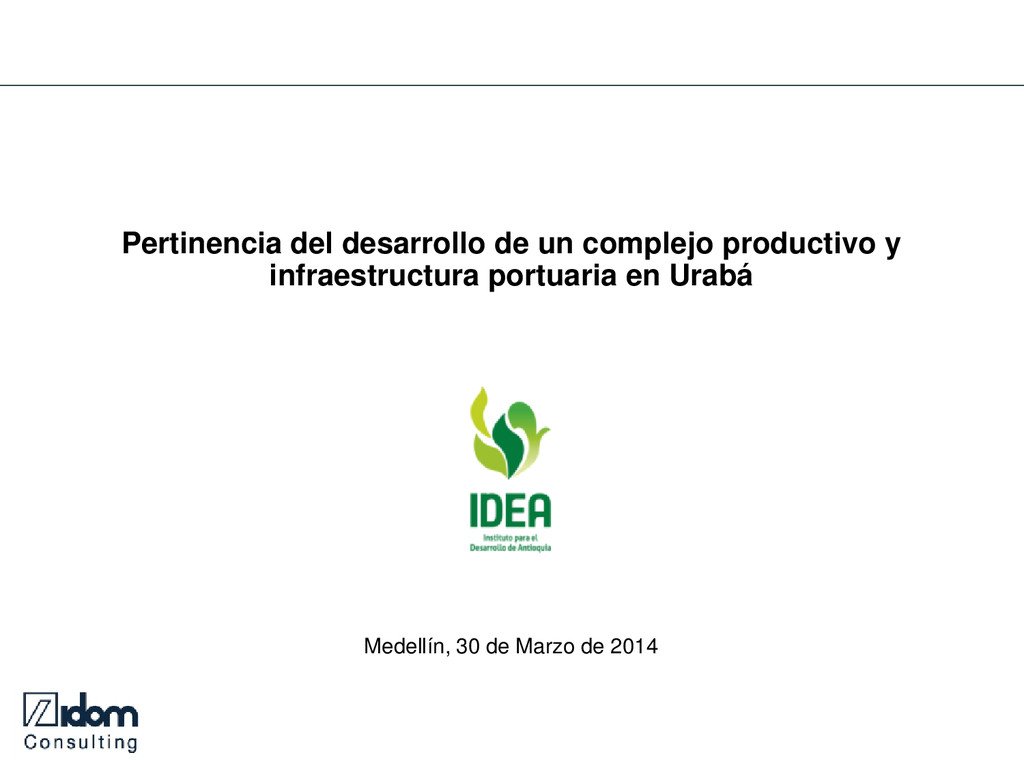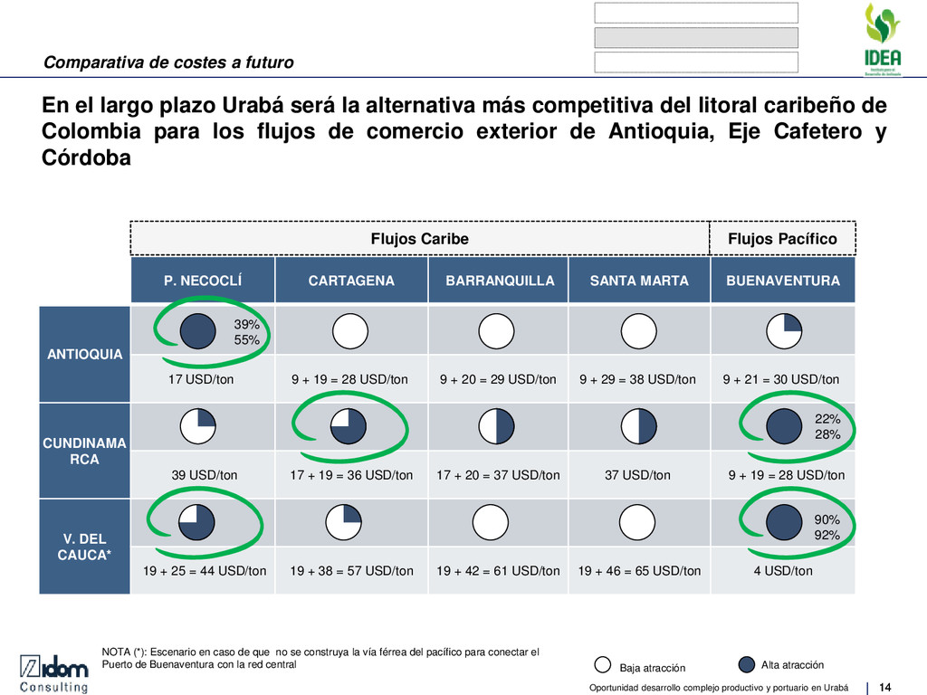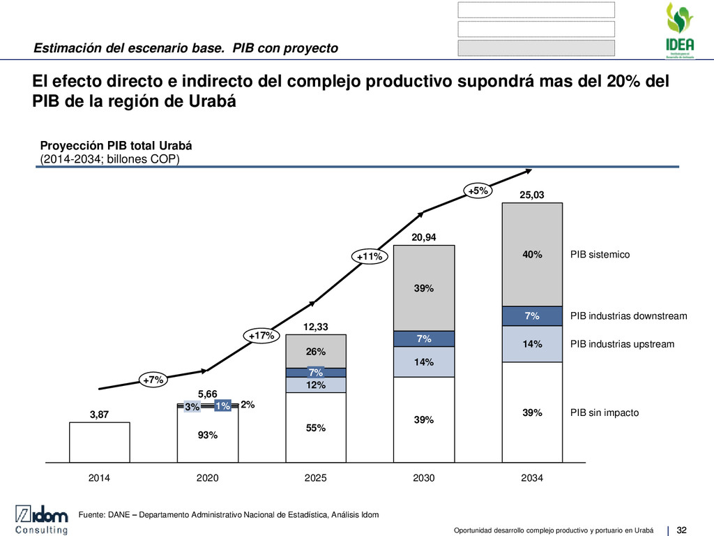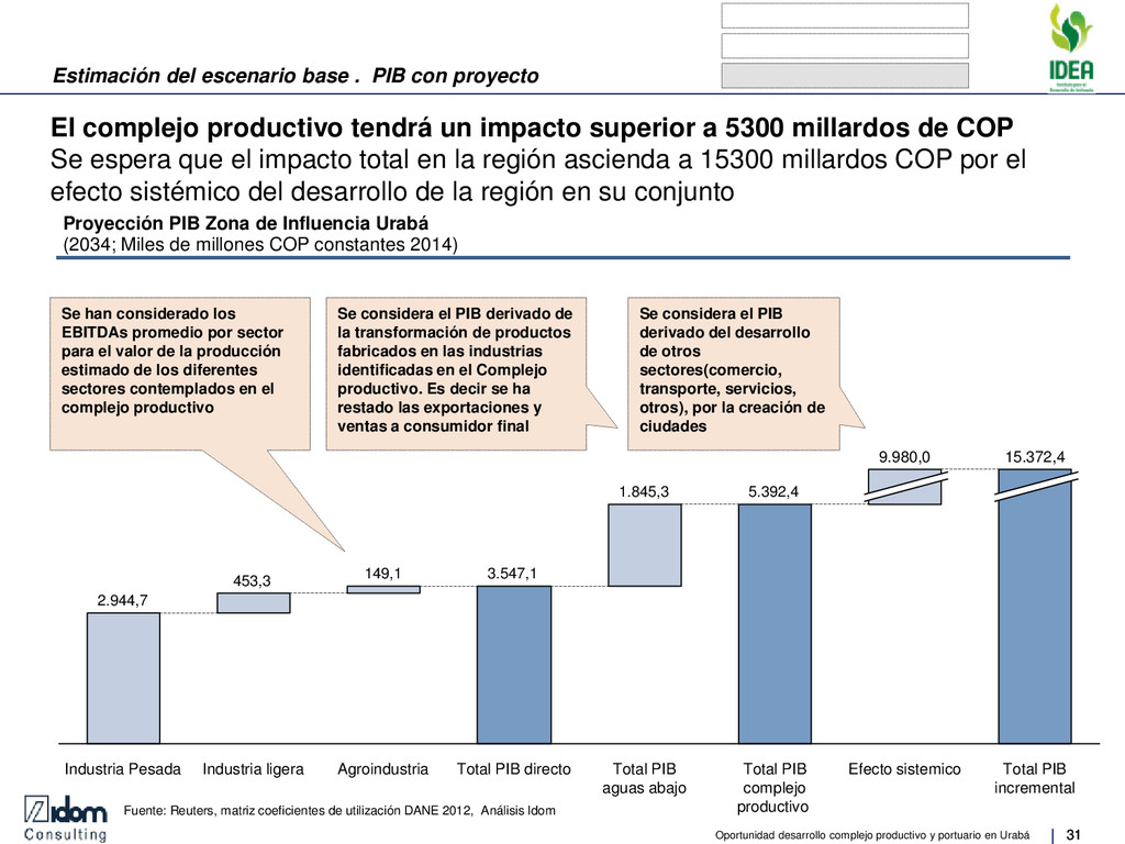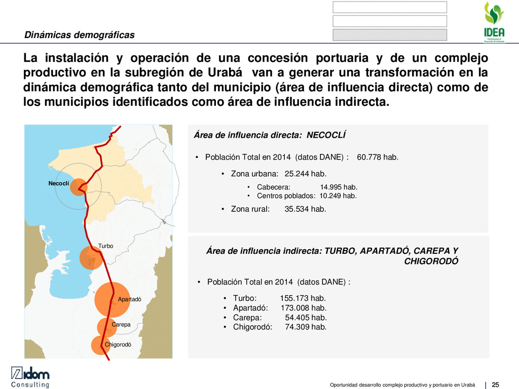 El proyecto portuario en Urabá parte del desarrollo de un Complejo productivo con actividad industrial e industrias ancla, servicios portuarios y logísticos, infraestructura de servicios, utilities y equipamientos en la región generando un impacto positivo en el desarrollo de la población. • Terminarles portuarias • Zona de actividades logísticas (ZAL) • Servicios industriales: Logísticos ; Servicios industriales: o&m, construcción, • Zonas francas • Vivienda por estratos • Serv públicos Abastecimiento, saneamiento, residuos y otros • Sanidad: hospitales nivel III • Conocimiento: Formación técnica, tecnológica y superior • Otros Equip.: comercial, cultural, deportivo Servicios de complejo portuario- productivo Impacto estructura urbana • Atracción de comercio exterior (Ahorro logístico, transbordo) • Desarrollo de nuevos sectores no presenten en Colombia (Coste energético, TLC frente a EU, reemplazo importaciones en la región caribe- Andes) • Relocalización de industrias existentes en la región de Antioquia Sectores ancla y cadenas de valor objetivo asociadas • Infraestructura de transporte: • Carreteras • Otras • Otras infraestructuras: Energía, gas, agua Infraestructuras del complejo portuario - productivo II III I IV Enfoque Fuente: Análisis IDOM