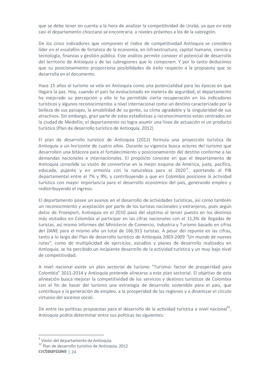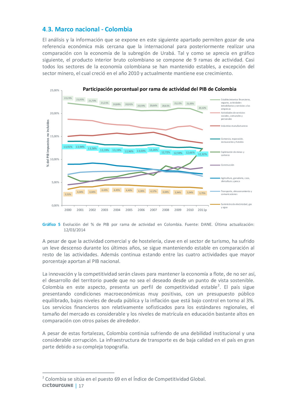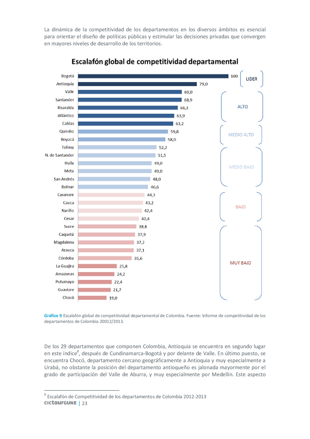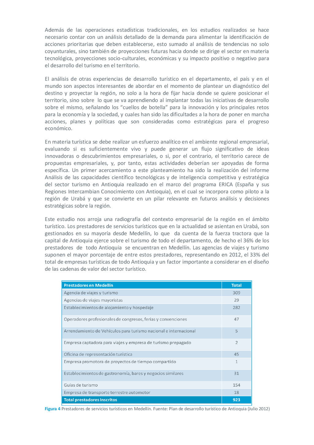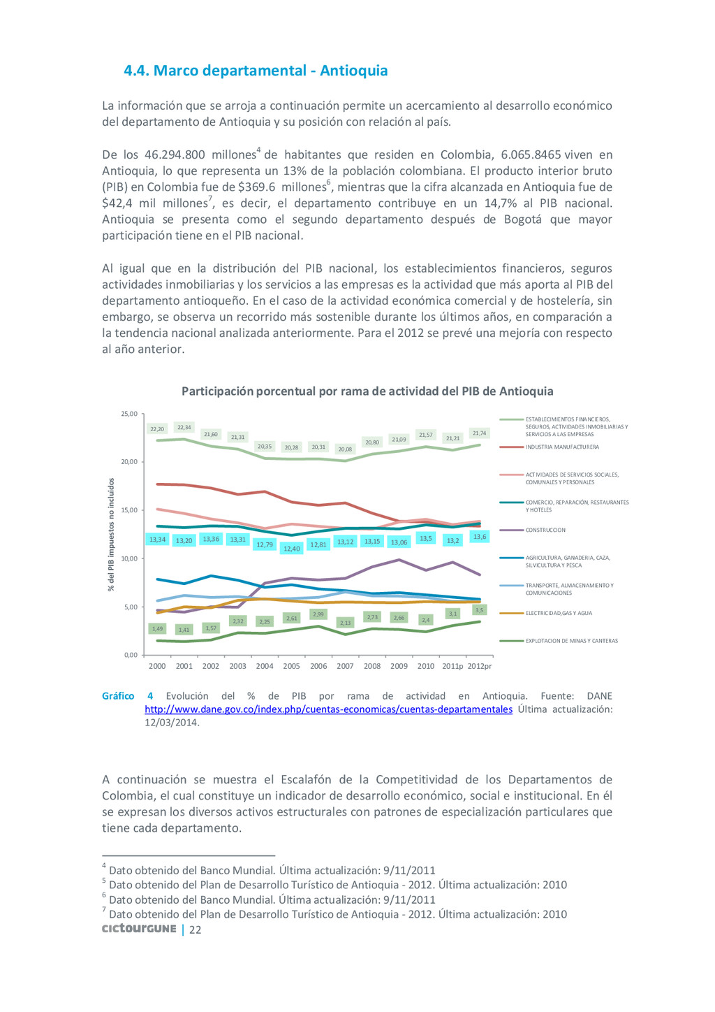 se arroja a continuación permite un acercamiento al desarrollo económico del departamento de Antioquia y su posición con relación al país. De los 46.294.800 millones4 de habitantes que residen en Colombia, 6.065.8465 viven en Antioquia, lo que representa un 13% de la población colombiana. El producto interior bruto (PIB) en Colombia fue de $369.6 millones6, mientras que la cifra alcanzada en Antioquia fue de $42,4 mil millones7, es decir, el departamento contribuye en un 14,7% al PIB nacional. Antioquia se presenta como el segundo departamento después de Bogotá que mayor participación tiene en el PIB nacional. Al igual que en la distribución del PIB nacional, los establecimientos financieros, seguros actividades inmobiliarias y los servicios a las empresas es la actividad que más aporta al PIB del departamento antioqueño. En el caso de la actividad económica comercial y de hostelería, sin embargo, se observa un recorrido más sostenible durante los últimos años, en comparación a la tendencia nacional analizada anteriormente. Para el 2012 se prevé una mejoría con respecto al año anterior. Gráfico 4 Evolución del % de PIB por rama de actividad en Antioquia. Fuente: DANE http://www.dane.gov.co/index.php/cuentas-economicas/cuentas-departamentales Última actualización: 12/03/2014. A continuación se muestra el Escalafón de la Competitividad de los Departamentos de Colombia, el cual constituye un indicador de desarrollo económico, social e institucional. En él se expresan los diversos activos estructurales con patrones de especialización particulares que tiene cada departamento. 4 Dato obtenido del Banco Mundial. Última actualización: 9/11/2011 5 Dato obtenido del Plan de Desarrollo Turístico de Antioquia - 2012. Última actualización: 2010 6 Dato obtenido del Banco Mundial. Última actualización: 9/11/2011 7 Dato obtenido del Plan de Desarrollo Turístico de Antioquia - 2012. Última actualización: 2010 22,20 22,34 21,60 21,31 20,35 20,28 20,31 20,08 20,80 21,09 21,57 21,21 21,74 13,34 13,20 13,36 13,31 12,79 12,40 12,81 13,12 13,15 13,06 13,5 13,2 13,6 1,49 1,41 1,57 2,32 2,25 2,61 2,99 2,13 2,73 2,66 2,4 3,1 3,5 0,00 5,00 10,00 15,00 20,00 25,00 2000 2001 2002 2003 2004 2005 2006 2007 2008 2009 2010 2011p 2012pr % del PIB impuestos no incluidos Participación porcentual por rama de actividad del PIB de Antioquia ESTABLECIMIENTOS FINANCIEROS, SEGUROS, ACTIVIDADES INMOBILIARIAS Y SERVICIOS A LAS EMPRESAS INDUSTRIA MANUFACTURERA ACTIVIDADES DE SERVICIOS SOCIALES, COMUNALES Y PERSONALES COMERCIO, REPARACIÓN, RESTAURANTES Y HOTELES CONSTRUCCION AGRICULTURA, GANADERIA, CAZA, SILVICULTURA Y PESCA TRANSPORTE, ALMACENAMIENTO Y COMUNICACIONES ELECTRICIDAD,GAS Y AGUA EXPLOTACION DE MINAS Y CANTERAS