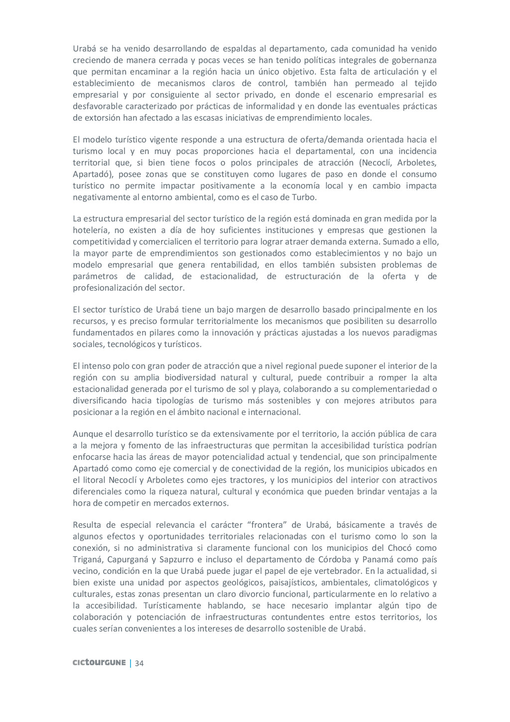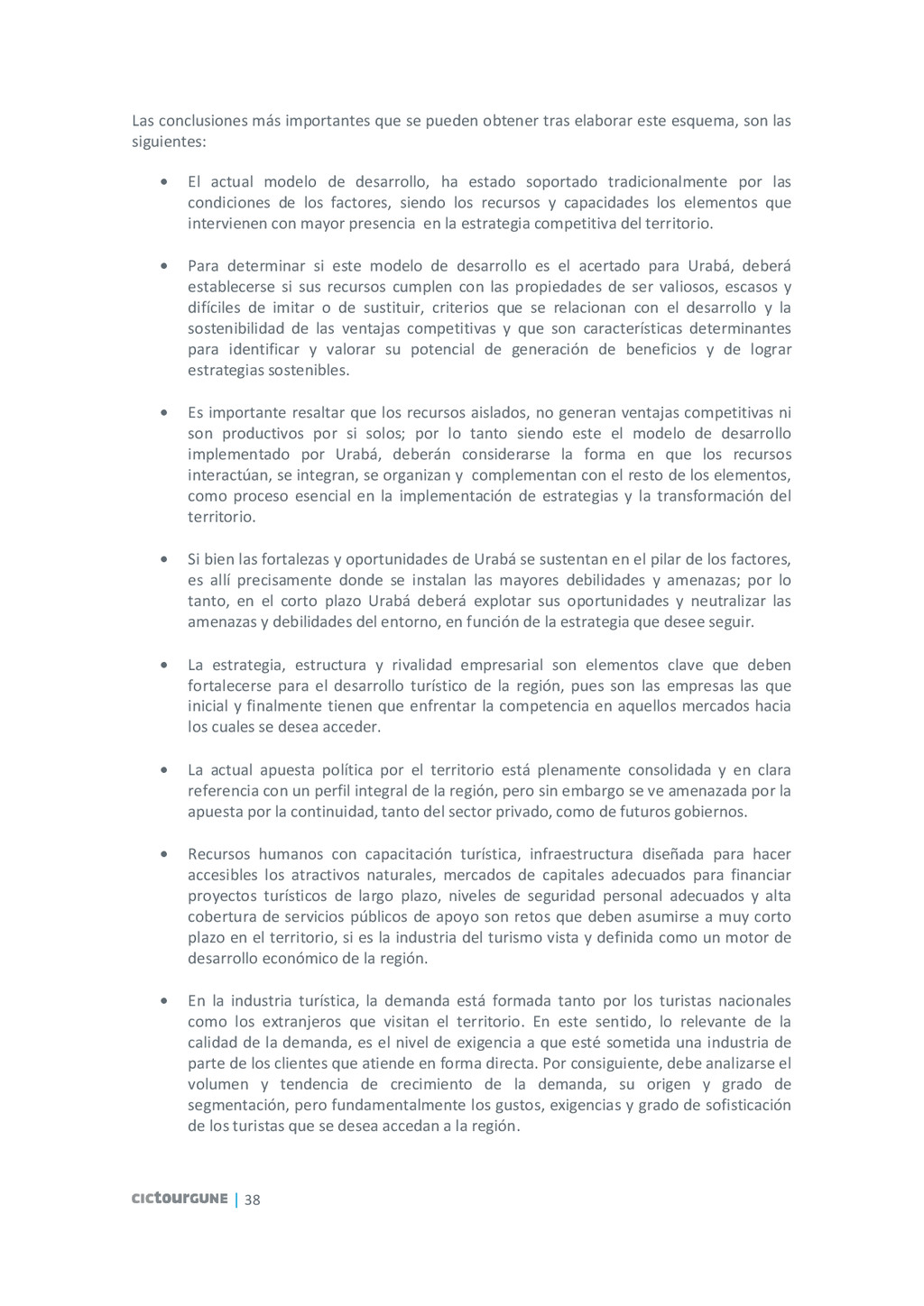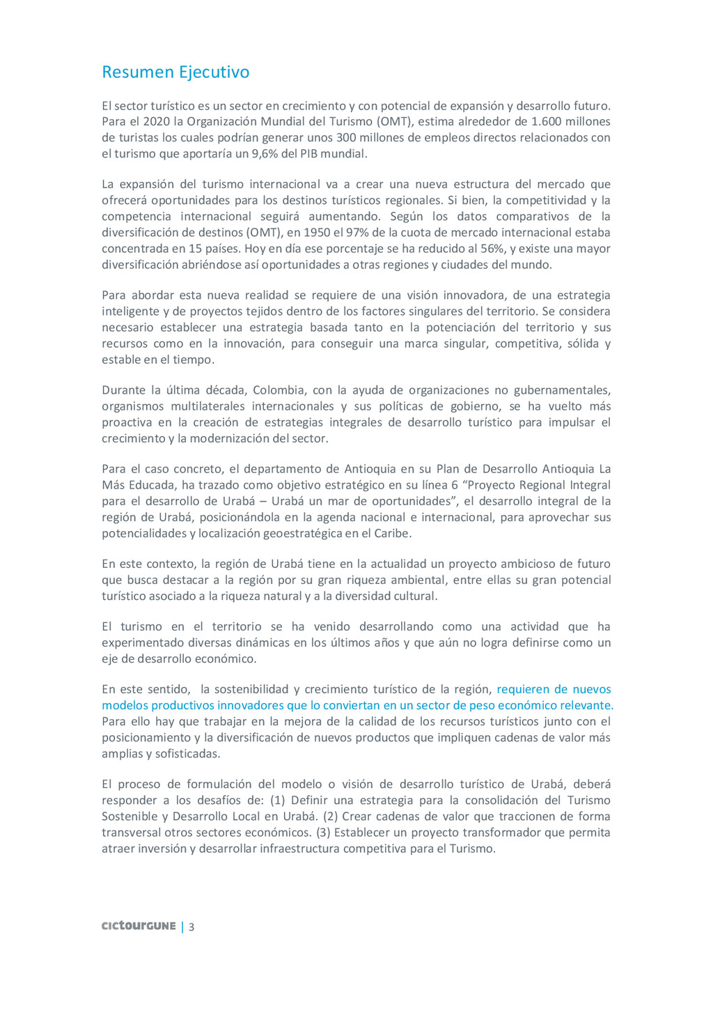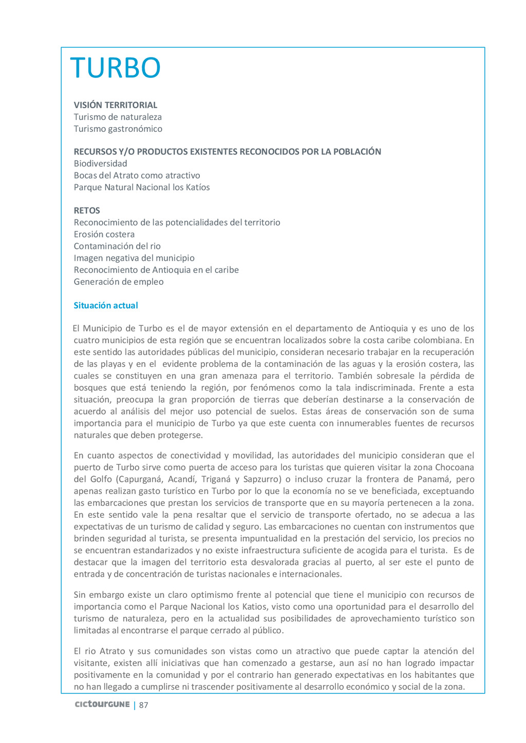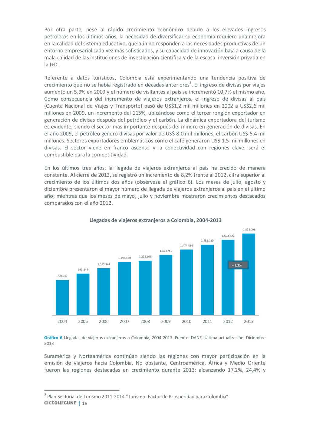 se arroja a continuación permite un acercamiento al desarrollo económico del departamento de Antioquia y su posición con relación al país. De los 46.294.800 millones4 de habitantes que residen en Colombia, 6.065.8465 viven en Antioquia, lo que representa un 13% de la población colombiana. El producto interior bruto (PIB) en Colombia fue de $369.6 millones6, mientras que la cifra alcanzada en Antioquia fue de $42,4 mil millones7, es decir, el departamento contribuye en un 14,7% al PIB nacional. Antioquia se presenta como el segundo departamento después de Bogotá que mayor participación tiene en el PIB nacional. Al igual que en la distribución del PIB nacional, los establecimientos financieros, seguros actividades inmobiliarias y los servicios a las empresas es la actividad que más aporta al PIB del departamento antioqueño. En el caso de la actividad económica comercial y de hostelería, sin embargo, se observa un recorrido más sostenible durante los últimos años, en comparación a la tendencia nacional analizada anteriormente. Para el 2012 se prevé una mejoría con respecto al año anterior. Gráfico 4 Evolución del % de PIB por rama de actividad en Antioquia. Fuente: DANE http://www.dane.gov.co/index.php/cuentas-economicas/cuentas-departamentales Última actualización: 12/03/2014. A continuación se muestra el Escalafón de la Competitividad de los Departamentos de Colombia, el cual constituye un indicador de desarrollo económico, social e institucional. En él se expresan los diversos activos estructurales con patrones de especialización particulares que tiene cada departamento. 4 Dato obtenido del Banco Mundial. Última actualización: 9/11/2011 5 Dato obtenido del Plan de Desarrollo Turístico de Antioquia - 2012. Última actualización: 2010 6 Dato obtenido del Banco Mundial. Última actualización: 9/11/2011 7 Dato obtenido del Plan de Desarrollo Turístico de Antioquia - 2012. Última actualización: 2010 22,20 22,34 21,60 21,31 20,35 20,28 20,31 20,08 20,80 21,09 21,57 21,21 21,74 13,34 13,20 13,36 13,31 12,79 12,40 12,81 13,12 13,15 13,06 13,5 13,2 13,6 1,49 1,41 1,57 2,32 2,25 2,61 2,99 2,13 2,73 2,66 2,4 3,1 3,5 0,00 5,00 10,00 15,00 20,00 25,00 2000 2001 2002 2003 2004 2005 2006 2007 2008 2009 2010 2011p 2012pr % del PIB impuestos no incluidos Participación porcentual por rama de actividad del PIB de Antioquia ESTABLECIMIENTOS FINANCIEROS, SEGUROS, ACTIVIDADES INMOBILIARIAS Y SERVICIOS A LAS EMPRESAS INDUSTRIA MANUFACTURERA ACTIVIDADES DE SERVICIOS SOCIALES, COMUNALES Y PERSONALES COMERCIO, REPARACIÓN, RESTAURANTES Y HOTELES CONSTRUCCION AGRICULTURA, GANADERIA, CAZA, SILVICULTURA Y PESCA TRANSPORTE, ALMACENAMIENTO Y COMUNICACIONES ELECTRICIDAD,GAS Y AGUA EXPLOTACION DE MINAS Y CANTERAS