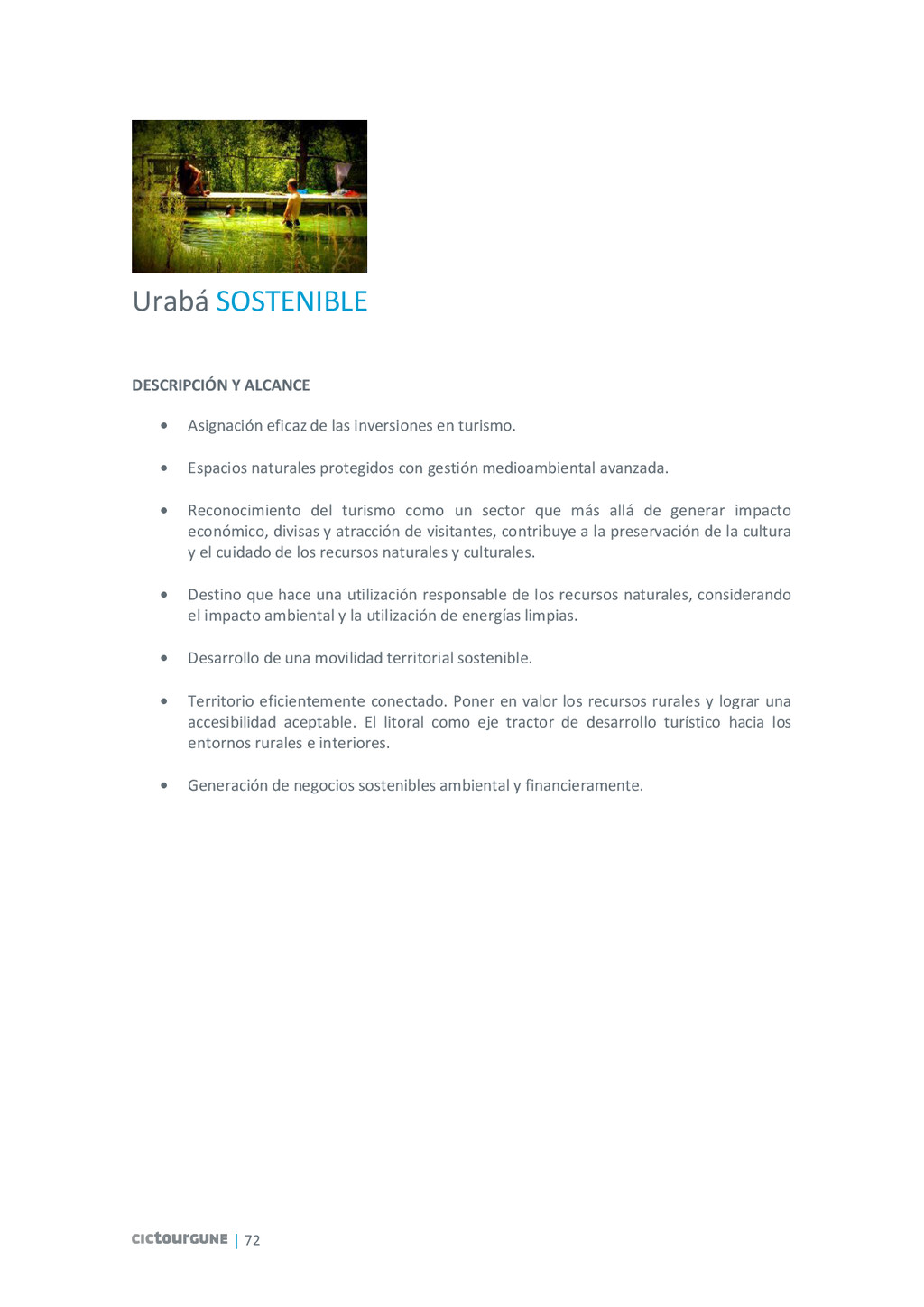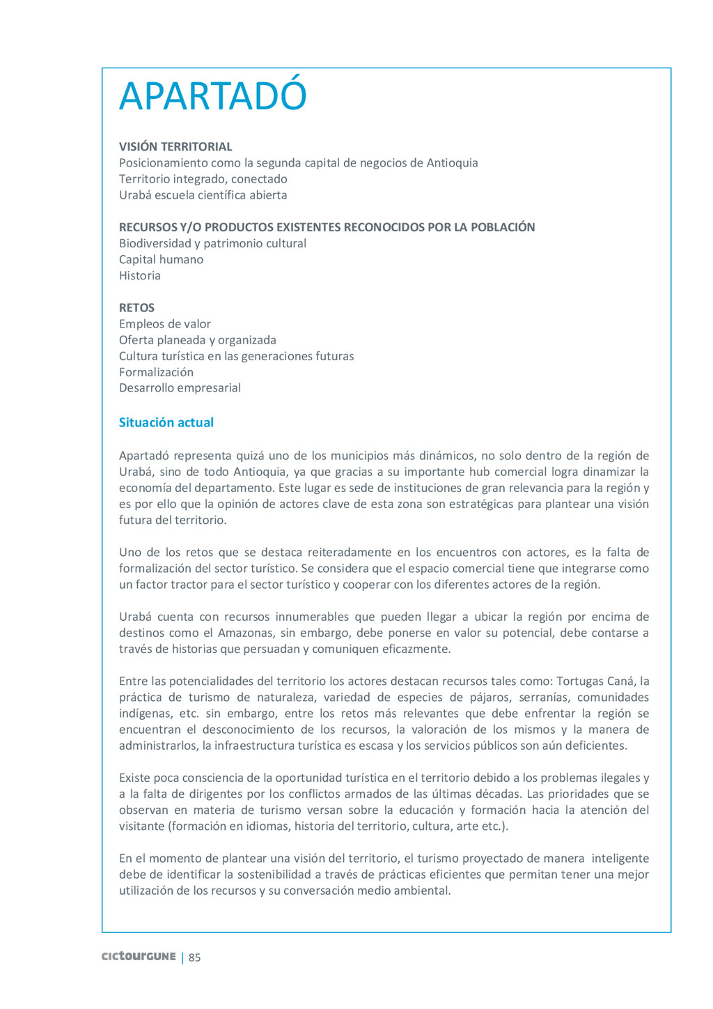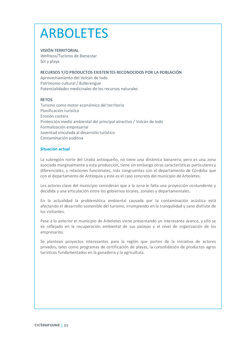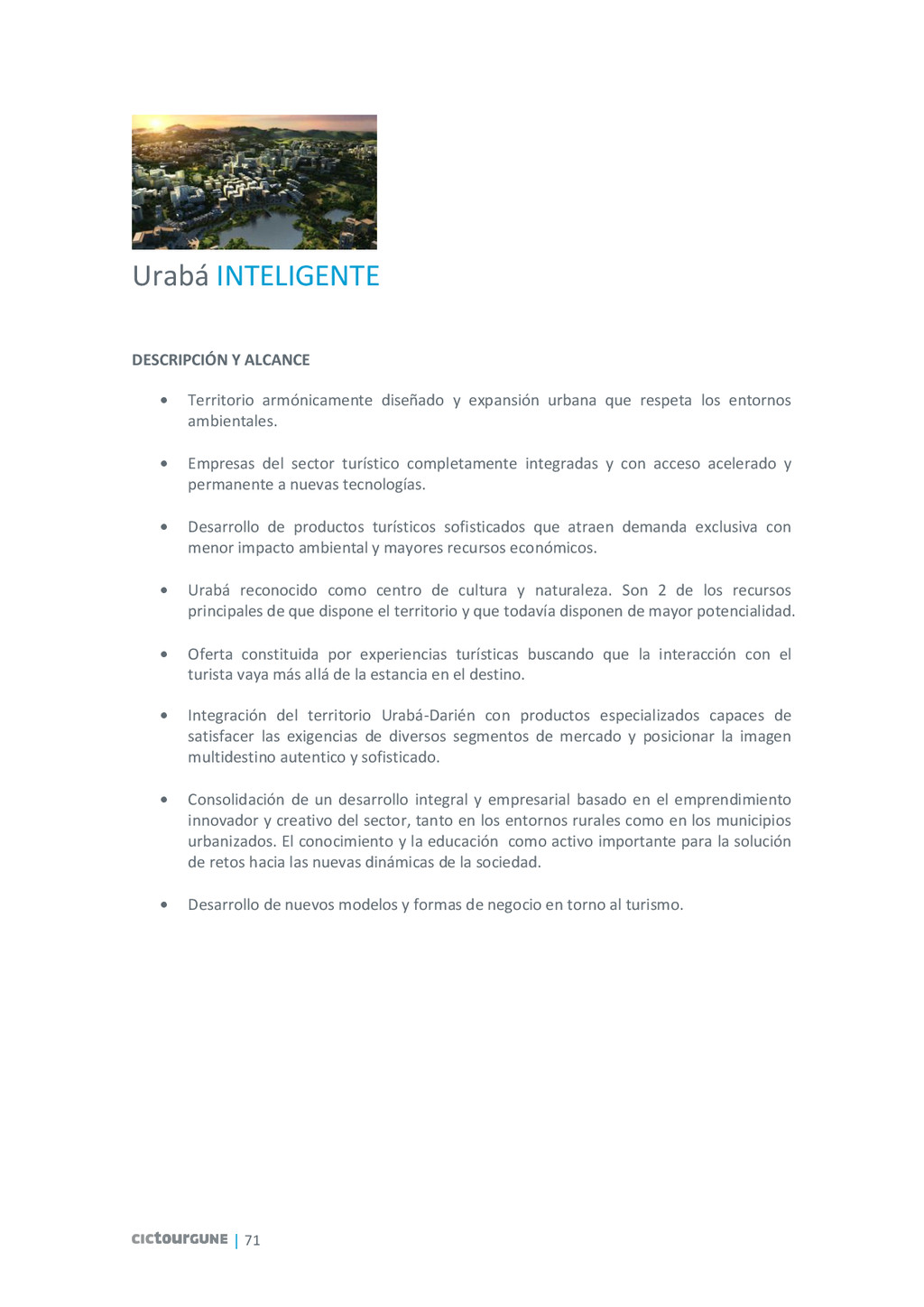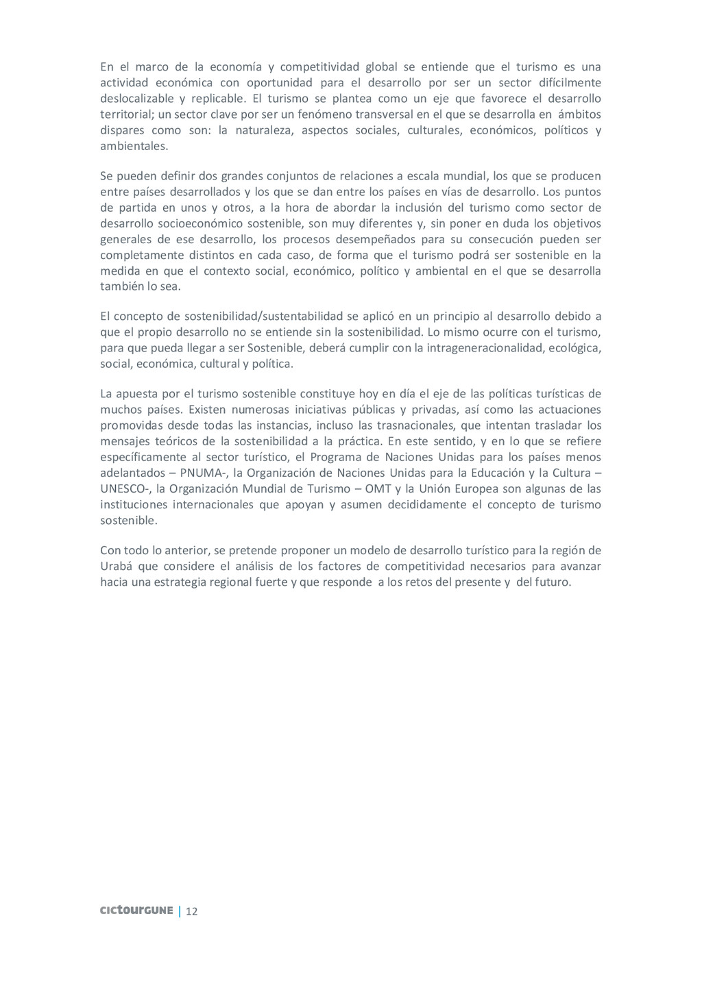 se arroja a continuación permite un acercamiento al desarrollo económico del departamento de Antioquia y su posición con relación al país. De los 46.294.800 millones4 de habitantes que residen en Colombia, 6.065.8465 viven en Antioquia, lo que representa un 13% de la población colombiana. El producto interior bruto (PIB) en Colombia fue de $369.6 millones6, mientras que la cifra alcanzada en Antioquia fue de $42,4 mil millones7, es decir, el departamento contribuye en un 14,7% al PIB nacional. Antioquia se presenta como el segundo departamento después de Bogotá que mayor participación tiene en el PIB nacional. Al igual que en la distribución del PIB nacional, los establecimientos financieros, seguros actividades inmobiliarias y los servicios a las empresas es la actividad que más aporta al PIB del departamento antioqueño. En el caso de la actividad económica comercial y de hostelería, sin embargo, se observa un recorrido más sostenible durante los últimos años, en comparación a la tendencia nacional analizada anteriormente. Para el 2012 se prevé una mejoría con respecto al año anterior. Gráfico 4 Evolución del % de PIB por rama de actividad en Antioquia. Fuente: DANE http://www.dane.gov.co/index.php/cuentas-economicas/cuentas-departamentales Última actualización: 12/03/2014. A continuación se muestra el Escalafón de la Competitividad de los Departamentos de Colombia, el cual constituye un indicador de desarrollo económico, social e institucional. En él se expresan los diversos activos estructurales con patrones de especialización particulares que tiene cada departamento. 4 Dato obtenido del Banco Mundial. Última actualización: 9/11/2011 5 Dato obtenido del Plan de Desarrollo Turístico de Antioquia - 2012. Última actualización: 2010 6 Dato obtenido del Banco Mundial. Última actualización: 9/11/2011 7 Dato obtenido del Plan de Desarrollo Turístico de Antioquia - 2012. Última actualización: 2010 22,20 22,34 21,60 21,31 20,35 20,28 20,31 20,08 20,80 21,09 21,57 21,21 21,74 13,34 13,20 13,36 13,31 12,79 12,40 12,81 13,12 13,15 13,06 13,5 13,2 13,6 1,49 1,41 1,57 2,32 2,25 2,61 2,99 2,13 2,73 2,66 2,4 3,1 3,5 0,00 5,00 10,00 15,00 20,00 25,00 2000 2001 2002 2003 2004 2005 2006 2007 2008 2009 2010 2011p 2012pr % del PIB impuestos no incluidos Participación porcentual por rama de actividad del PIB de Antioquia ESTABLECIMIENTOS FINANCIEROS, SEGUROS, ACTIVIDADES INMOBILIARIAS Y SERVICIOS A LAS EMPRESAS INDUSTRIA MANUFACTURERA ACTIVIDADES DE SERVICIOS SOCIALES, COMUNALES Y PERSONALES COMERCIO, REPARACIÓN, RESTAURANTES Y HOTELES CONSTRUCCION AGRICULTURA, GANADERIA, CAZA, SILVICULTURA Y PESCA TRANSPORTE, ALMACENAMIENTO Y COMUNICACIONES ELECTRICIDAD,GAS Y AGUA EXPLOTACION DE MINAS Y CANTERAS