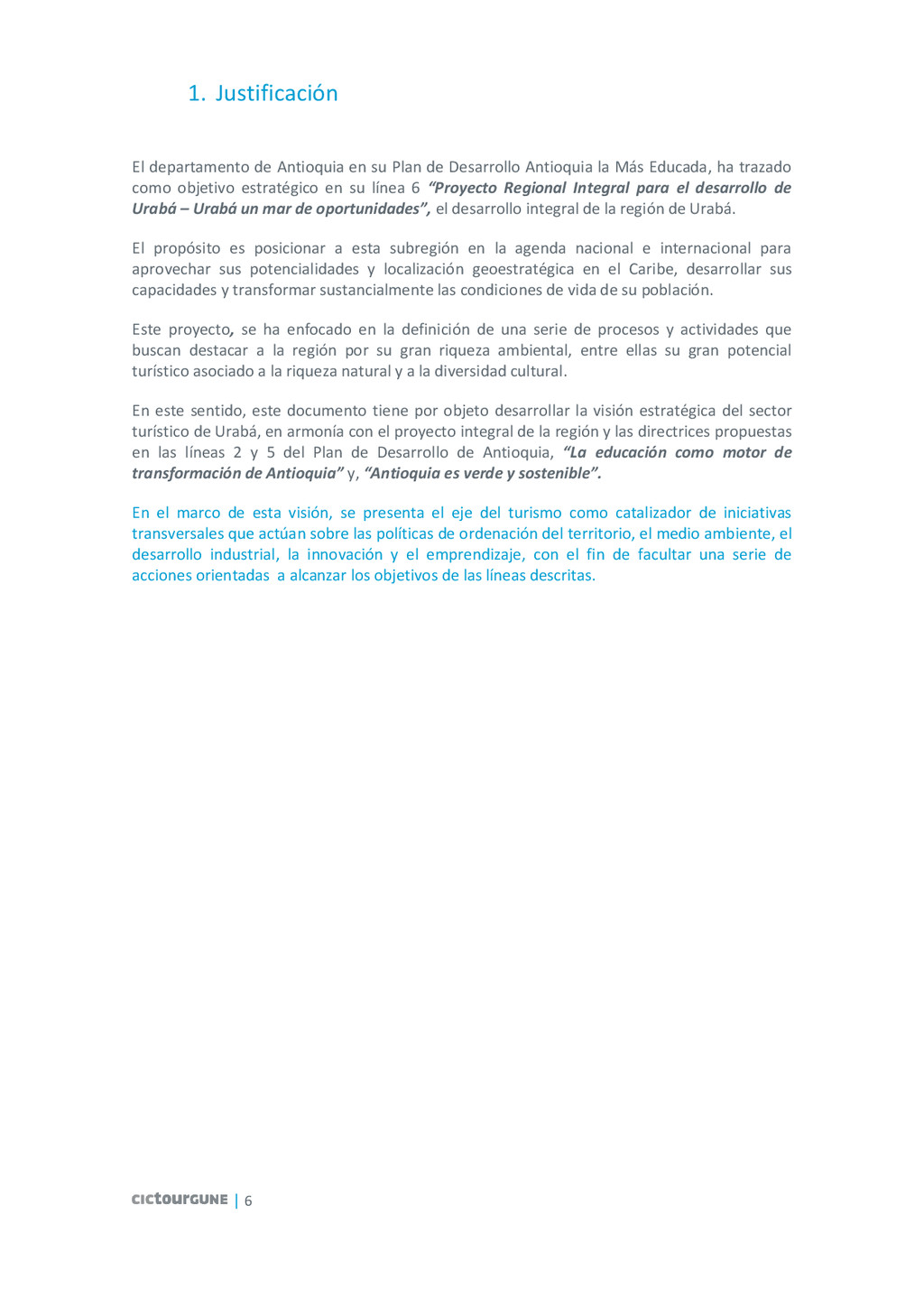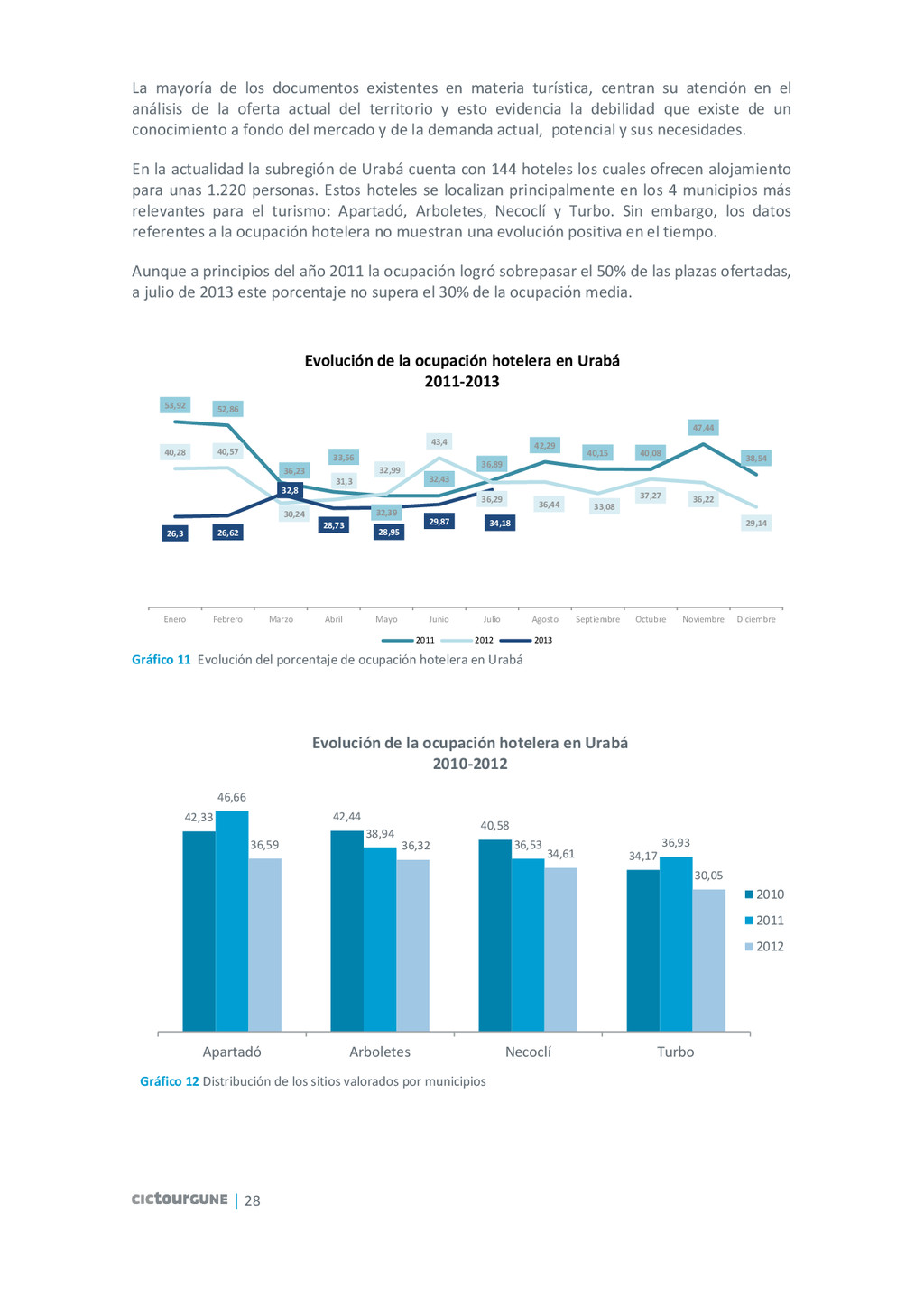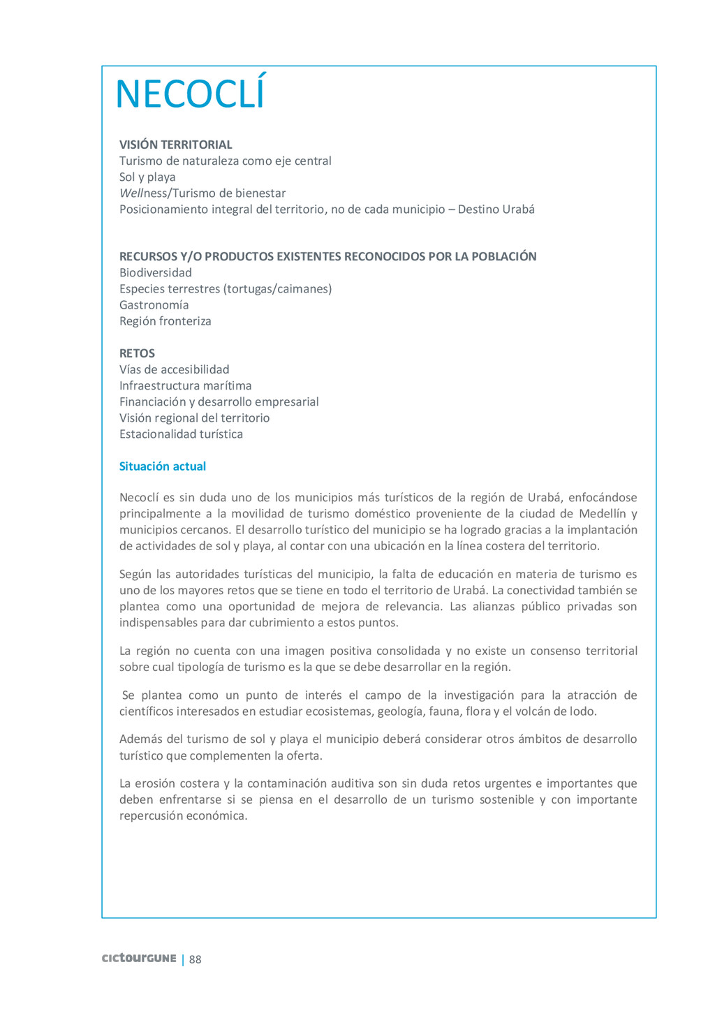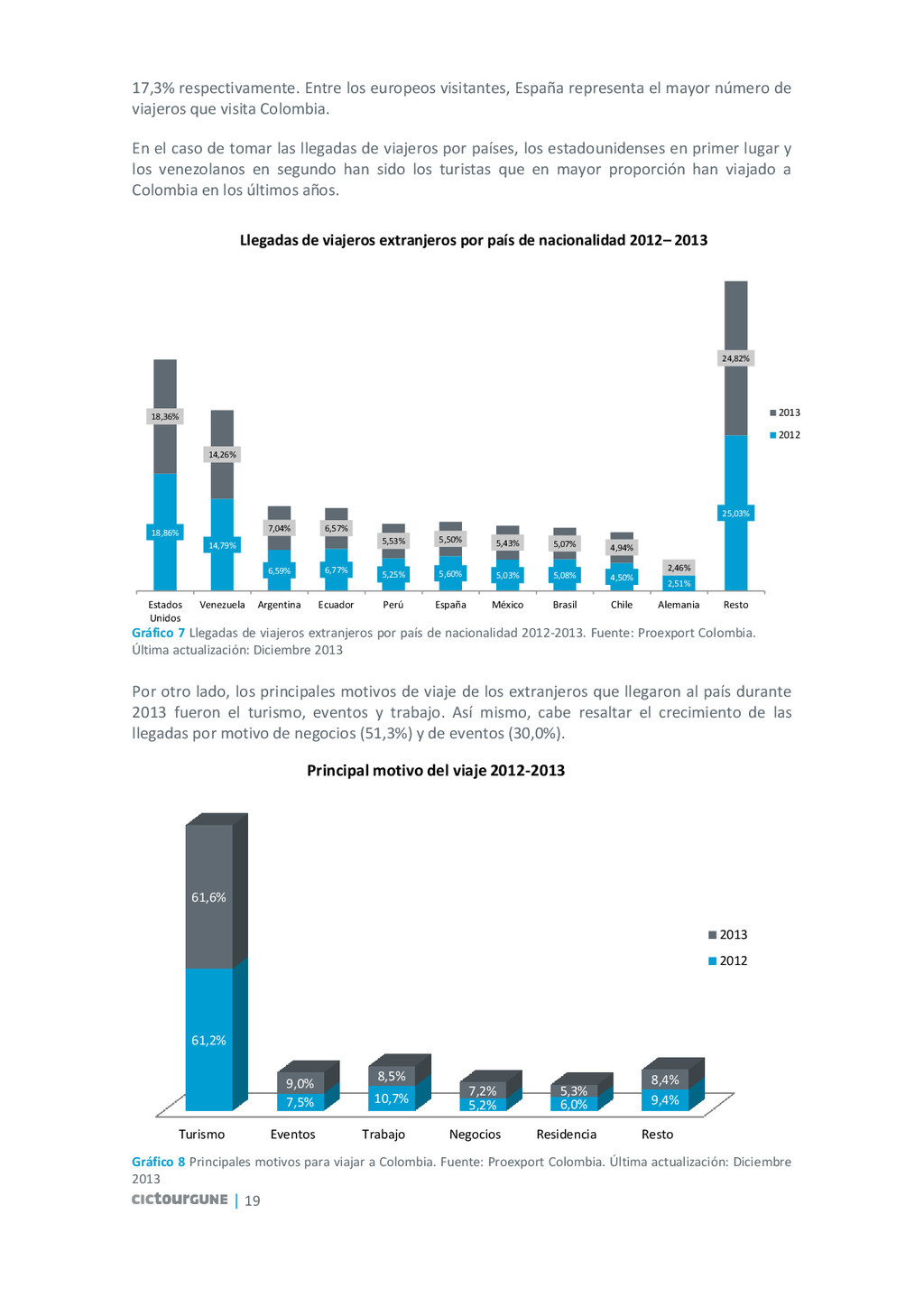 se arroja a continuación permite un acercamiento al desarrollo económico del departamento de Antioquia y su posición con relación al país. De los 46.294.800 millones4 de habitantes que residen en Colombia, 6.065.8465 viven en Antioquia, lo que representa un 13% de la población colombiana. El producto interior bruto (PIB) en Colombia fue de $369.6 millones6, mientras que la cifra alcanzada en Antioquia fue de $42,4 mil millones7, es decir, el departamento contribuye en un 14,7% al PIB nacional. Antioquia se presenta como el segundo departamento después de Bogotá que mayor participación tiene en el PIB nacional. Al igual que en la distribución del PIB nacional, los establecimientos financieros, seguros actividades inmobiliarias y los servicios a las empresas es la actividad que más aporta al PIB del departamento antioqueño. En el caso de la actividad económica comercial y de hostelería, sin embargo, se observa un recorrido más sostenible durante los últimos años, en comparación a la tendencia nacional analizada anteriormente. Para el 2012 se prevé una mejoría con respecto al año anterior. Gráfico 4 Evolución del % de PIB por rama de actividad en Antioquia. Fuente: DANE http://www.dane.gov.co/index.php/cuentas-economicas/cuentas-departamentales Última actualización: 12/03/2014. A continuación se muestra el Escalafón de la Competitividad de los Departamentos de Colombia, el cual constituye un indicador de desarrollo económico, social e institucional. En él se expresan los diversos activos estructurales con patrones de especialización particulares que tiene cada departamento. 4 Dato obtenido del Banco Mundial. Última actualización: 9/11/2011 5 Dato obtenido del Plan de Desarrollo Turístico de Antioquia - 2012. Última actualización: 2010 6 Dato obtenido del Banco Mundial. Última actualización: 9/11/2011 7 Dato obtenido del Plan de Desarrollo Turístico de Antioquia - 2012. Última actualización: 2010 22,20 22,34 21,60 21,31 20,35 20,28 20,31 20,08 20,80 21,09 21,57 21,21 21,74 13,34 13,20 13,36 13,31 12,79 12,40 12,81 13,12 13,15 13,06 13,5 13,2 13,6 1,49 1,41 1,57 2,32 2,25 2,61 2,99 2,13 2,73 2,66 2,4 3,1 3,5 0,00 5,00 10,00 15,00 20,00 25,00 2000 2001 2002 2003 2004 2005 2006 2007 2008 2009 2010 2011p 2012pr % del PIB impuestos no incluidos Participación porcentual por rama de actividad del PIB de Antioquia ESTABLECIMIENTOS FINANCIEROS, SEGUROS, ACTIVIDADES INMOBILIARIAS Y SERVICIOS A LAS EMPRESAS INDUSTRIA MANUFACTURERA ACTIVIDADES DE SERVICIOS SOCIALES, COMUNALES Y PERSONALES COMERCIO, REPARACIÓN, RESTAURANTES Y HOTELES CONSTRUCCION AGRICULTURA, GANADERIA, CAZA, SILVICULTURA Y PESCA TRANSPORTE, ALMACENAMIENTO Y COMUNICACIONES ELECTRICIDAD,GAS Y AGUA EXPLOTACION DE MINAS Y CANTERAS