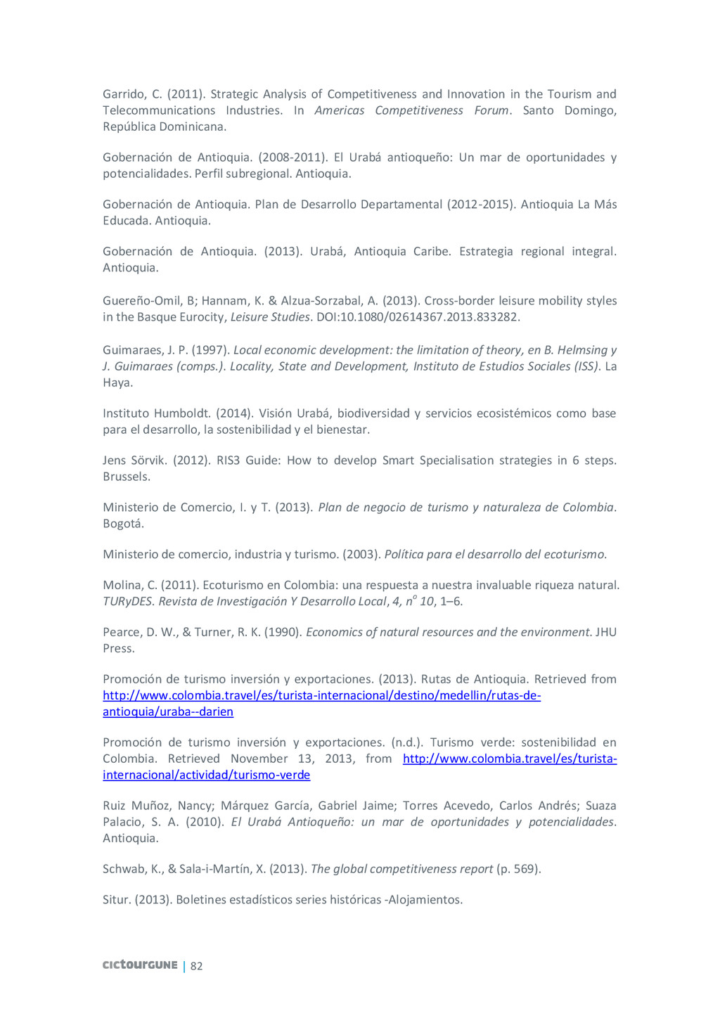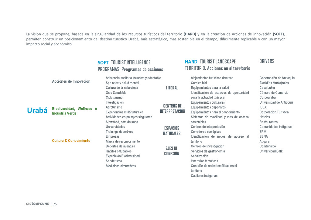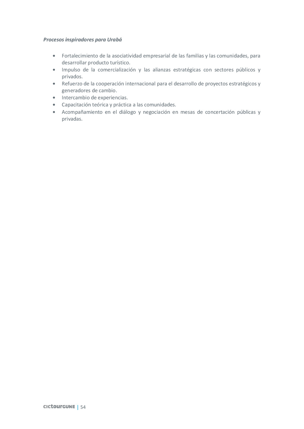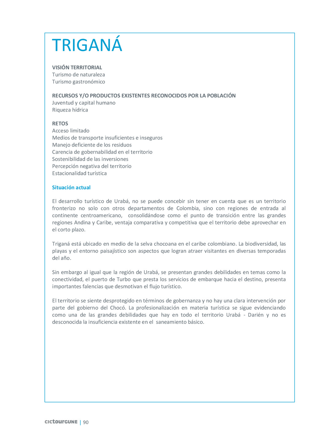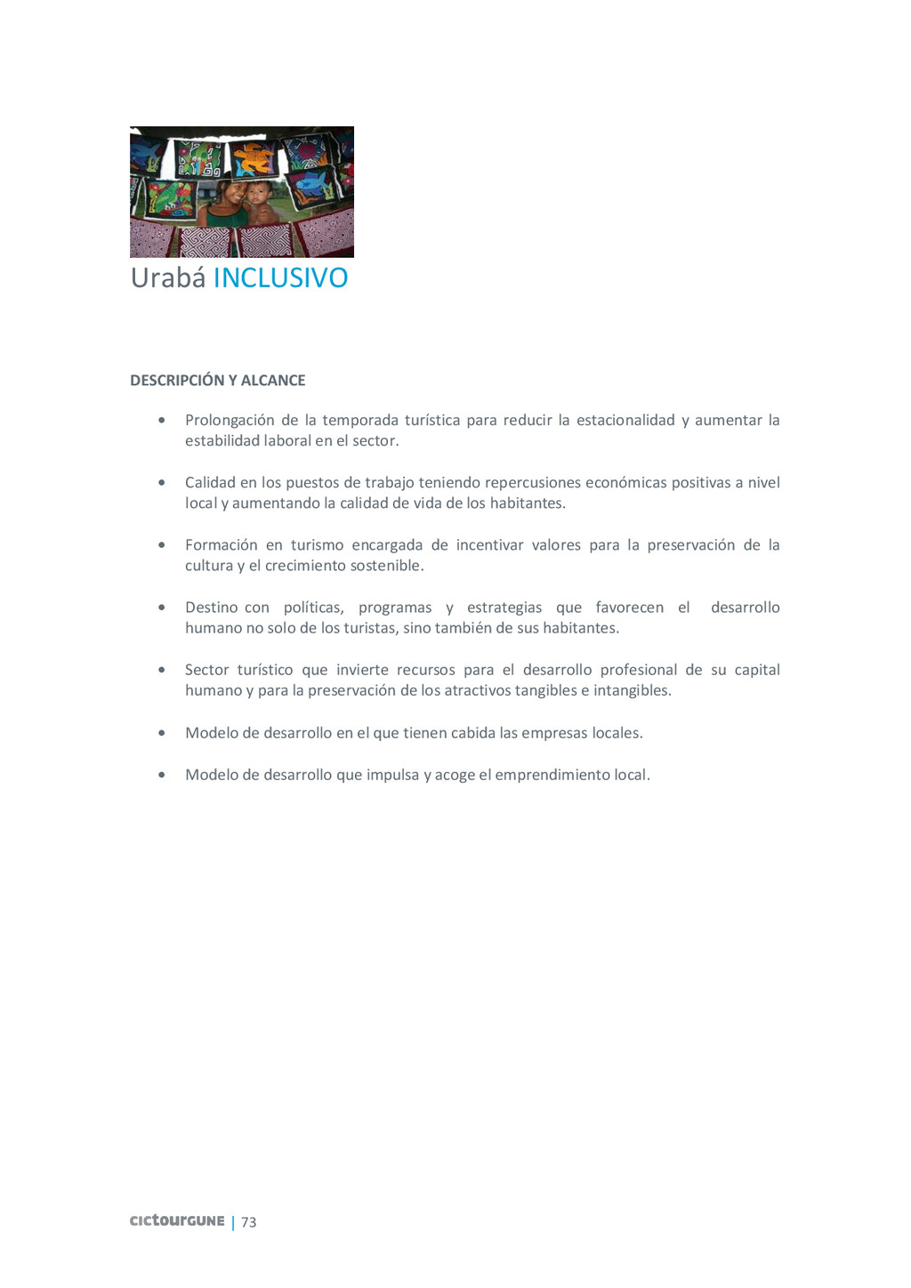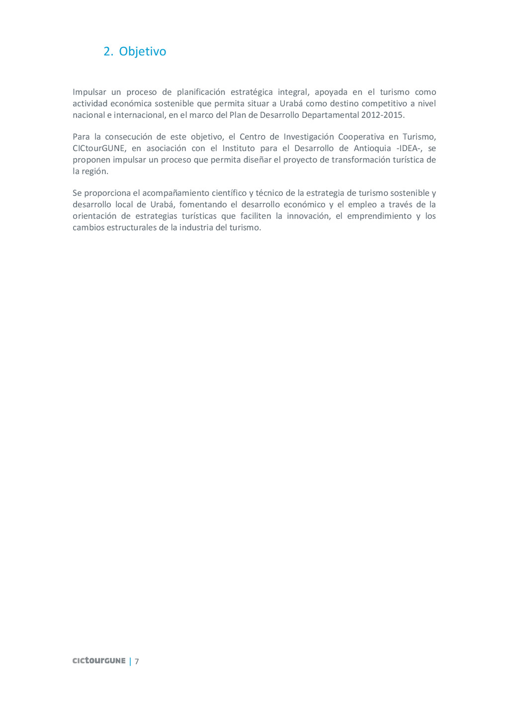 se arroja a continuación permite un acercamiento al desarrollo económico del departamento de Antioquia y su posición con relación al país. De los 46.294.800 millones4 de habitantes que residen en Colombia, 6.065.8465 viven en Antioquia, lo que representa un 13% de la población colombiana. El producto interior bruto (PIB) en Colombia fue de $369.6 millones6, mientras que la cifra alcanzada en Antioquia fue de $42,4 mil millones7, es decir, el departamento contribuye en un 14,7% al PIB nacional. Antioquia se presenta como el segundo departamento después de Bogotá que mayor participación tiene en el PIB nacional. Al igual que en la distribución del PIB nacional, los establecimientos financieros, seguros actividades inmobiliarias y los servicios a las empresas es la actividad que más aporta al PIB del departamento antioqueño. En el caso de la actividad económica comercial y de hostelería, sin embargo, se observa un recorrido más sostenible durante los últimos años, en comparación a la tendencia nacional analizada anteriormente. Para el 2012 se prevé una mejoría con respecto al año anterior. Gráfico 4 Evolución del % de PIB por rama de actividad en Antioquia. Fuente: DANE http://www.dane.gov.co/index.php/cuentas-economicas/cuentas-departamentales Última actualización: 12/03/2014. A continuación se muestra el Escalafón de la Competitividad de los Departamentos de Colombia, el cual constituye un indicador de desarrollo económico, social e institucional. En él se expresan los diversos activos estructurales con patrones de especialización particulares que tiene cada departamento. 4 Dato obtenido del Banco Mundial. Última actualización: 9/11/2011 5 Dato obtenido del Plan de Desarrollo Turístico de Antioquia - 2012. Última actualización: 2010 6 Dato obtenido del Banco Mundial. Última actualización: 9/11/2011 7 Dato obtenido del Plan de Desarrollo Turístico de Antioquia - 2012. Última actualización: 2010 22,20 22,34 21,60 21,31 20,35 20,28 20,31 20,08 20,80 21,09 21,57 21,21 21,74 13,34 13,20 13,36 13,31 12,79 12,40 12,81 13,12 13,15 13,06 13,5 13,2 13,6 1,49 1,41 1,57 2,32 2,25 2,61 2,99 2,13 2,73 2,66 2,4 3,1 3,5 0,00 5,00 10,00 15,00 20,00 25,00 2000 2001 2002 2003 2004 2005 2006 2007 2008 2009 2010 2011p 2012pr % del PIB impuestos no incluidos Participación porcentual por rama de actividad del PIB de Antioquia ESTABLECIMIENTOS FINANCIEROS, SEGUROS, ACTIVIDADES INMOBILIARIAS Y SERVICIOS A LAS EMPRESAS INDUSTRIA MANUFACTURERA ACTIVIDADES DE SERVICIOS SOCIALES, COMUNALES Y PERSONALES COMERCIO, REPARACIÓN, RESTAURANTES Y HOTELES CONSTRUCCION AGRICULTURA, GANADERIA, CAZA, SILVICULTURA Y PESCA TRANSPORTE, ALMACENAMIENTO Y COMUNICACIONES ELECTRICIDAD,GAS Y AGUA EXPLOTACION DE MINAS Y CANTERAS