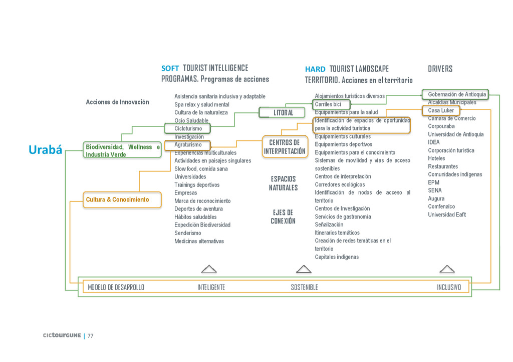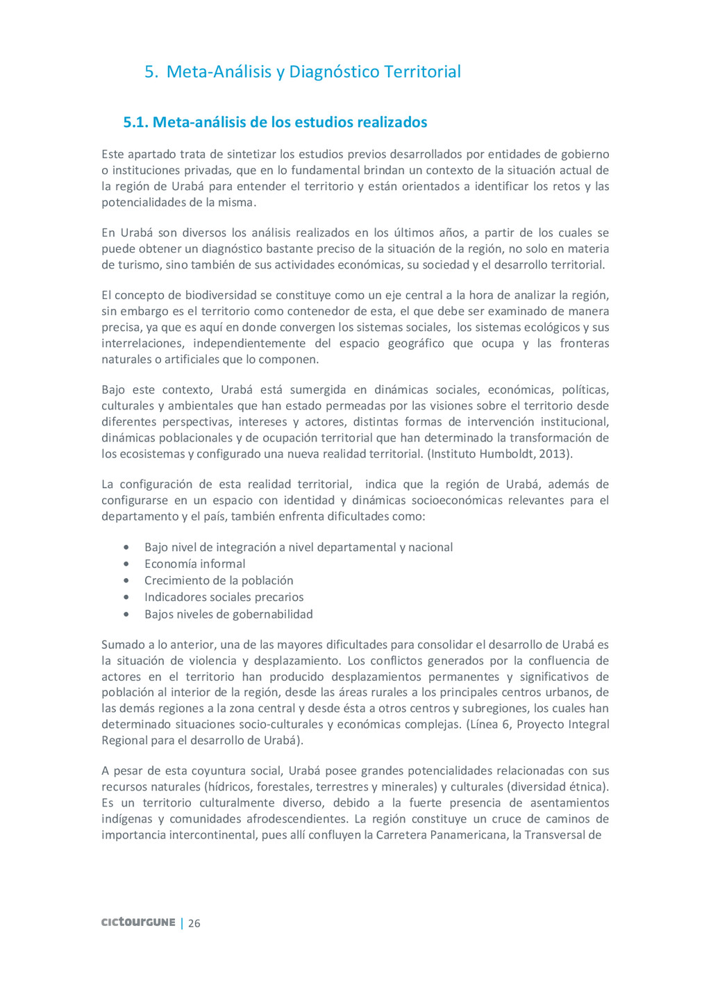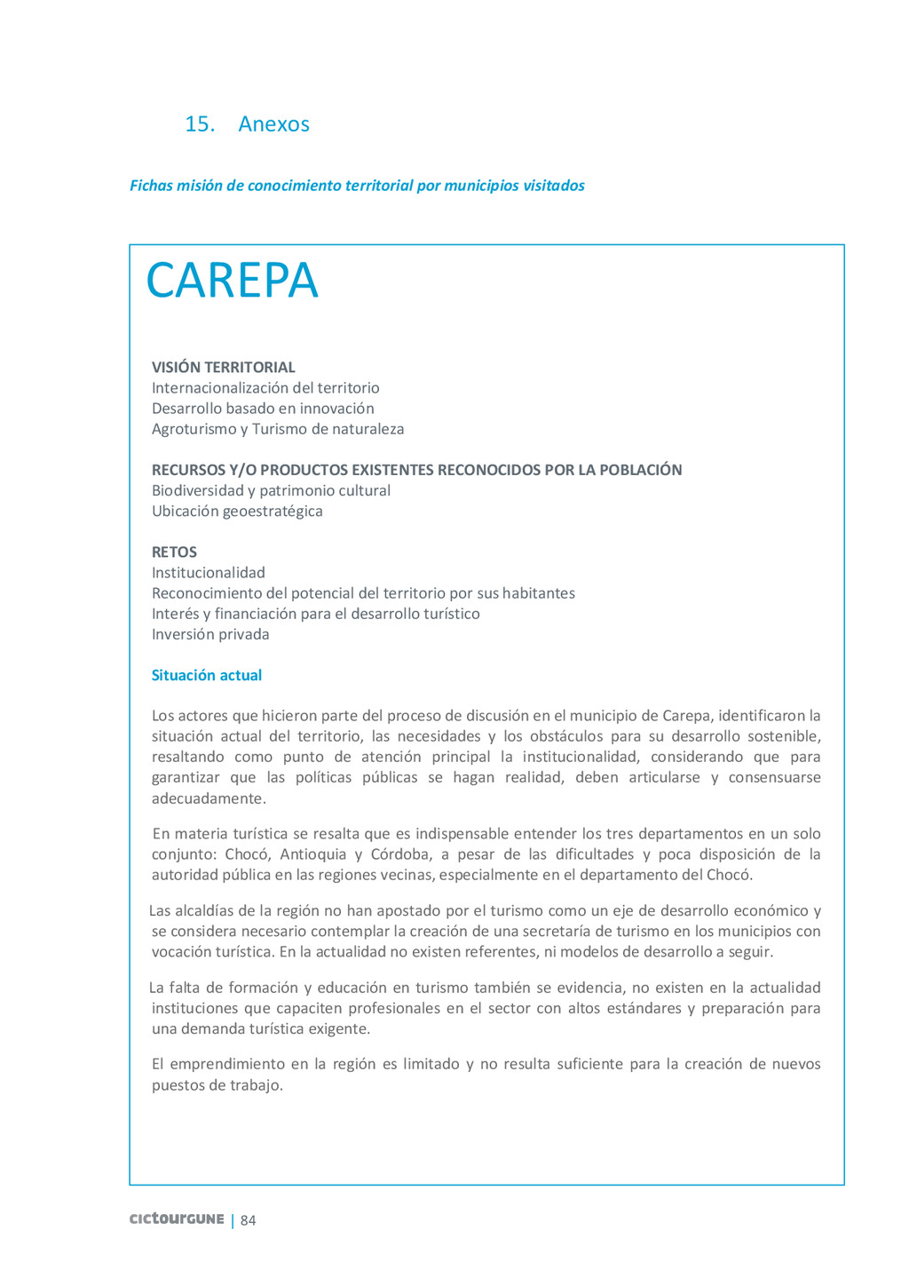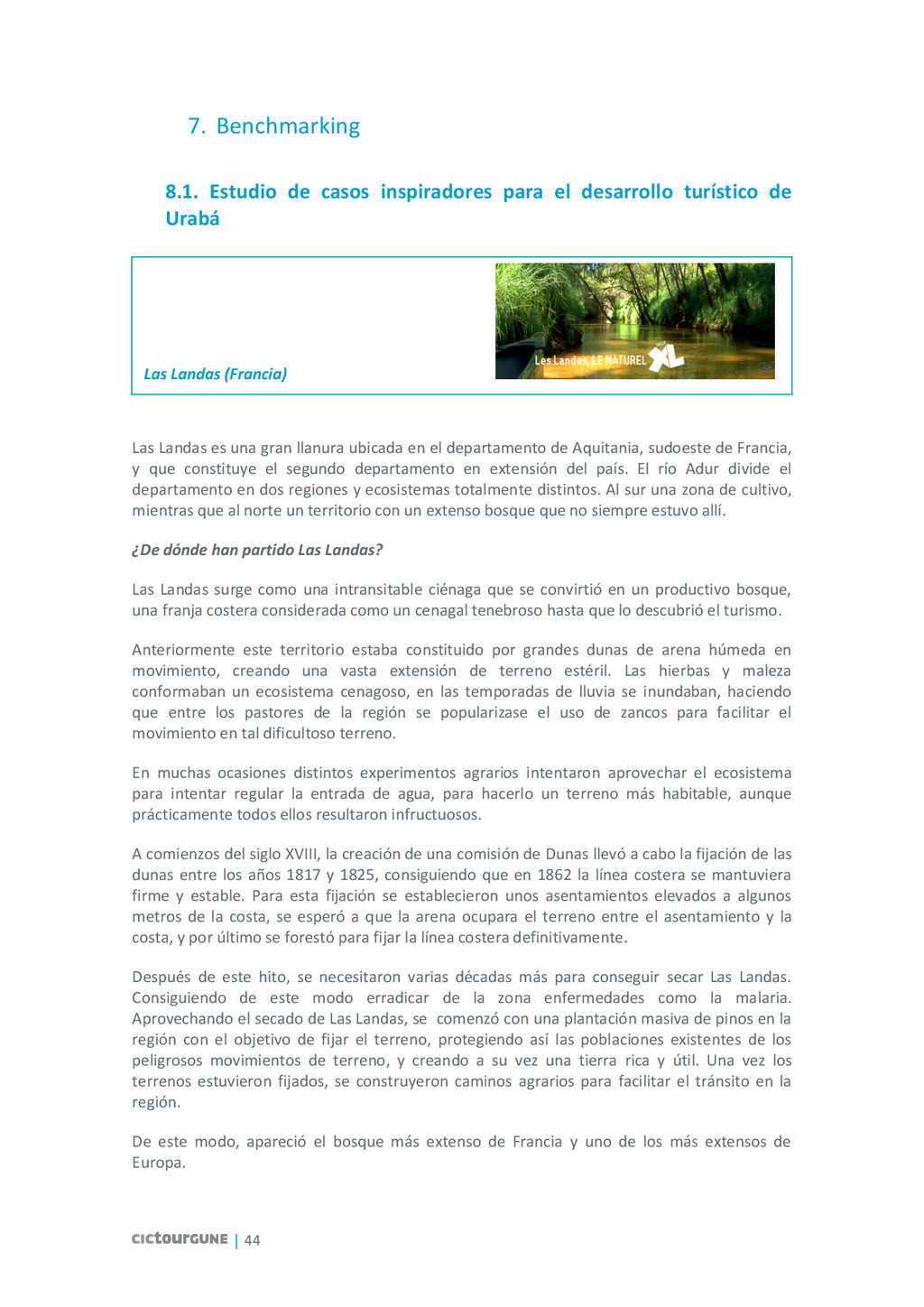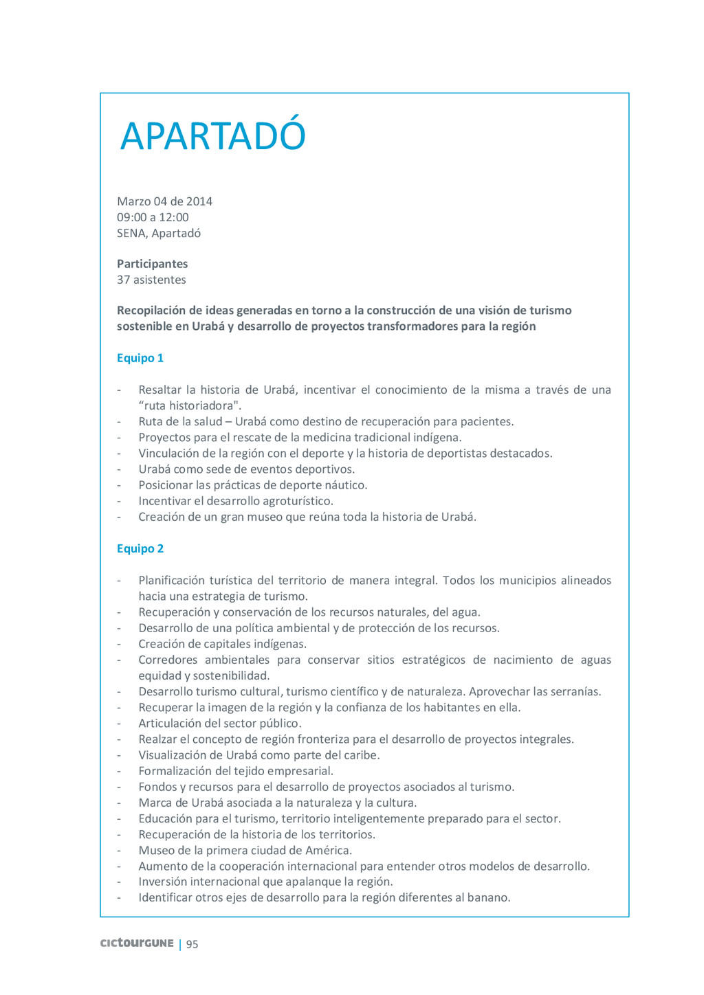 se arroja a continuación permite un acercamiento al desarrollo económico del departamento de Antioquia y su posición con relación al país. De los 46.294.800 millones4 de habitantes que residen en Colombia, 6.065.8465 viven en Antioquia, lo que representa un 13% de la población colombiana. El producto interior bruto (PIB) en Colombia fue de $369.6 millones6, mientras que la cifra alcanzada en Antioquia fue de $42,4 mil millones7, es decir, el departamento contribuye en un 14,7% al PIB nacional. Antioquia se presenta como el segundo departamento después de Bogotá que mayor participación tiene en el PIB nacional. Al igual que en la distribución del PIB nacional, los establecimientos financieros, seguros actividades inmobiliarias y los servicios a las empresas es la actividad que más aporta al PIB del departamento antioqueño. En el caso de la actividad económica comercial y de hostelería, sin embargo, se observa un recorrido más sostenible durante los últimos años, en comparación a la tendencia nacional analizada anteriormente. Para el 2012 se prevé una mejoría con respecto al año anterior. Gráfico 4 Evolución del % de PIB por rama de actividad en Antioquia. Fuente: DANE http://www.dane.gov.co/index.php/cuentas-economicas/cuentas-departamentales Última actualización: 12/03/2014. A continuación se muestra el Escalafón de la Competitividad de los Departamentos de Colombia, el cual constituye un indicador de desarrollo económico, social e institucional. En él se expresan los diversos activos estructurales con patrones de especialización particulares que tiene cada departamento. 4 Dato obtenido del Banco Mundial. Última actualización: 9/11/2011 5 Dato obtenido del Plan de Desarrollo Turístico de Antioquia - 2012. Última actualización: 2010 6 Dato obtenido del Banco Mundial. Última actualización: 9/11/2011 7 Dato obtenido del Plan de Desarrollo Turístico de Antioquia - 2012. Última actualización: 2010 22,20 22,34 21,60 21,31 20,35 20,28 20,31 20,08 20,80 21,09 21,57 21,21 21,74 13,34 13,20 13,36 13,31 12,79 12,40 12,81 13,12 13,15 13,06 13,5 13,2 13,6 1,49 1,41 1,57 2,32 2,25 2,61 2,99 2,13 2,73 2,66 2,4 3,1 3,5 0,00 5,00 10,00 15,00 20,00 25,00 2000 2001 2002 2003 2004 2005 2006 2007 2008 2009 2010 2011p 2012pr % del PIB impuestos no incluidos Participación porcentual por rama de actividad del PIB de Antioquia ESTABLECIMIENTOS FINANCIEROS, SEGUROS, ACTIVIDADES INMOBILIARIAS Y SERVICIOS A LAS EMPRESAS INDUSTRIA MANUFACTURERA ACTIVIDADES DE SERVICIOS SOCIALES, COMUNALES Y PERSONALES COMERCIO, REPARACIÓN, RESTAURANTES Y HOTELES CONSTRUCCION AGRICULTURA, GANADERIA, CAZA, SILVICULTURA Y PESCA TRANSPORTE, ALMACENAMIENTO Y COMUNICACIONES ELECTRICIDAD,GAS Y AGUA EXPLOTACION DE MINAS Y CANTERAS