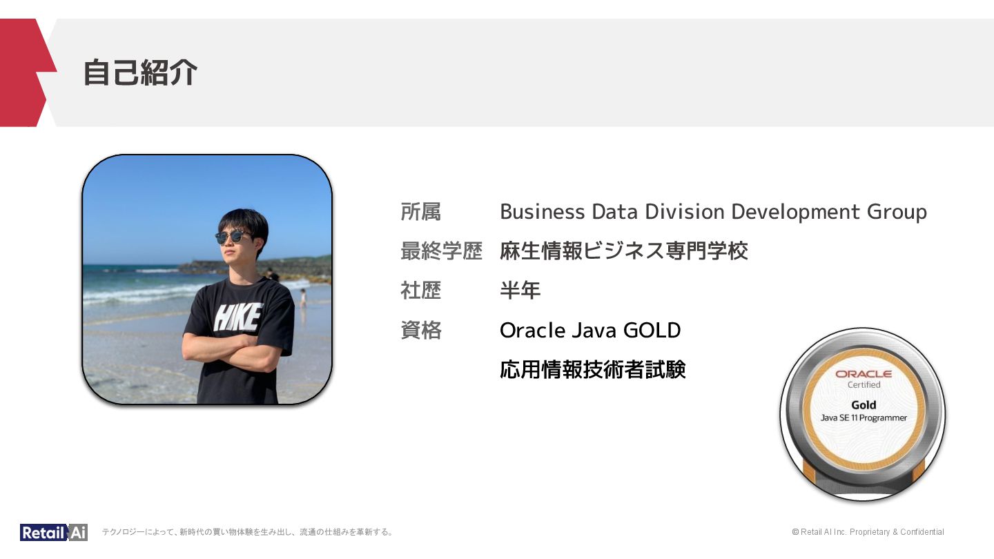 Business Data Division Development Group 最終学歴 麻生情報ビジネス専門学校 社歴 半年 資格 Oracle Java GOLD 応用情報技術者試験 自己紹介
