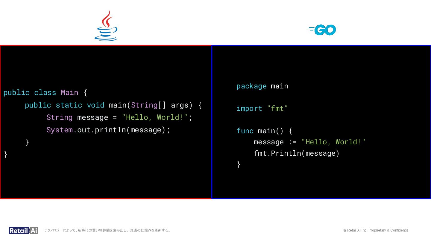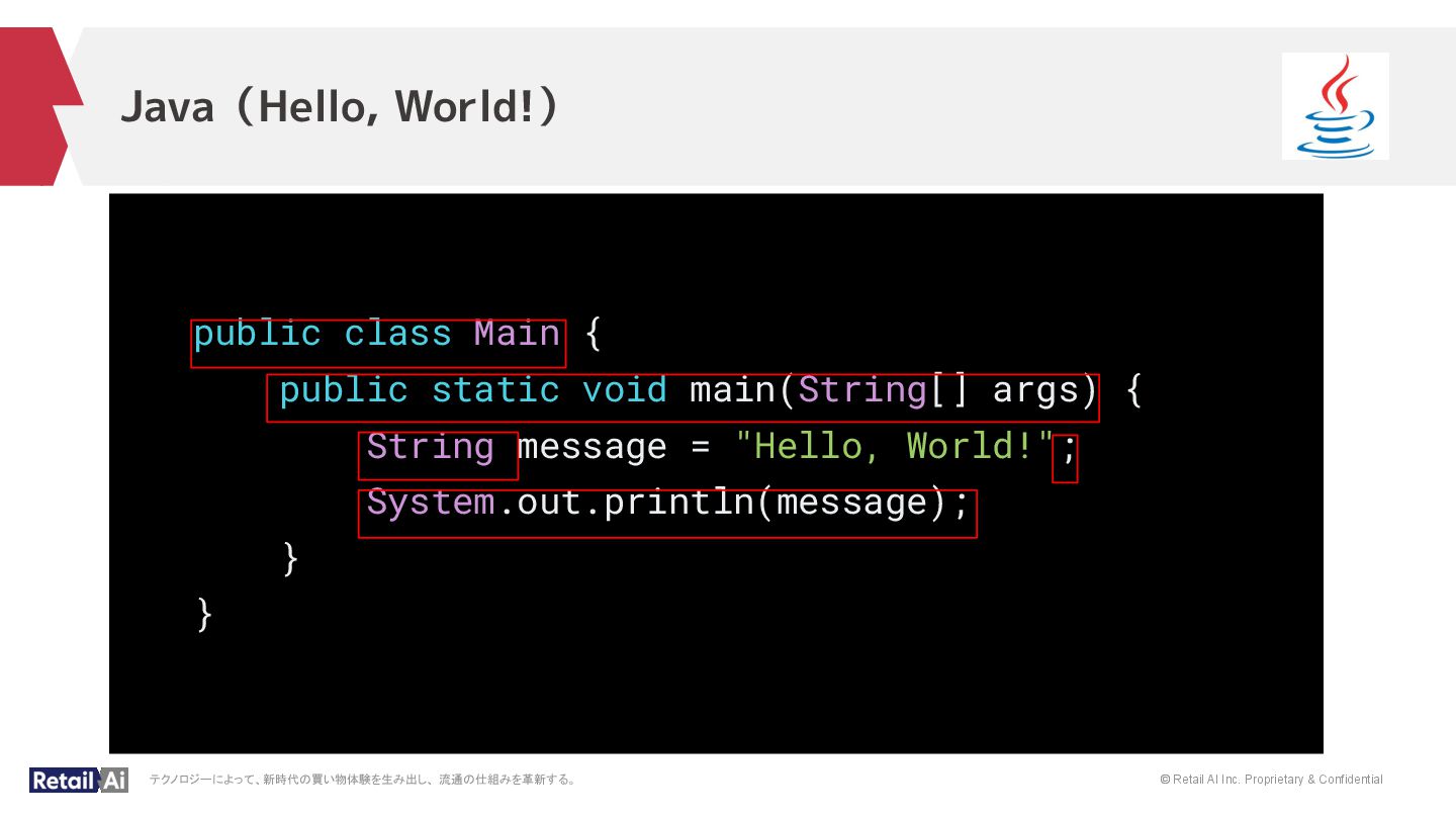 テクノロジーによって、新時代の買い物体験を生み出し、 流通の仕組みを革新する。 © Retail AI Inc. Proprietary & Confidential Java(Hello,