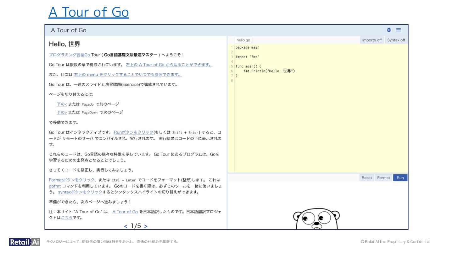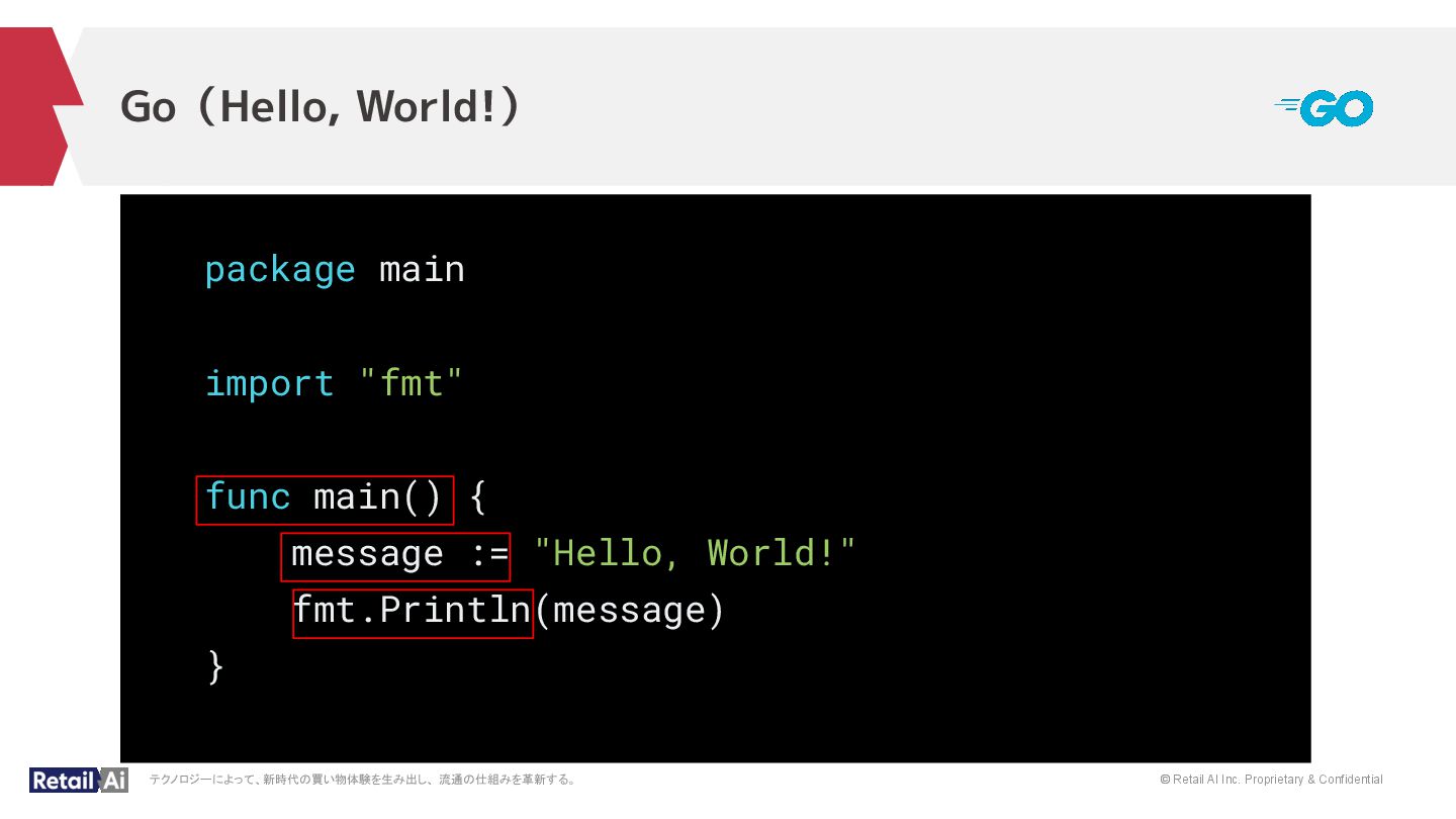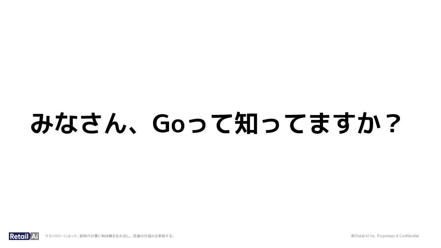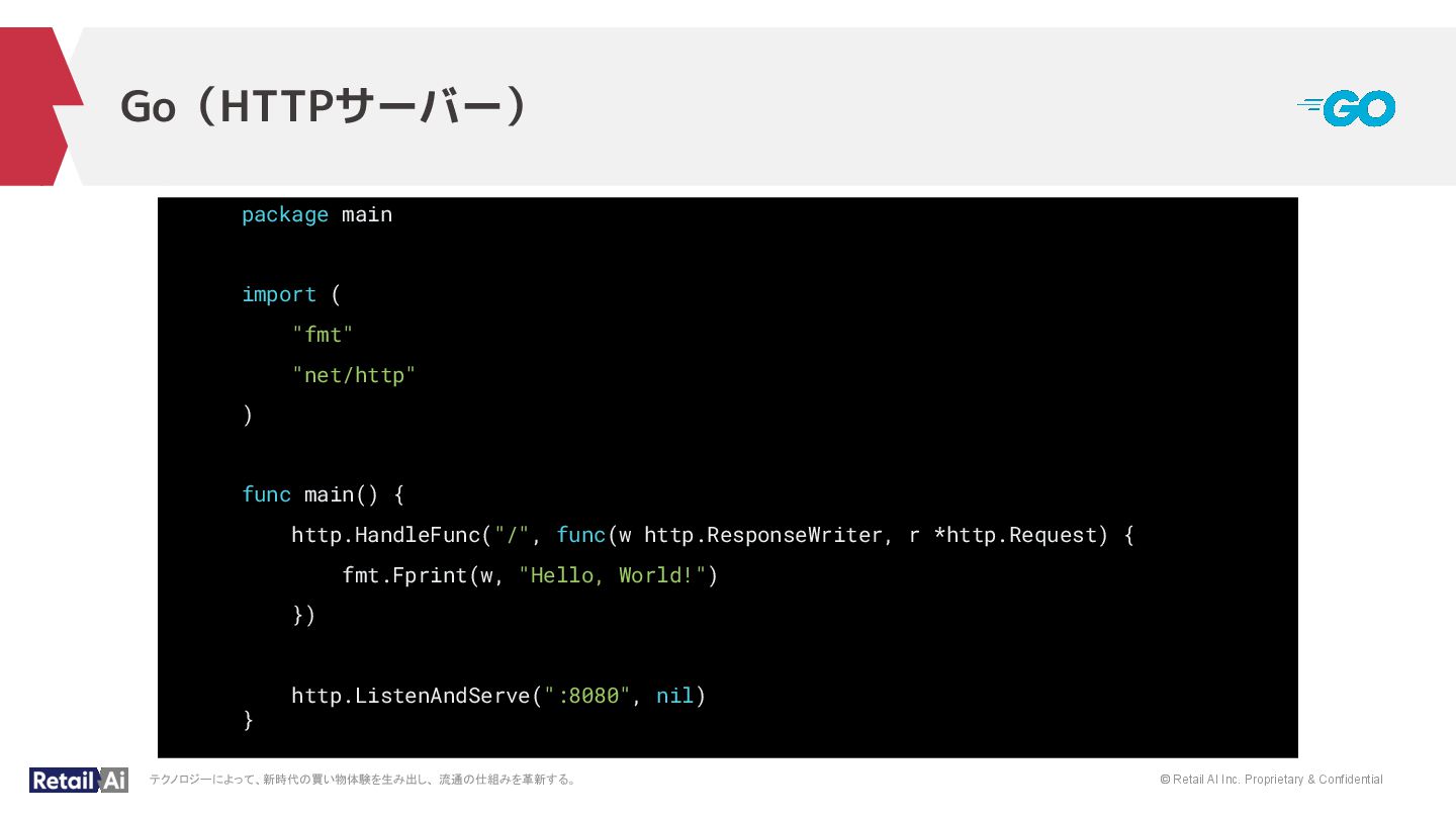 テクノロジーによって、新時代の買い物体験を生み出し、 流通の仕組みを革新する。 © Retail AI Inc. Proprietary & Confidential Go(HTTPサーバー)