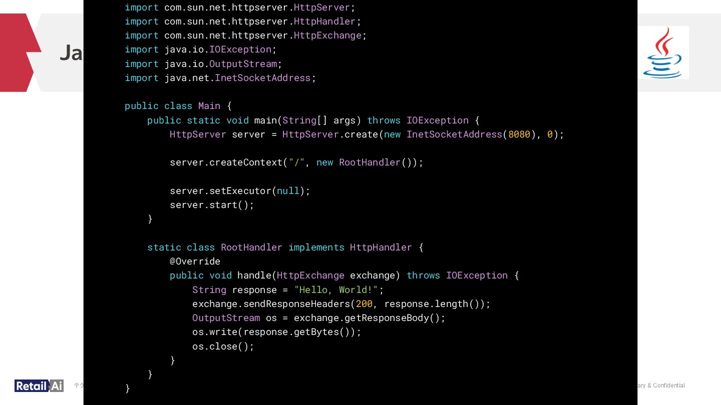 テクノロジーによって、新時代の買い物体験を生み出し、 流通の仕組みを革新する。 © Retail AI Inc. Proprietary & Confidential Java(HTTPサーバー)