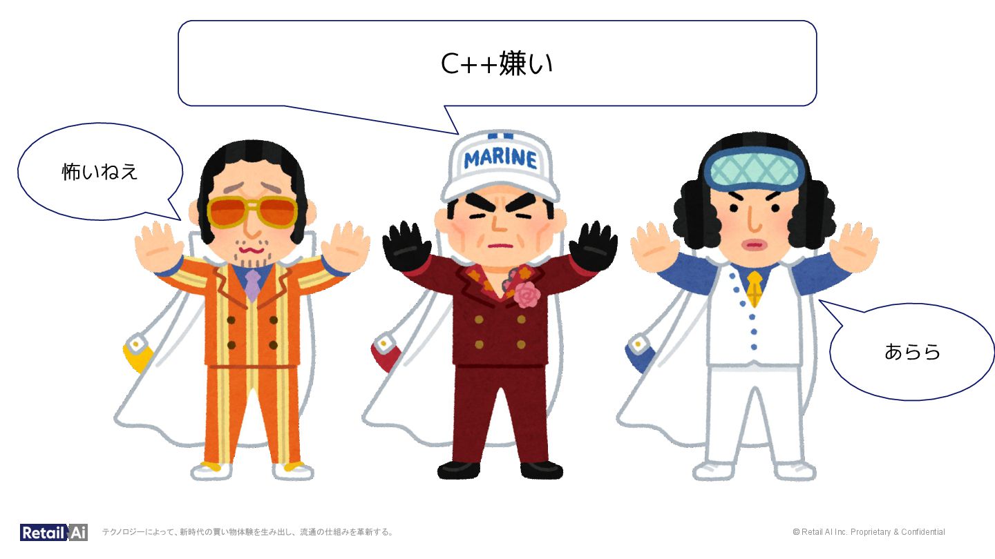 テクノロジーによって、新時代の買い物体験を生み出し、 流通の仕組みを革新する。 © Retail AI Inc. Proprietary & Confidential C++嫌い