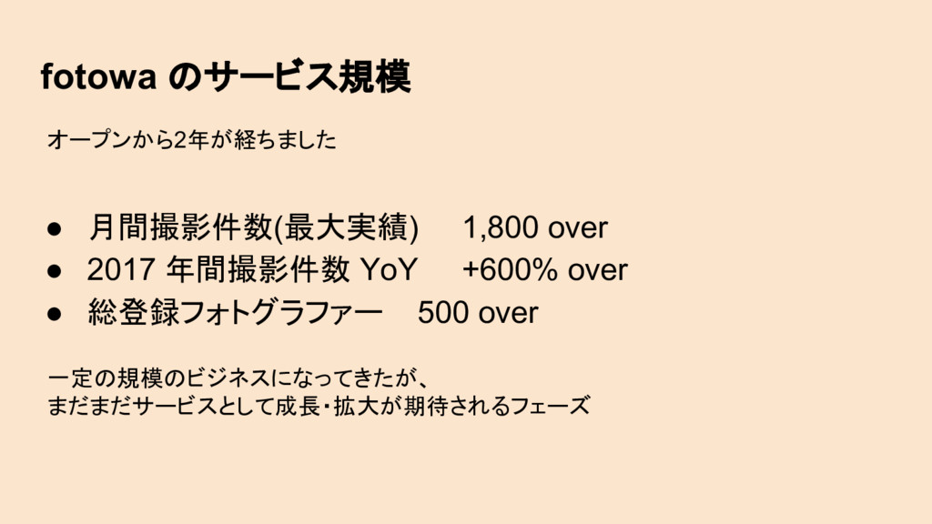 +600% over • 総登録フォトグラファー 500 over オープンから2年が経ちました 一定の規模のビジネスになってきたが、 まだまだサービスとして成長・拡大が期待されるフェーズ