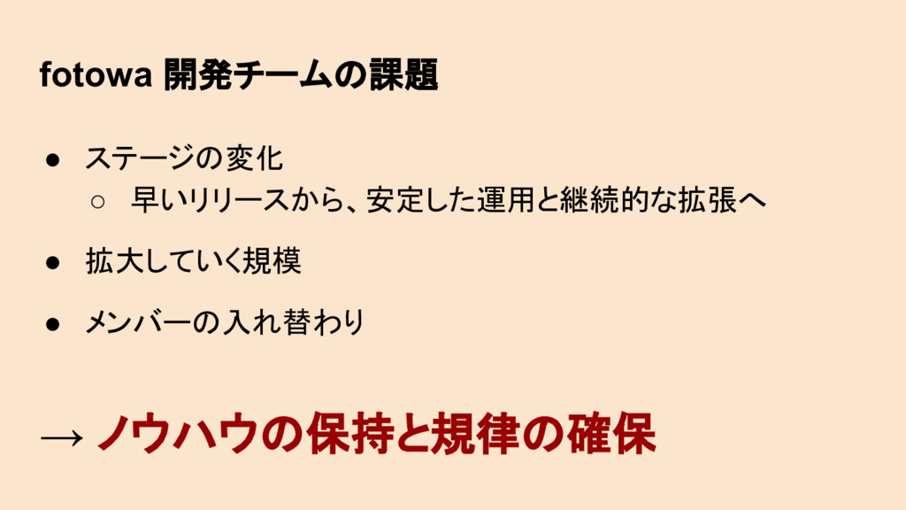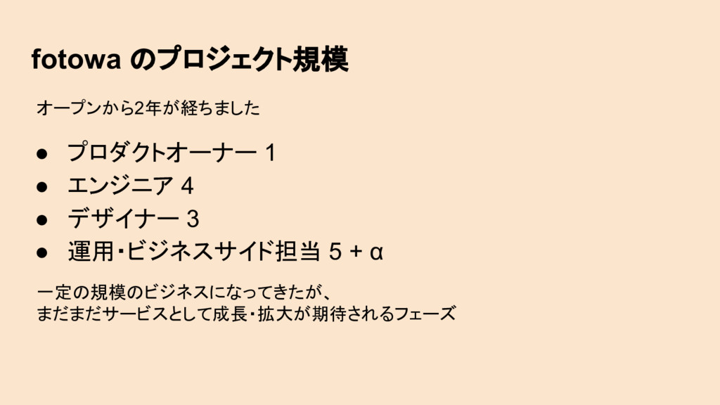 fotowa 開発チームの課題 • ステージの変化 ◦ 早いリリースから、安定した運用と継続的な拡張へ • 拡大していく規模 • メンバーの入れ替わり