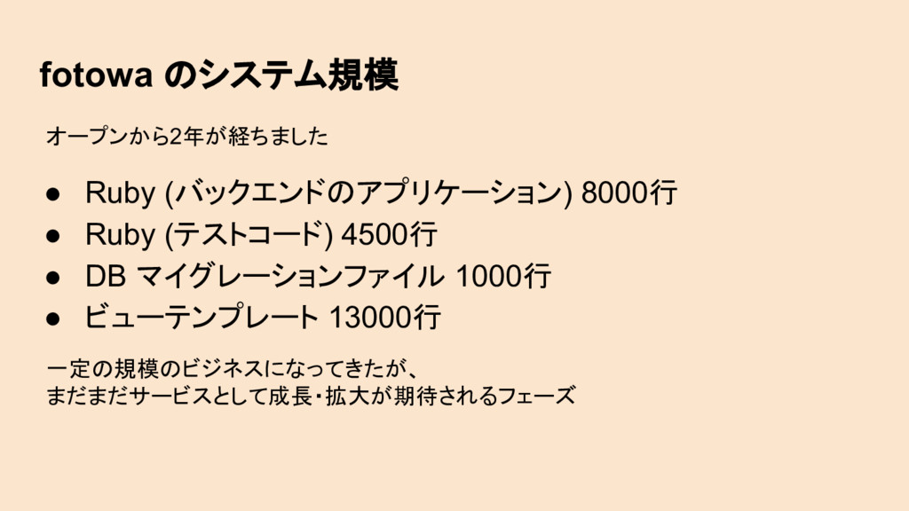 fotowa のシステム規模 • Ruby (バックエンドのアプリケーション) 8000行 • Ruby (テストコード) 4500行