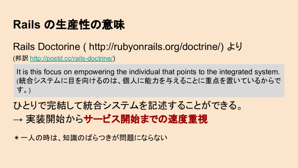 Rails の生産性の意味 Rails Doctorine ( http://rubyonrails.org/doctrine/) より (邦訳 http://postd.cc/rails-doctrine/) ひとりで完結して統合システムを記述することができる。