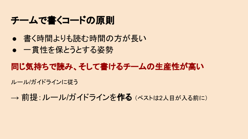 チームで書くコードの原則 • 書く時間よりも読む時間の方が長い • 一貫性を保とうとする姿勢 同じ気持ちで読み、そして書けるチームの生産性が高い ルール/ガイドラインに従う → 前提:ルール/ガイドラインを作る (ベストは2人目が入る前に)