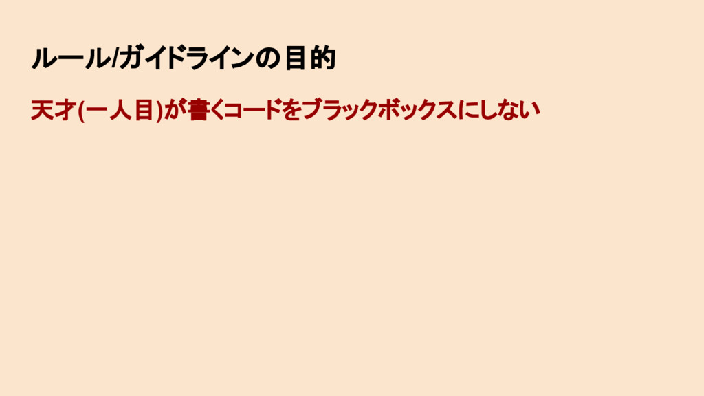 ルール/ガイドラインの目的 天才(一人目)が書くコードをブラックボックスにしない